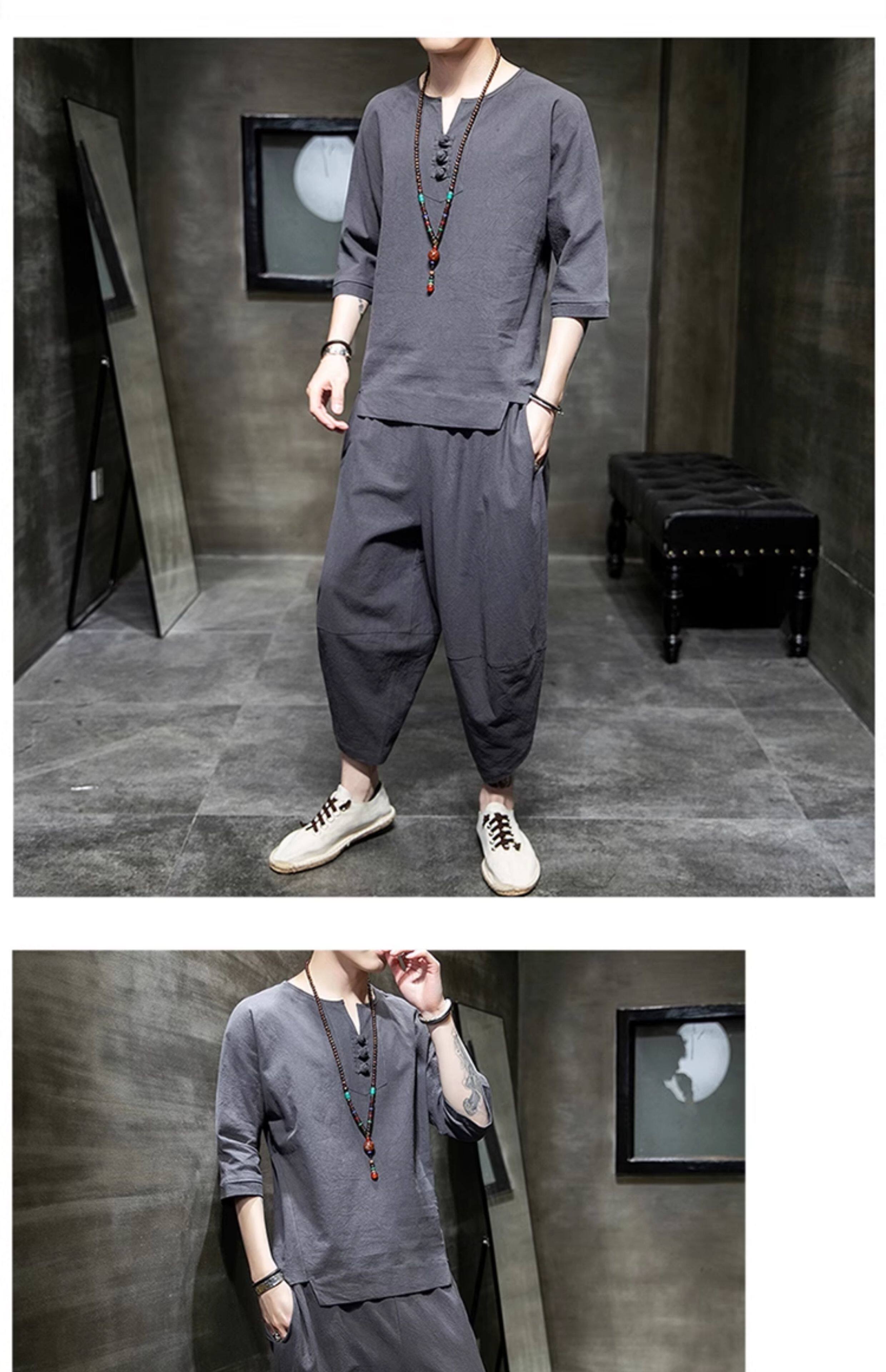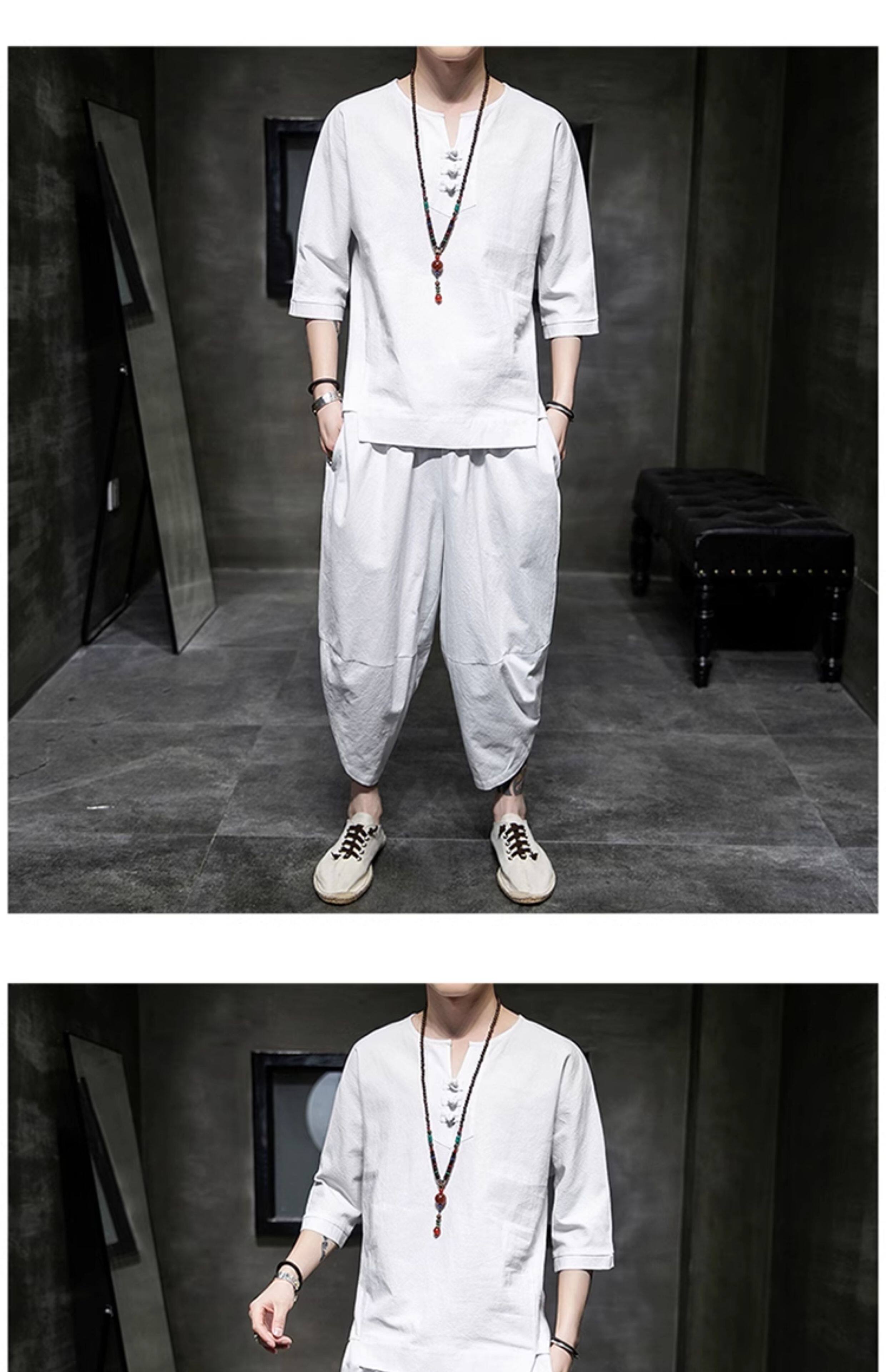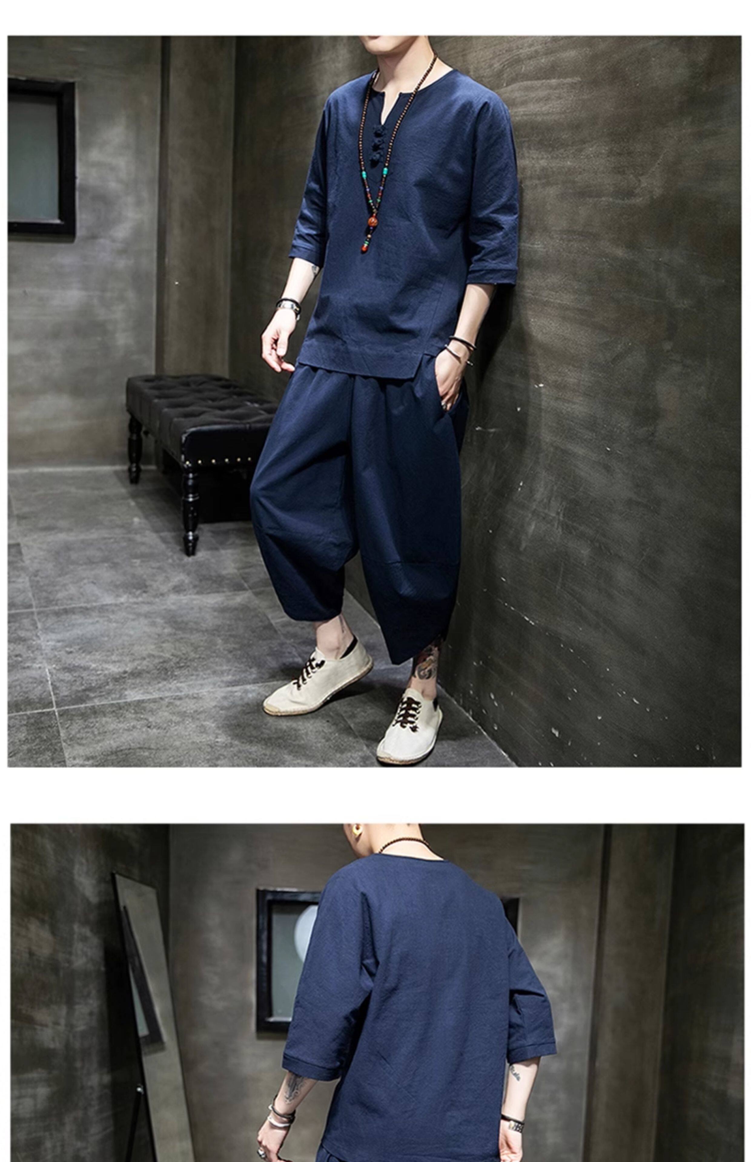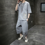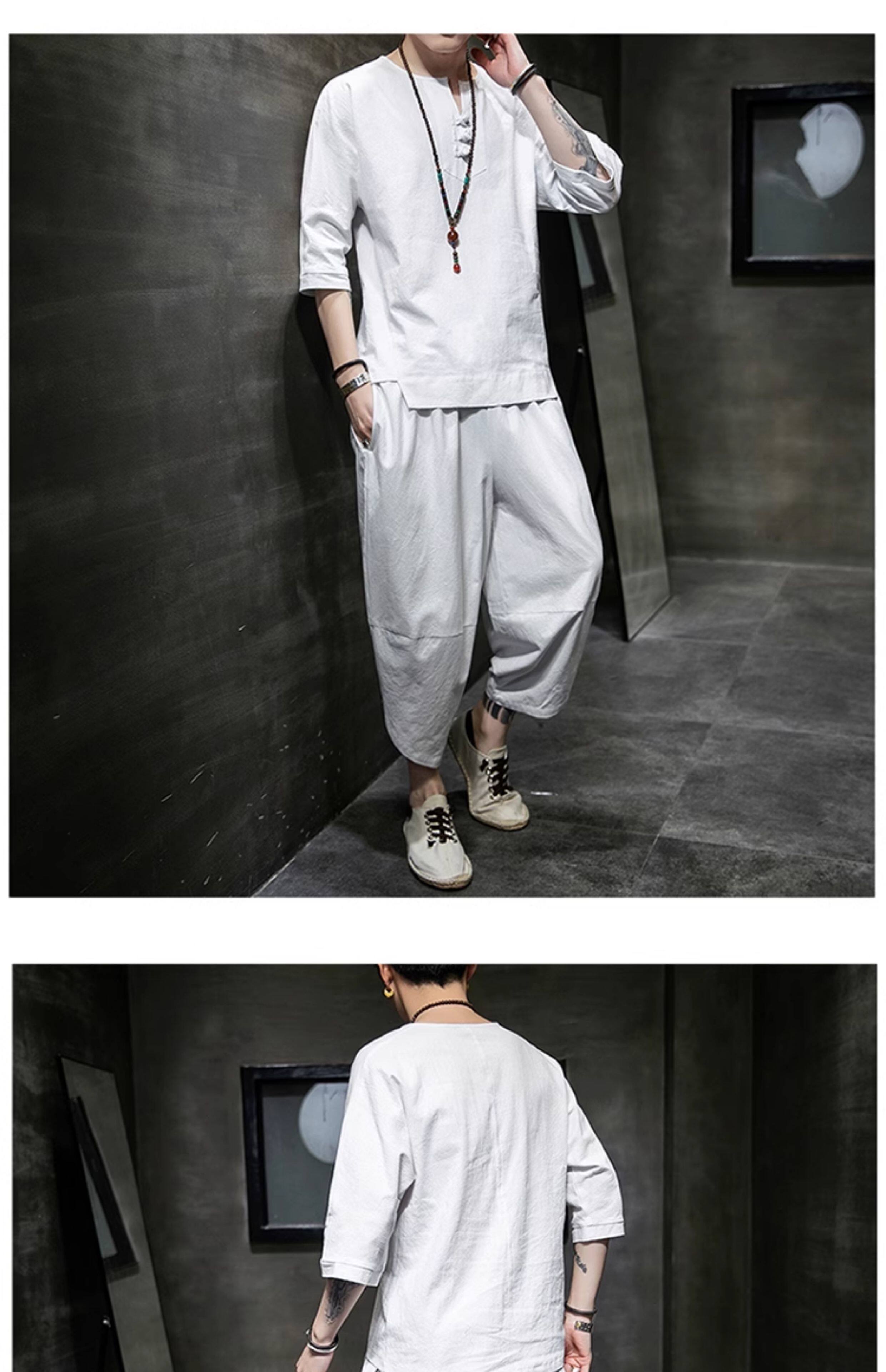 Футболка, летний комплект, китайский стиль, из хлопка и льна, короткий рукав