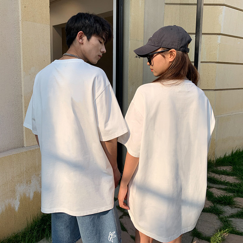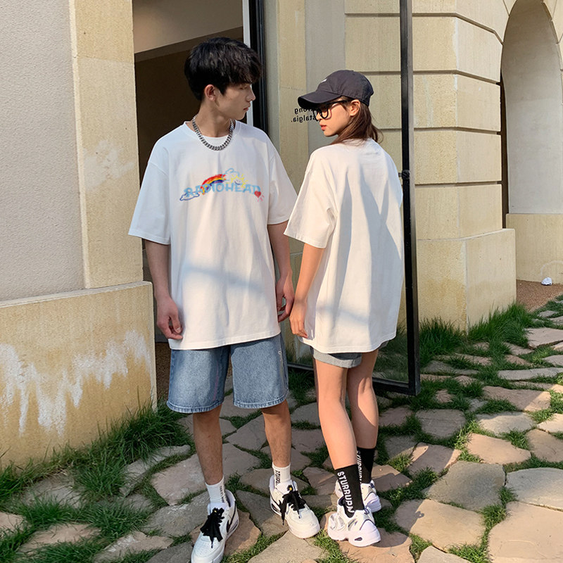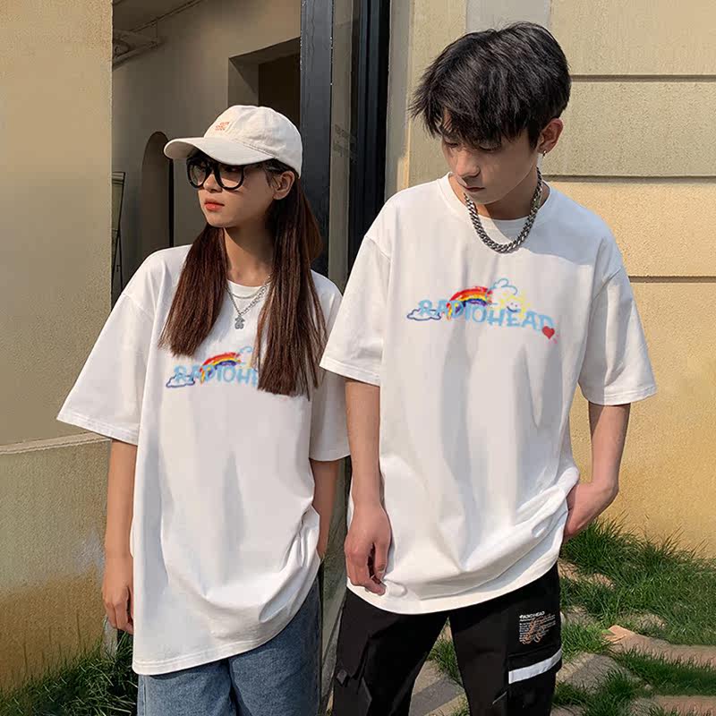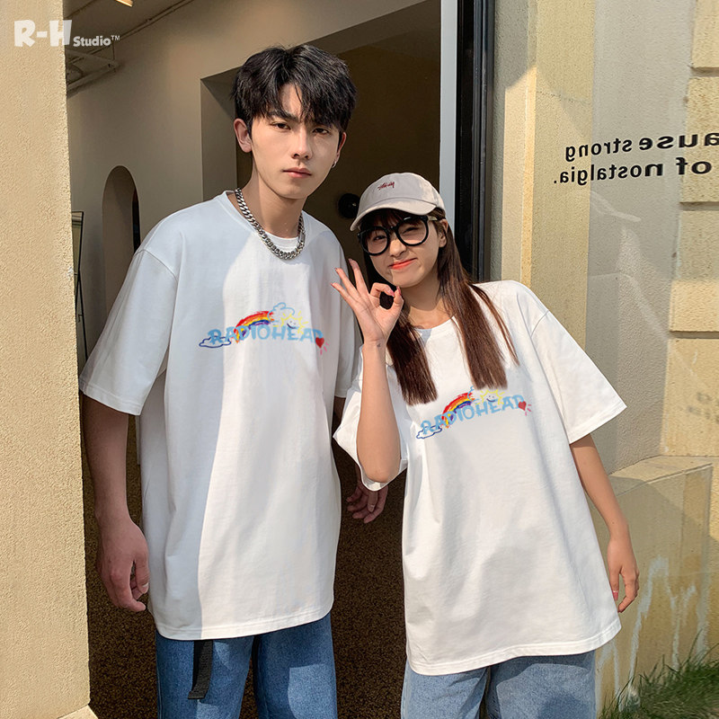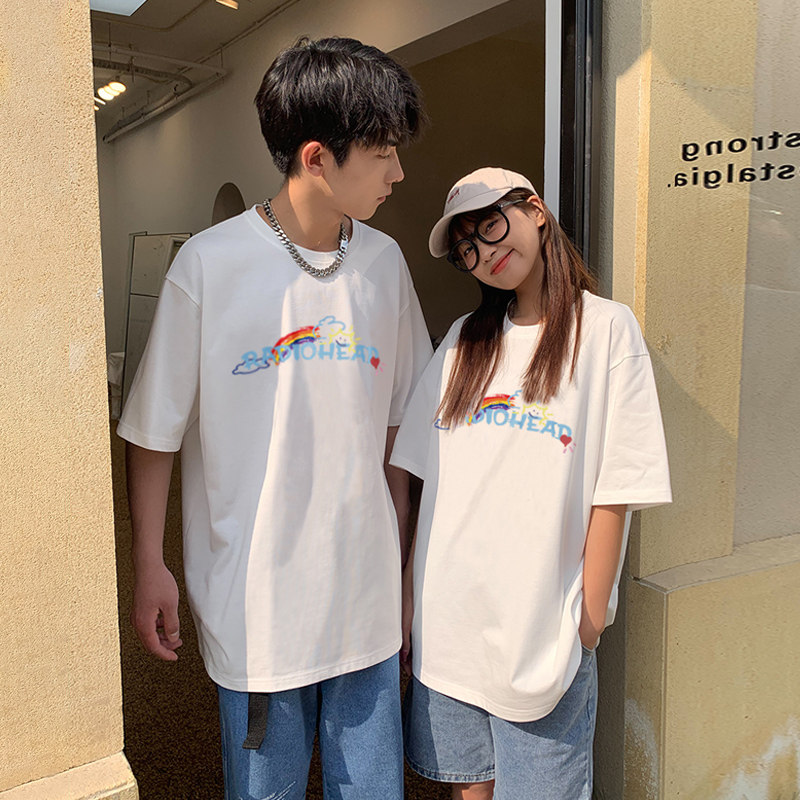 Белая хлопковая радужная футболка, летняя тонкая парная одежда с круглым воротником, в корейском стиле, принт, короткий рукав, для влюбленных