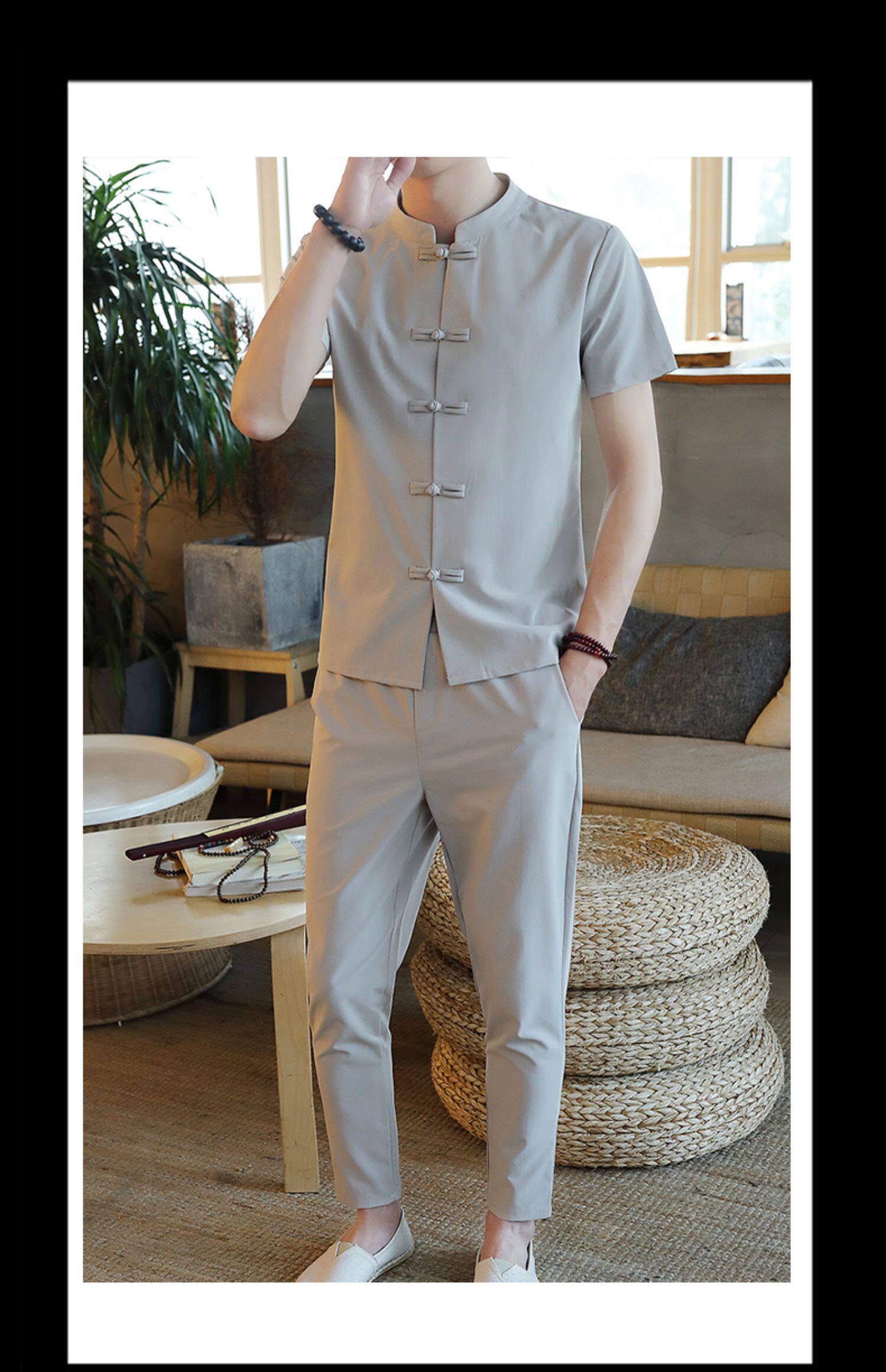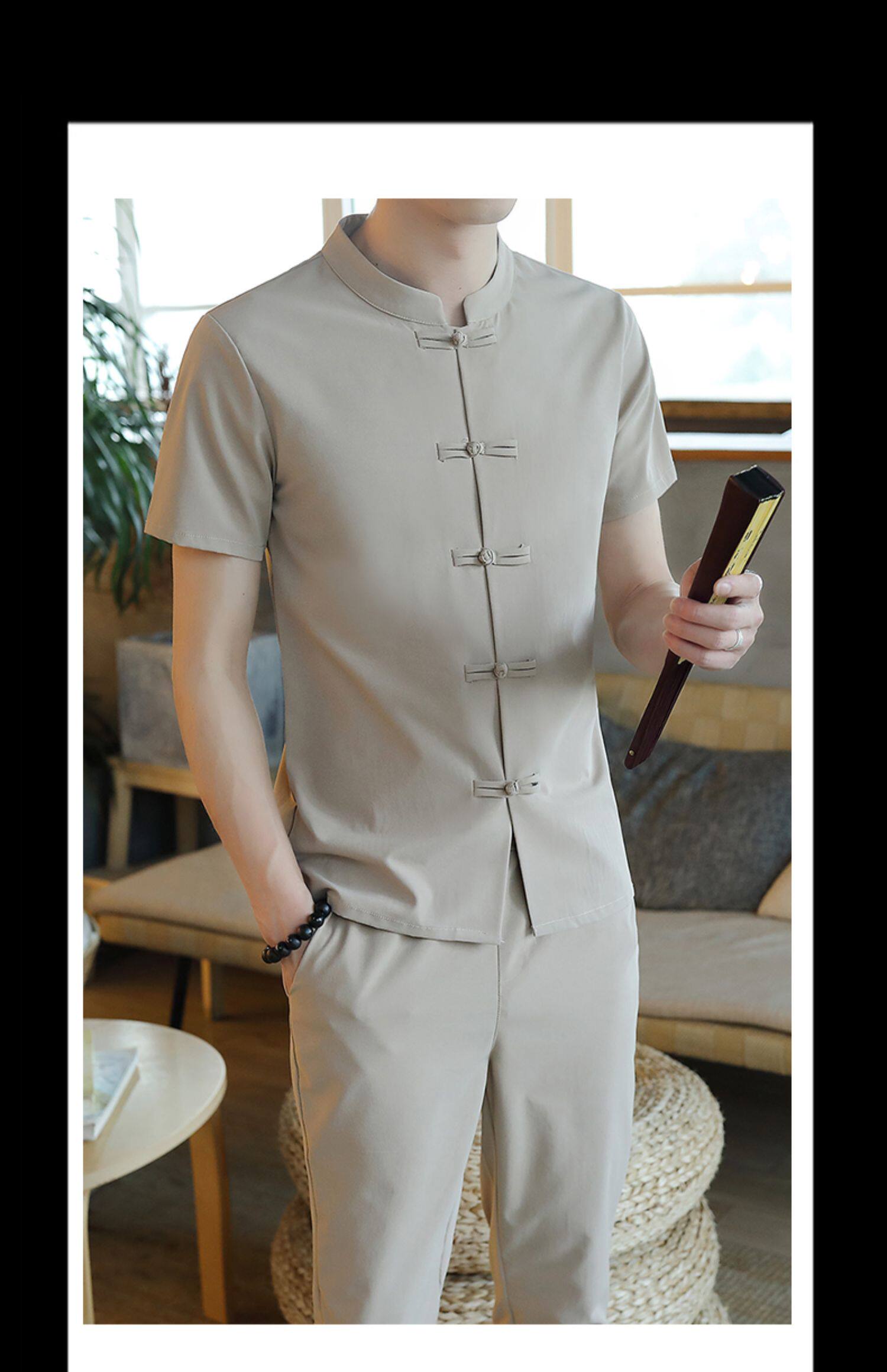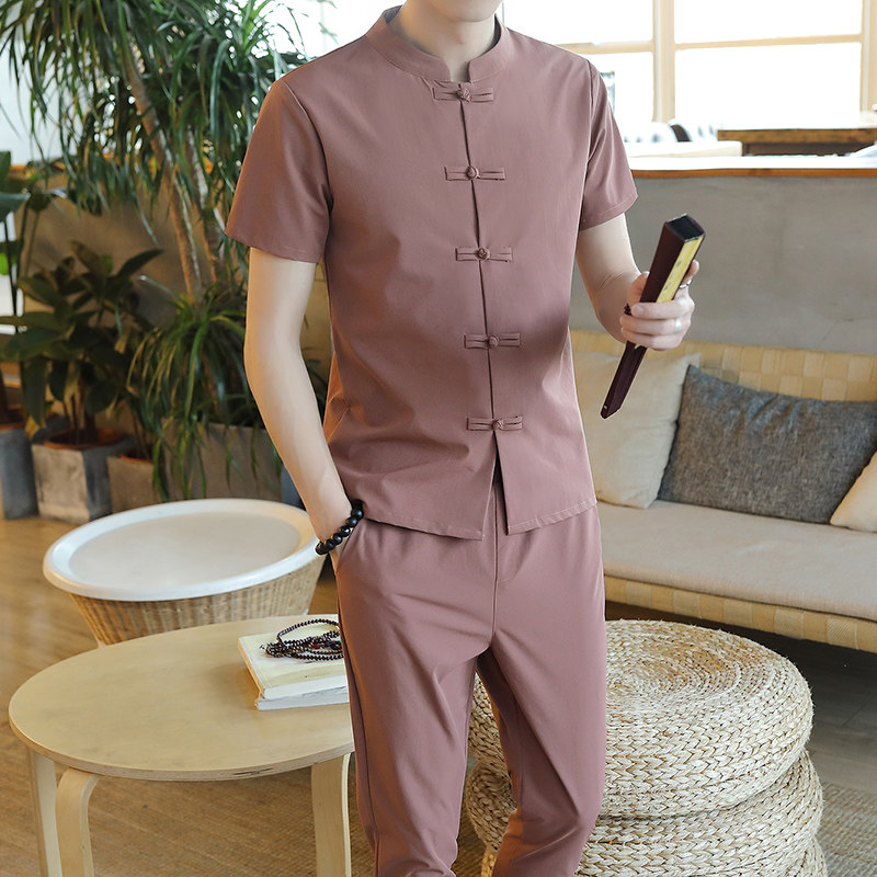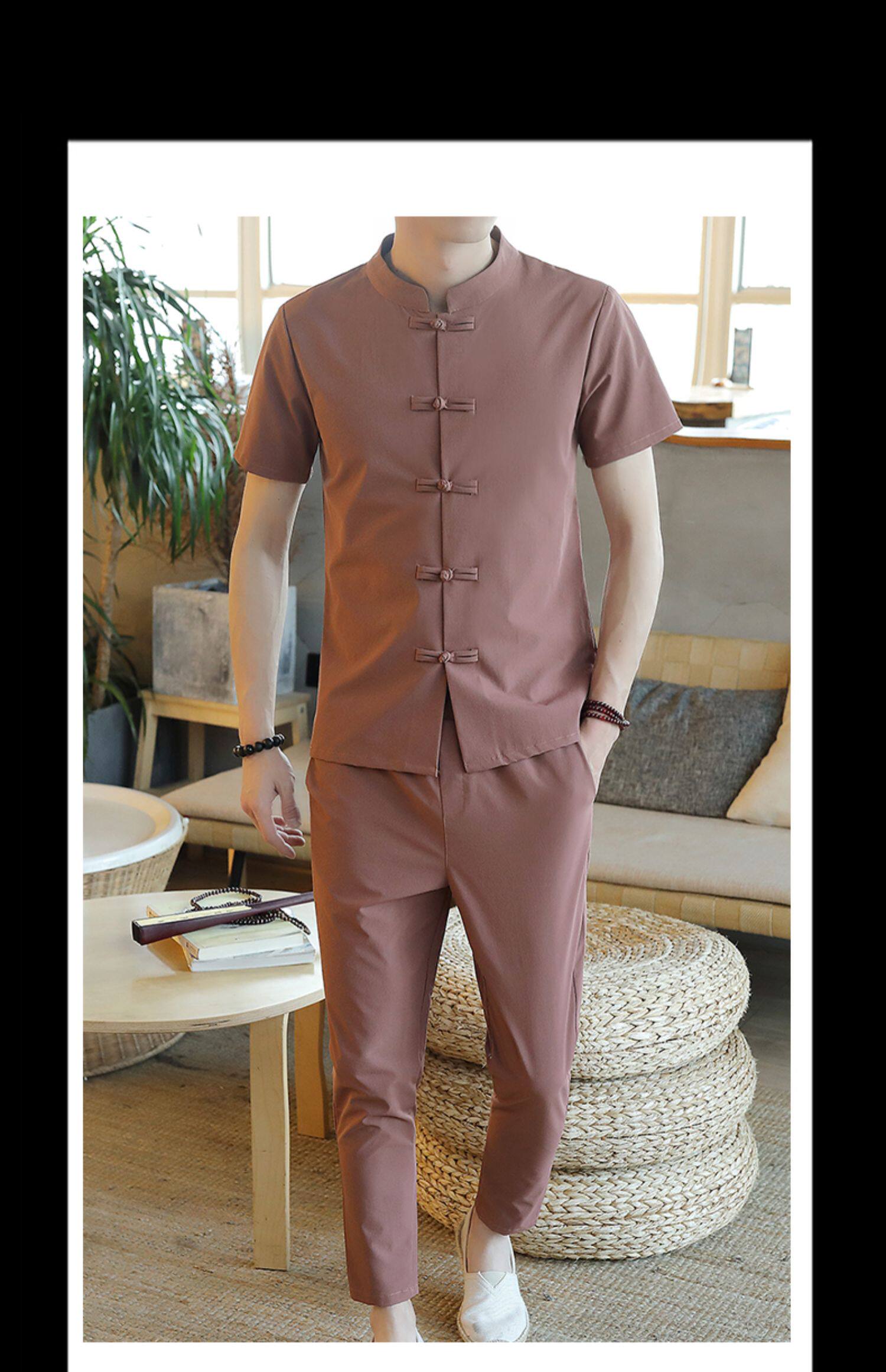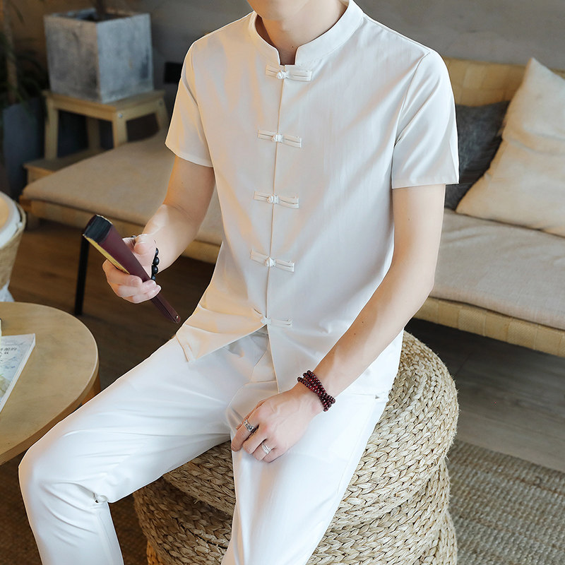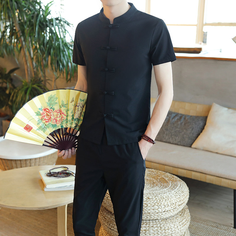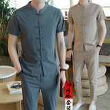 Летняя футболка с коротким рукавом, шелковый ретро комплект, китайский стиль, из хлопка и льна