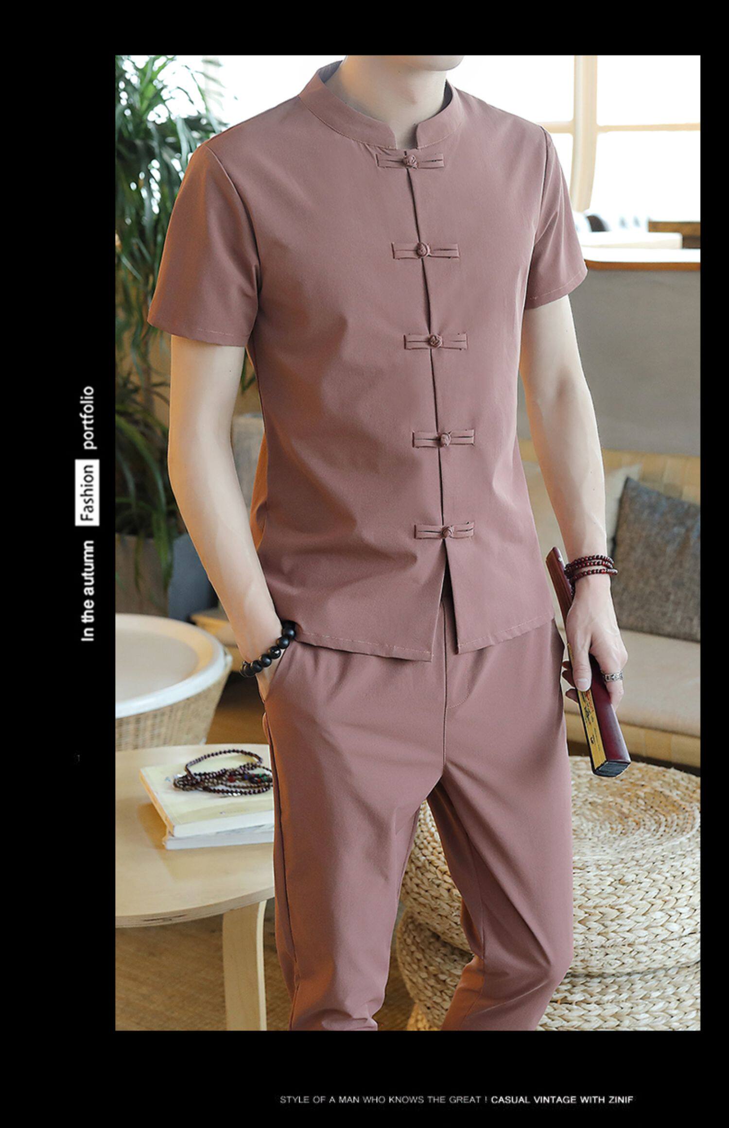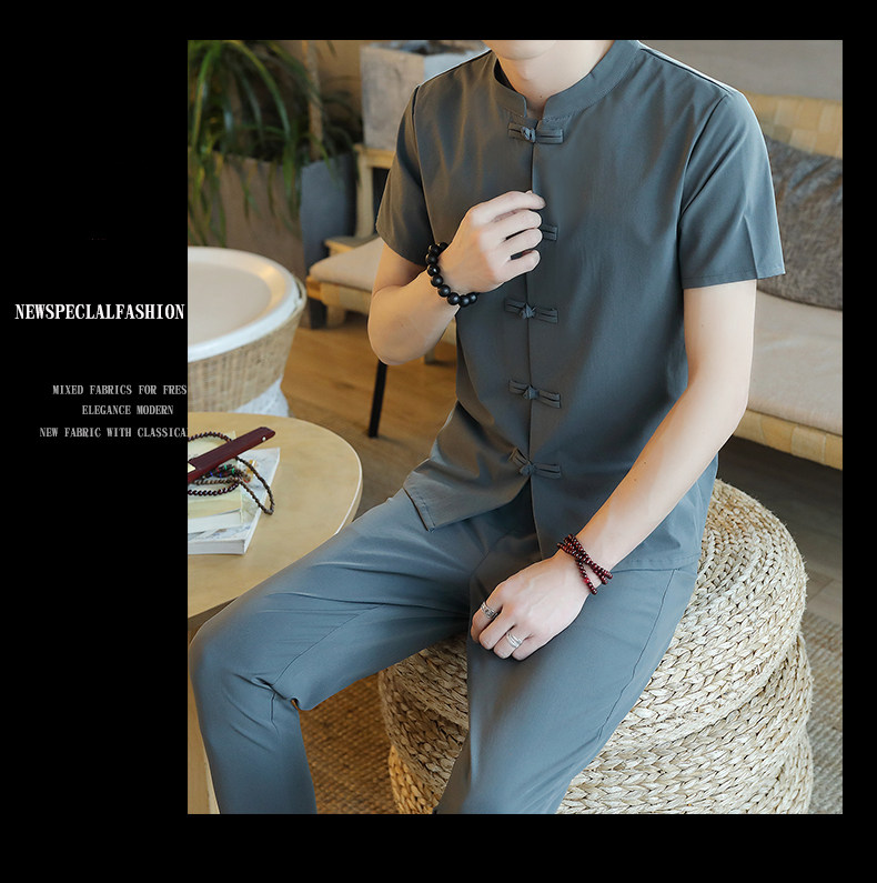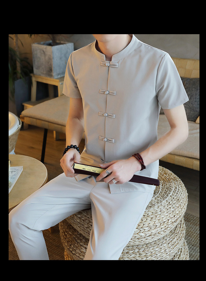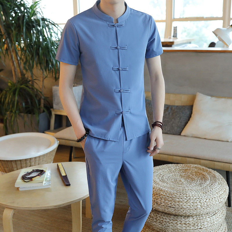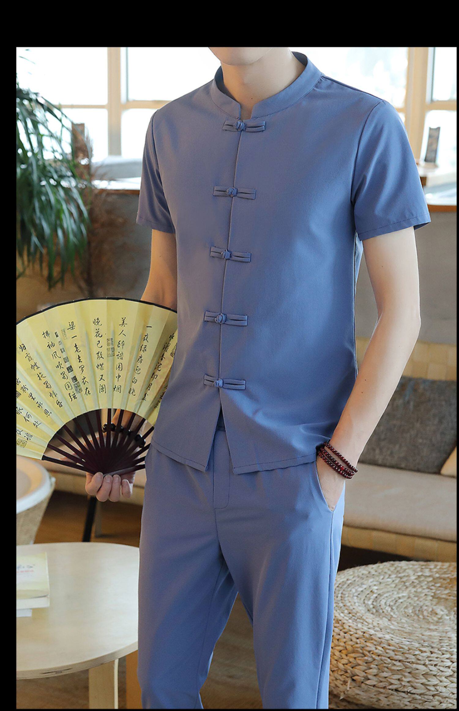 Летняя футболка с коротким рукавом, шелковый ретро комплект, китайский стиль, из хлопка и льна