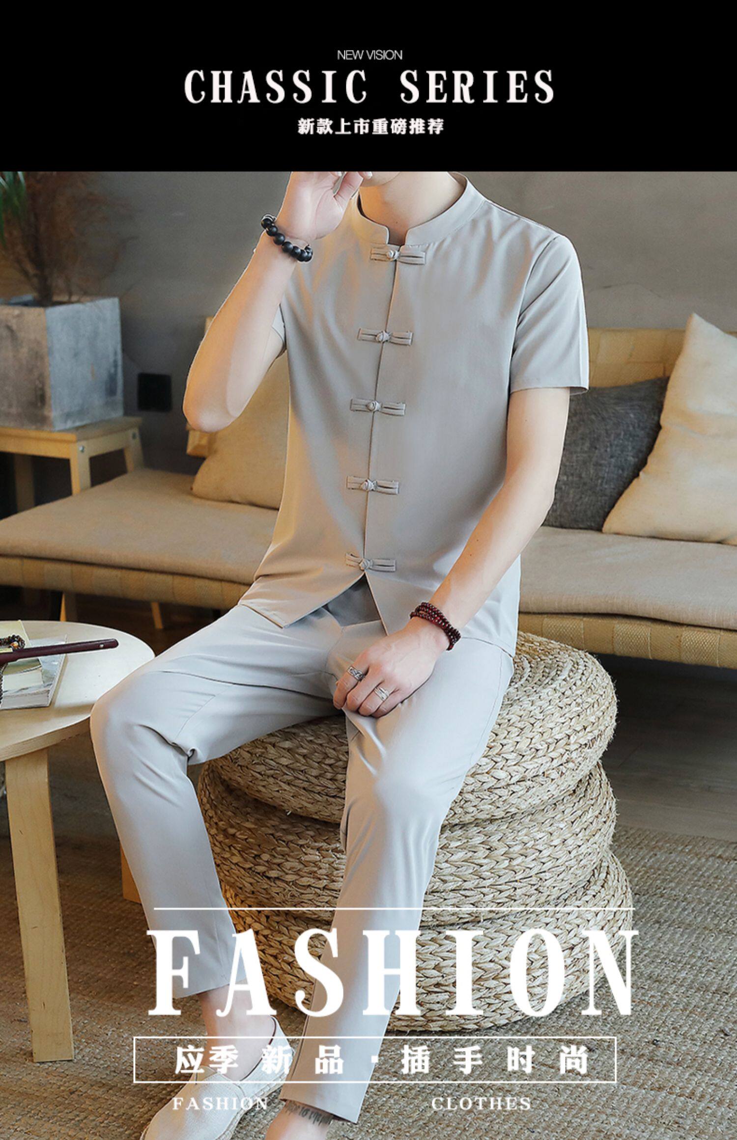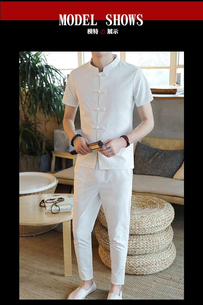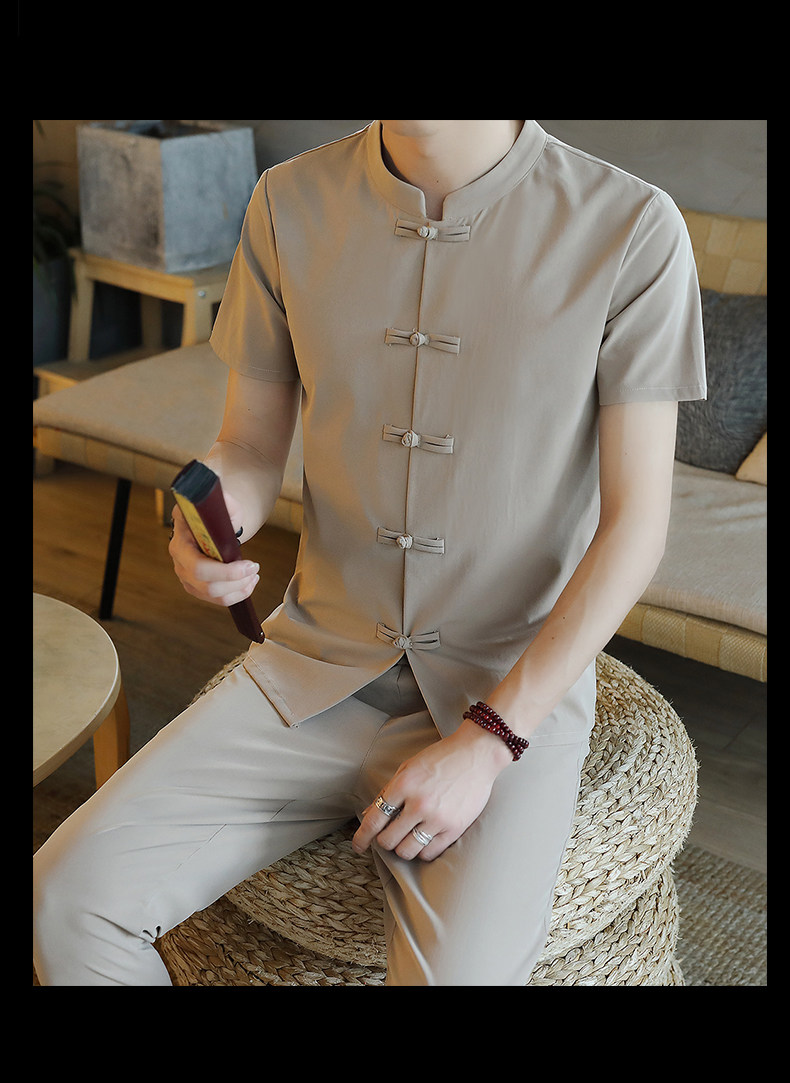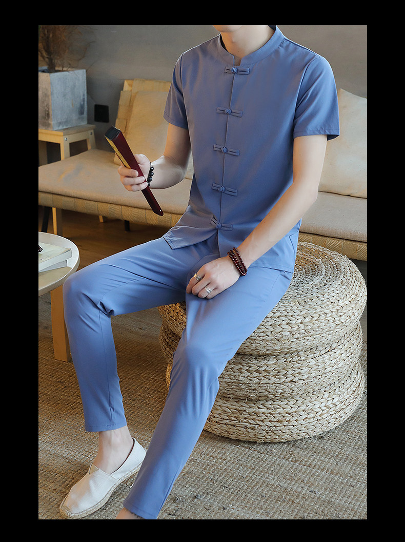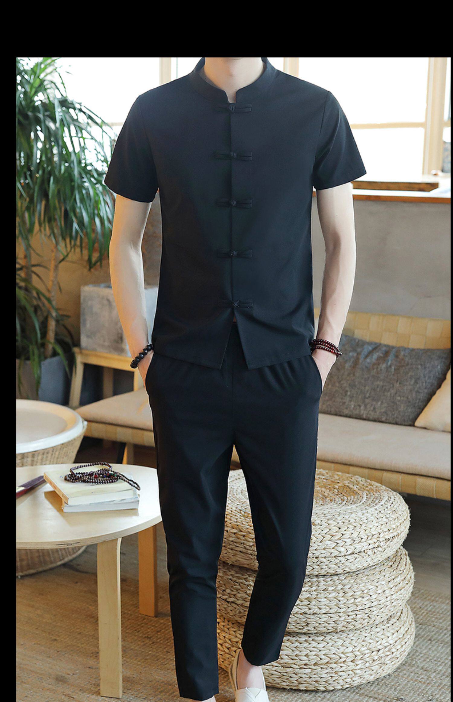 Летняя футболка с коротким рукавом, шелковый ретро комплект, китайский стиль, из хлопка и льна