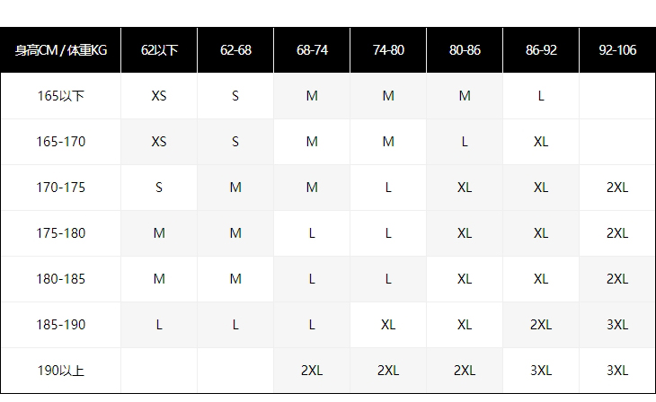 | Размер: | 165/88A/XS, 170/92A/S, 175/96A/M, 180/100A/L, 185/104A/XL, 190/108A/XXL, 195/112A/XXXL |