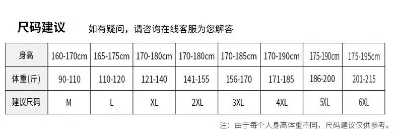| Размер: | M рекомендуется [90-110 Catties], L рекомендуется [110-120 Catties], XL рекомендует [121-140 Catties], 2xl рекомендуется [141-155 Catties], 3xl рекомендуется [156-170 Catties], 4xl рекомендуется [171-185 Catties], 5xl рекомендуется [186-200 Catties], 6xl рекомендуется [201-215 Catties] |