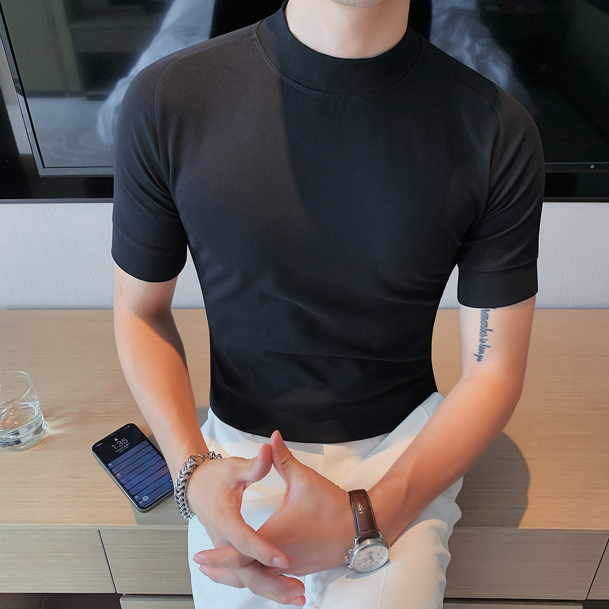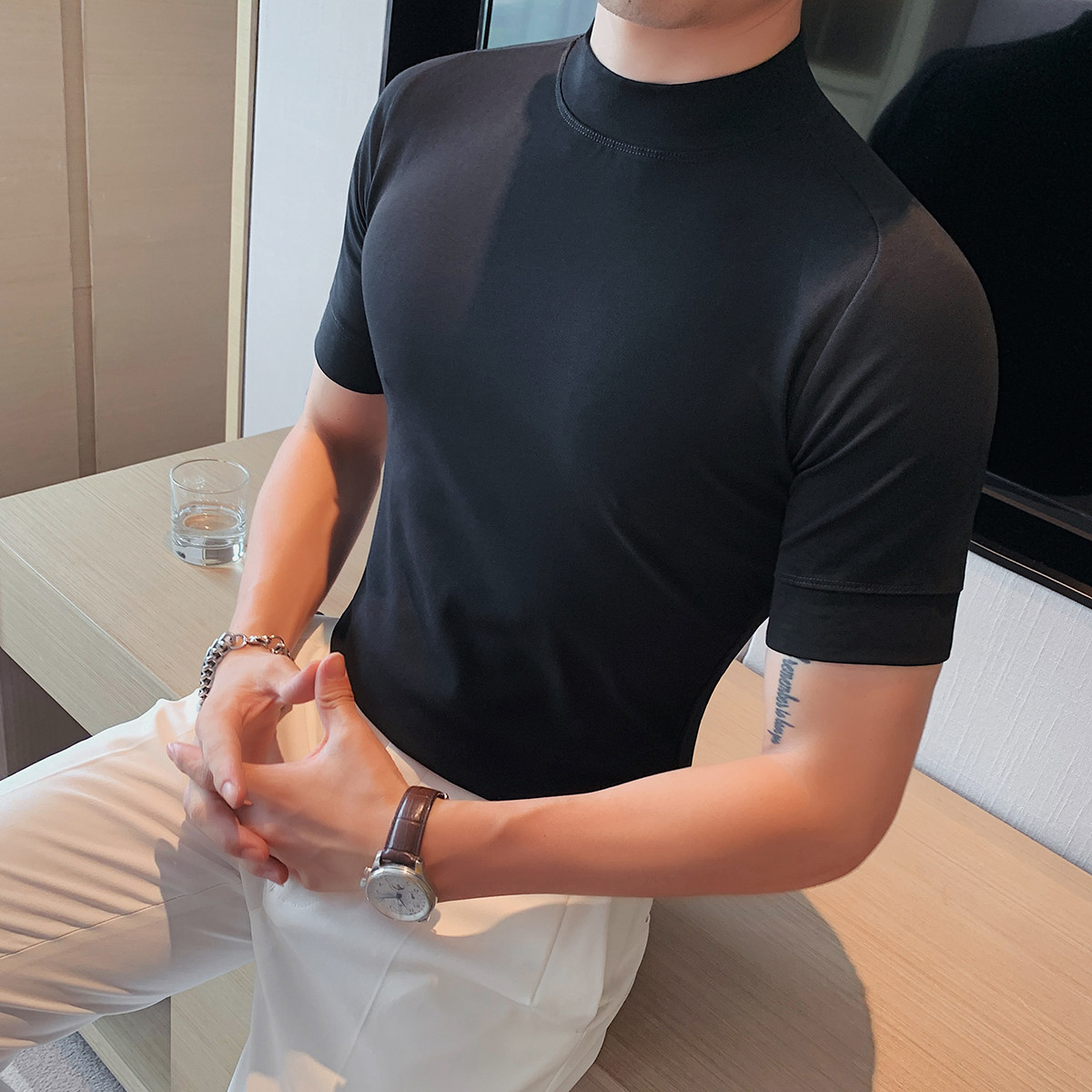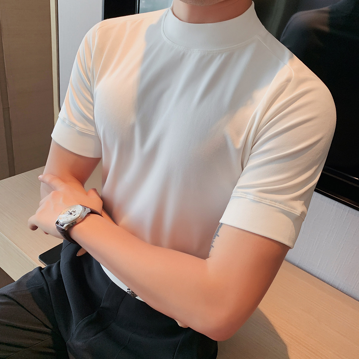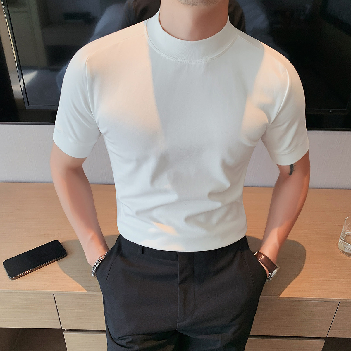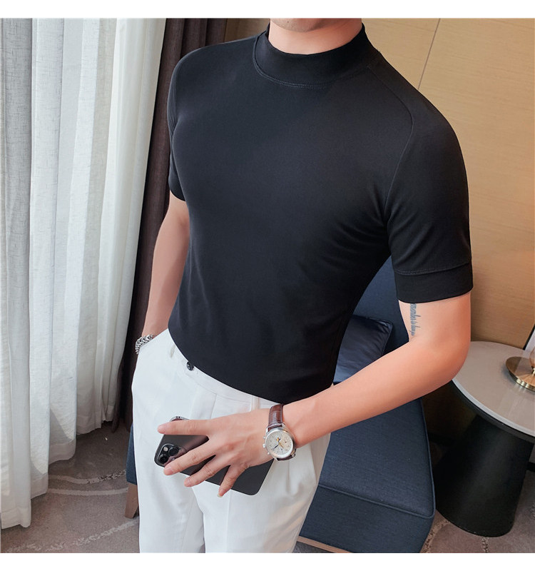 Бархатная футболка, осенняя однотонная базовая трендовая утепленный лонгслив, высокий воротник, изысканный стиль, облегающий крой, короткий рукав