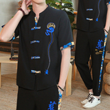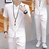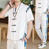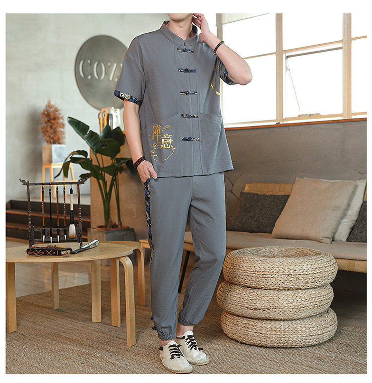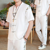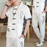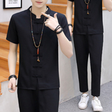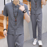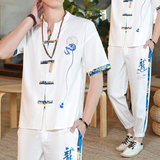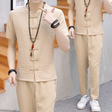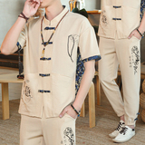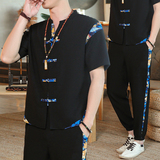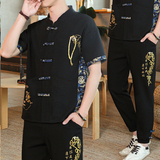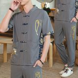 Мужской летний тонкий комплект, шелковая ретро футболка, ханьфу, китайский стиль