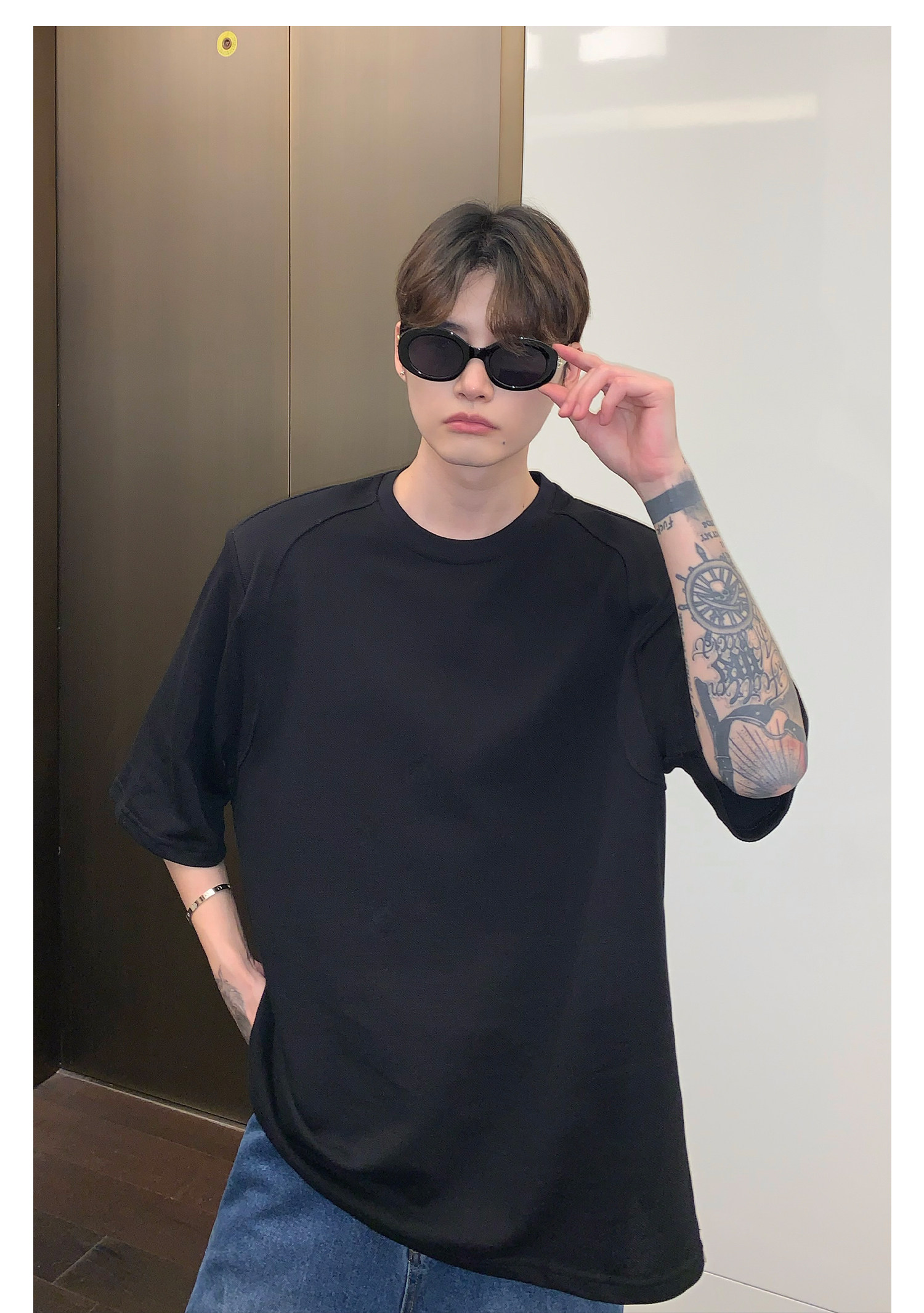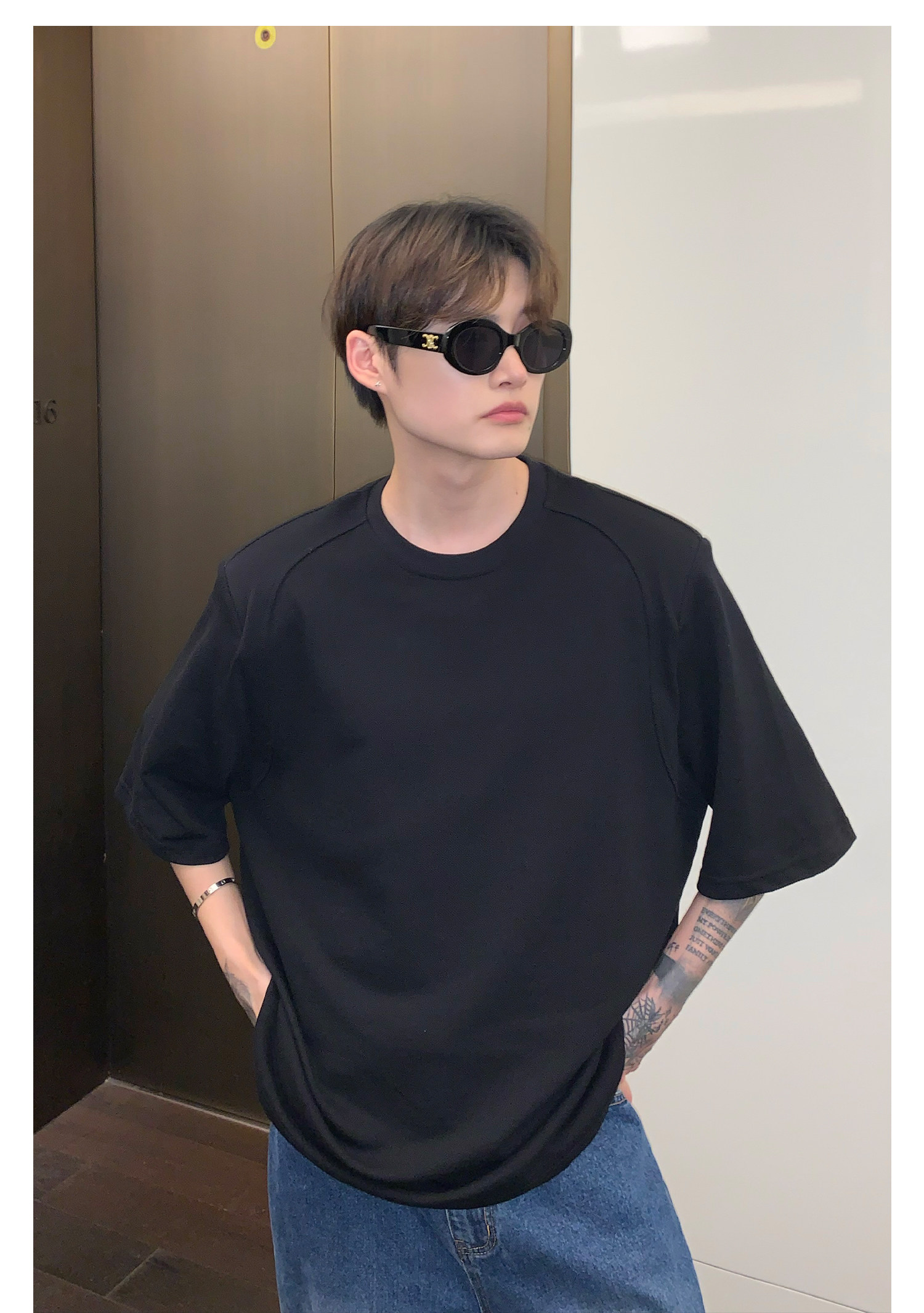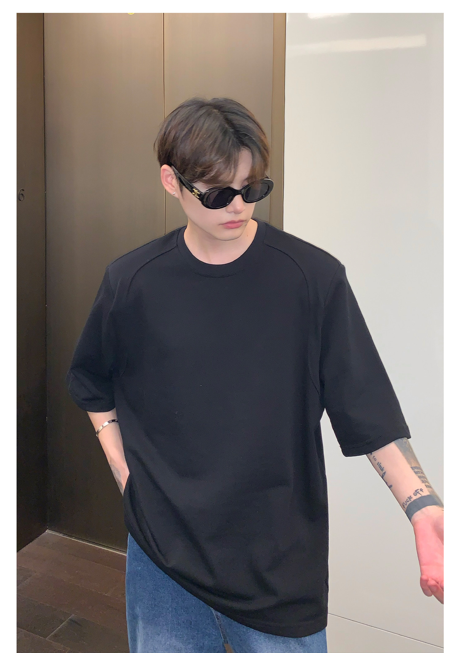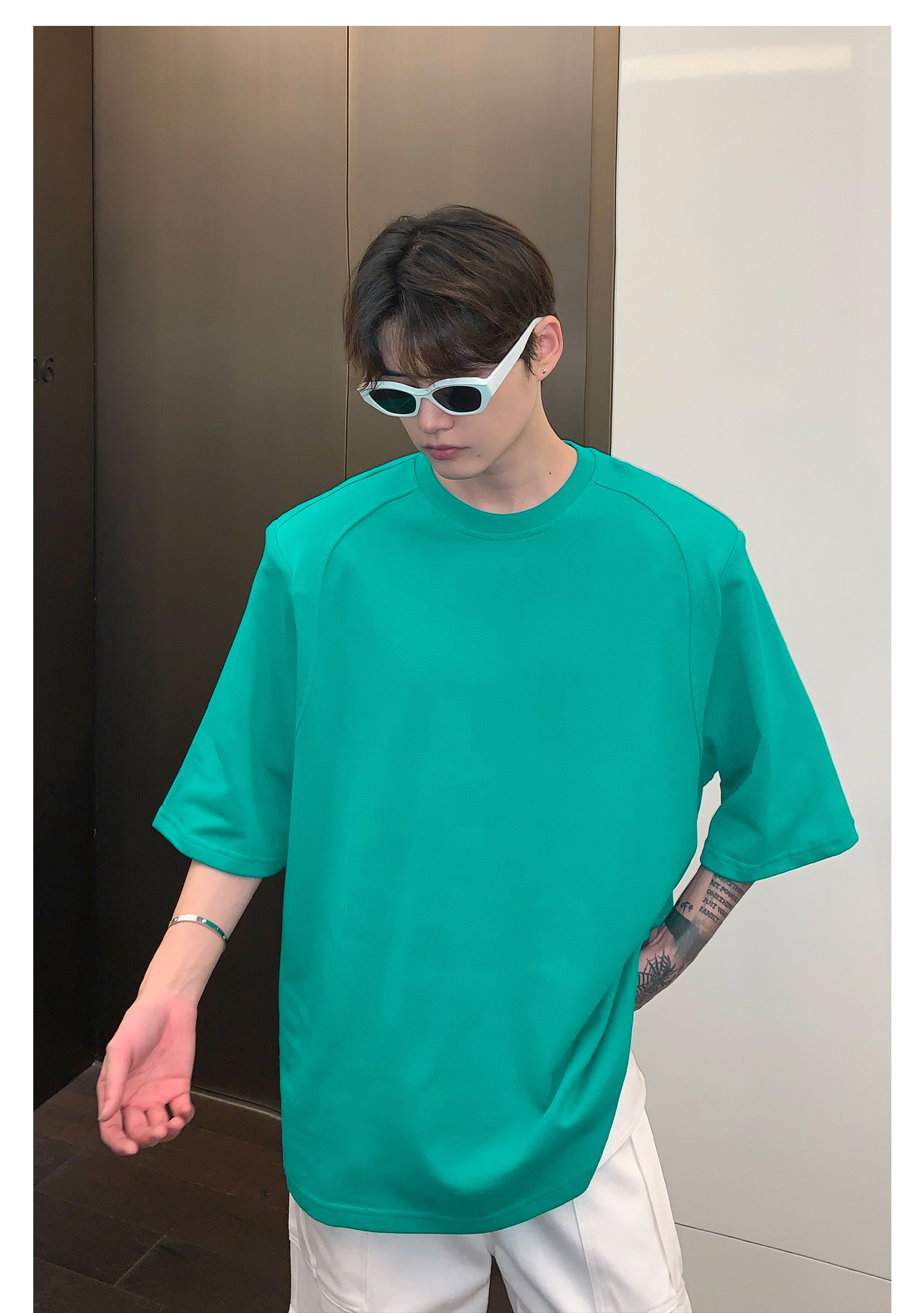 Наплечники, универсальная футболка с коротким рукавом с круглым воротником, в корейском стиле, простой и элегантный дизайн, оверсайз