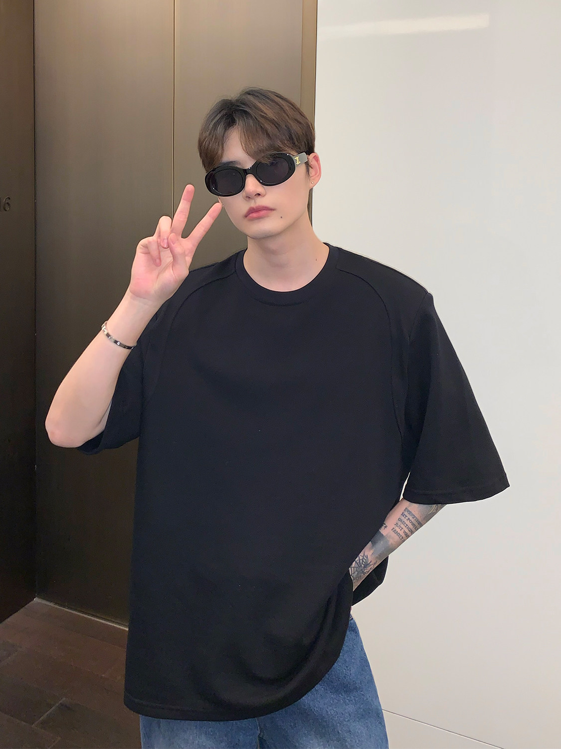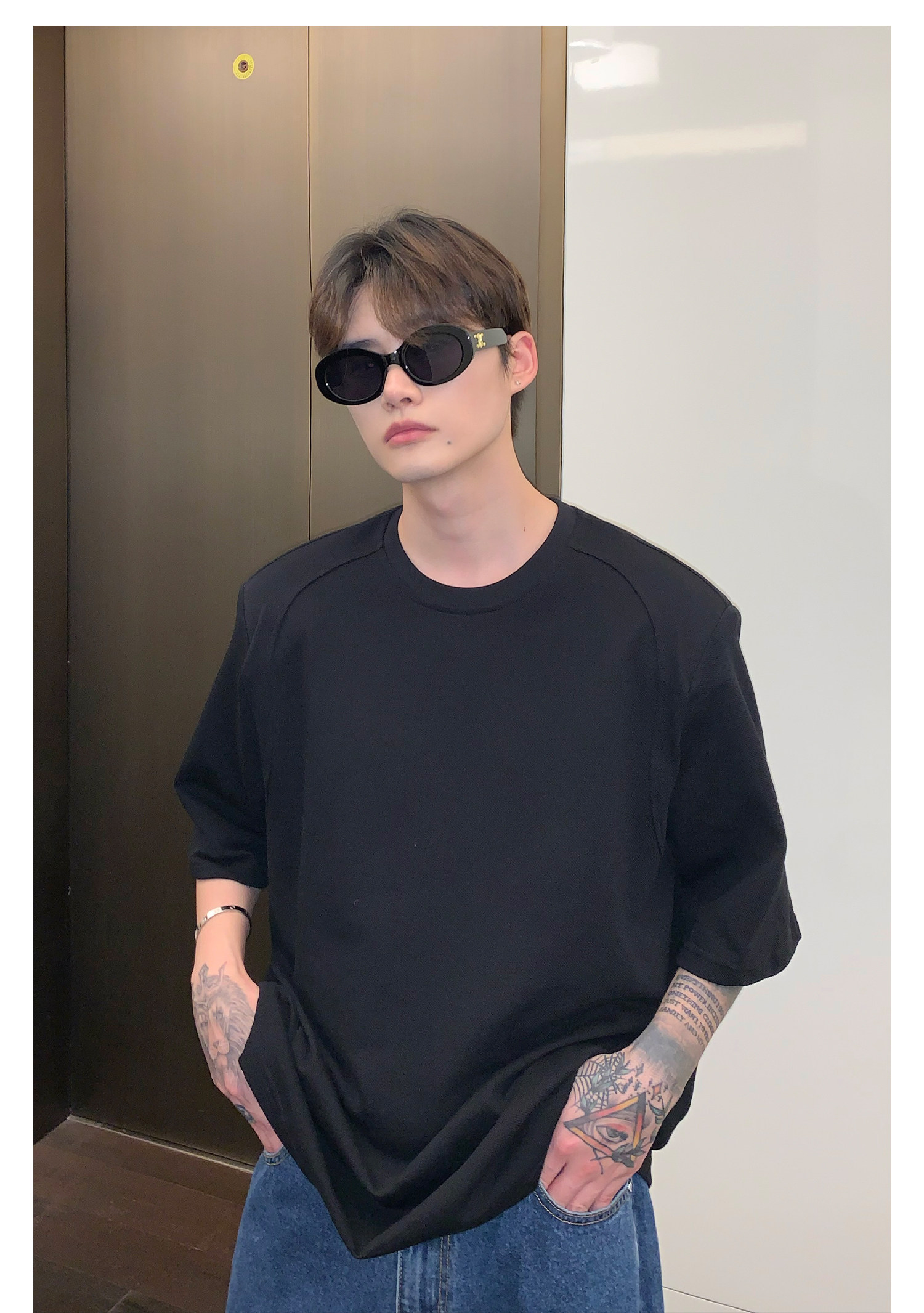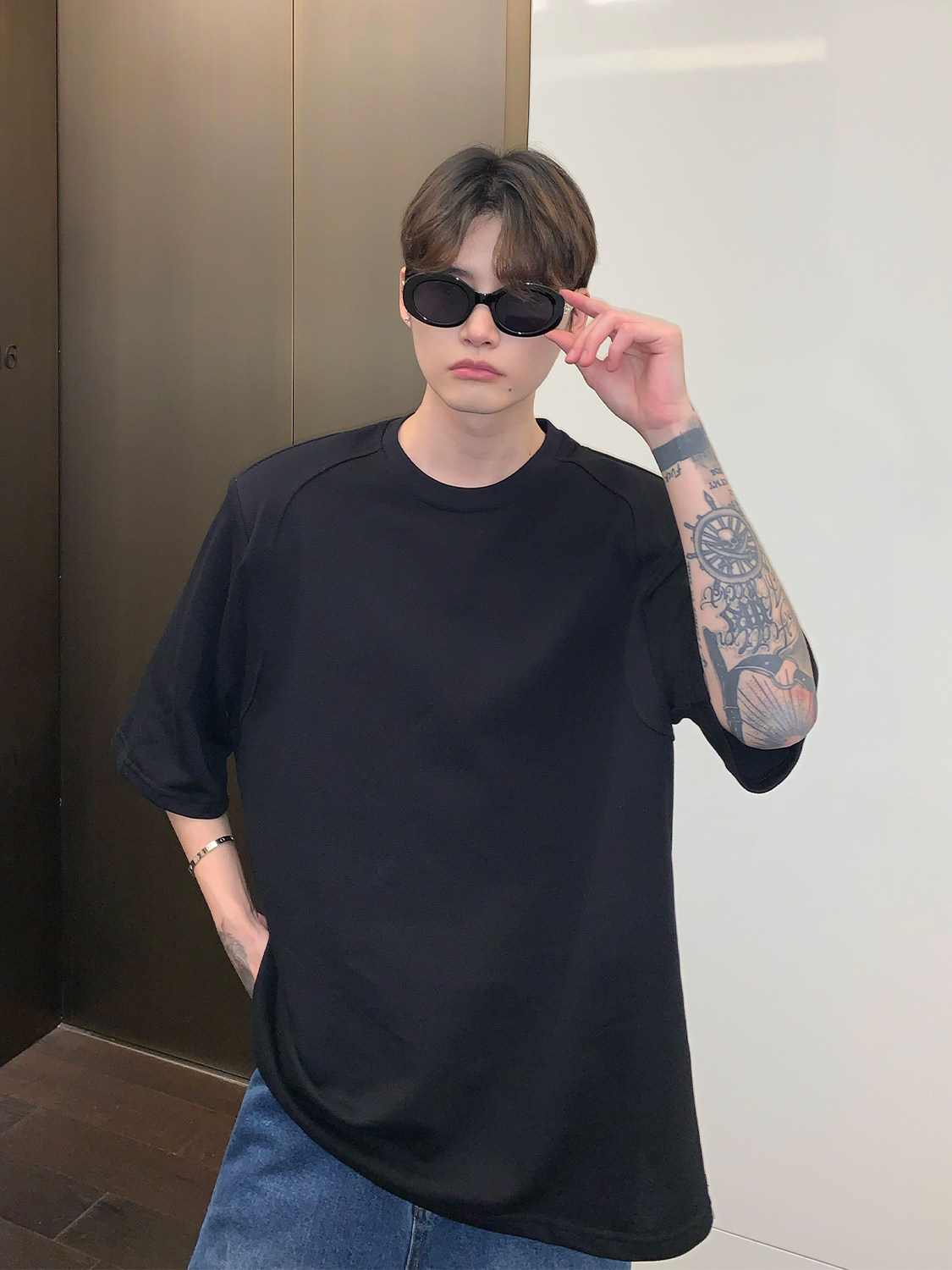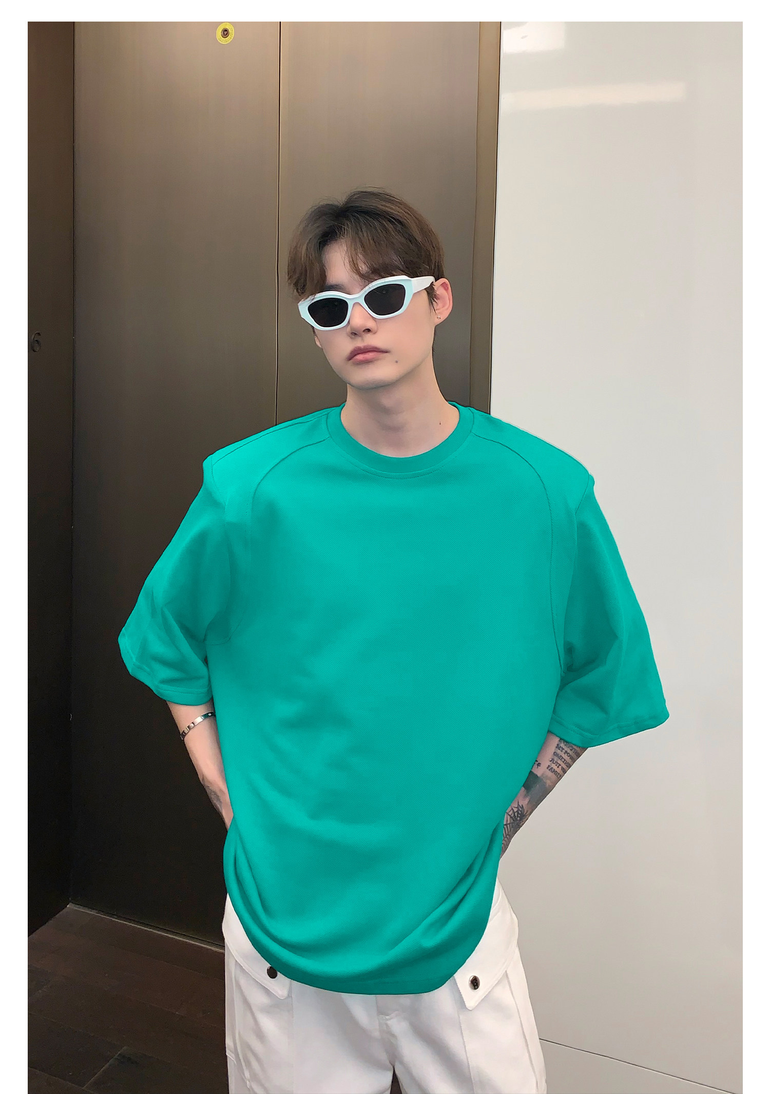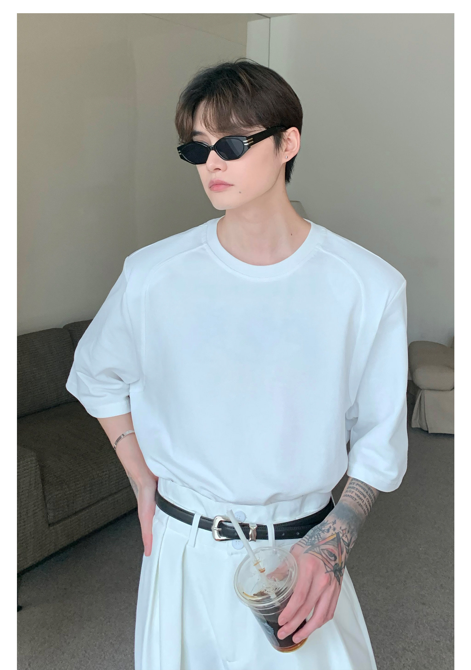 Наплечники, универсальная футболка с коротким рукавом с круглым воротником, в корейском стиле, простой и элегантный дизайн, оверсайз