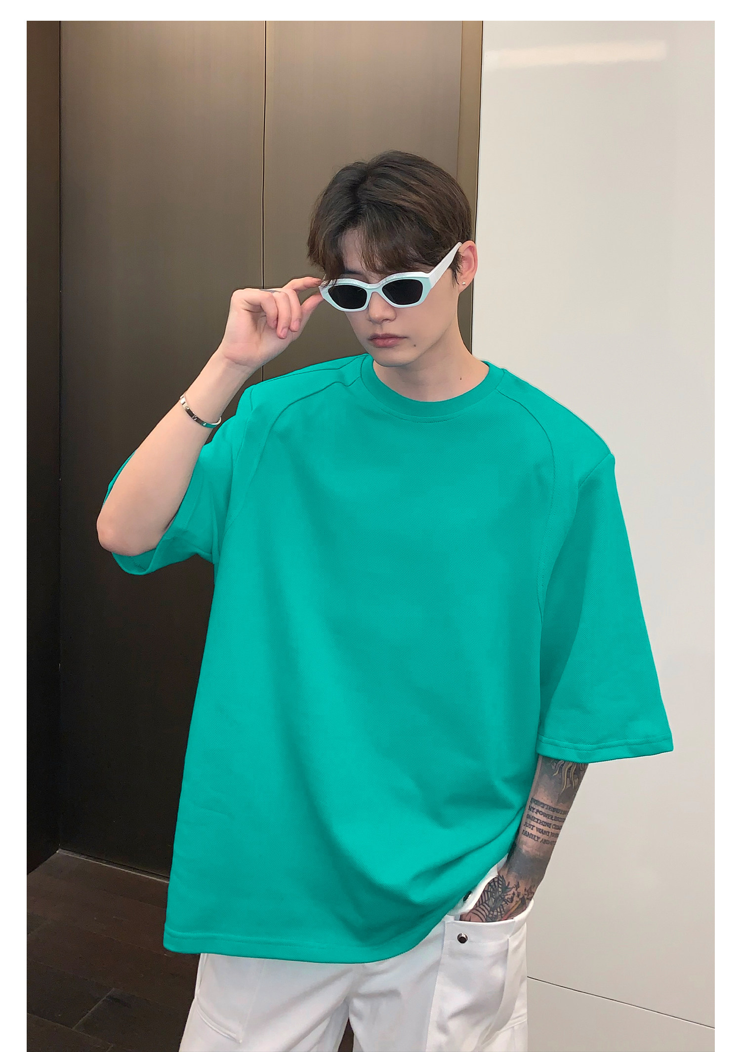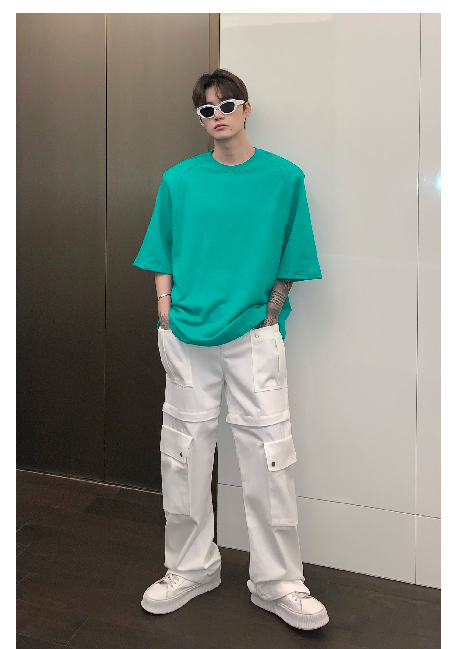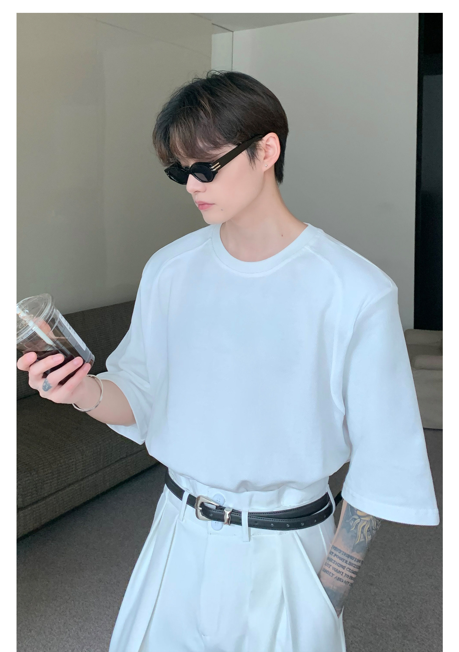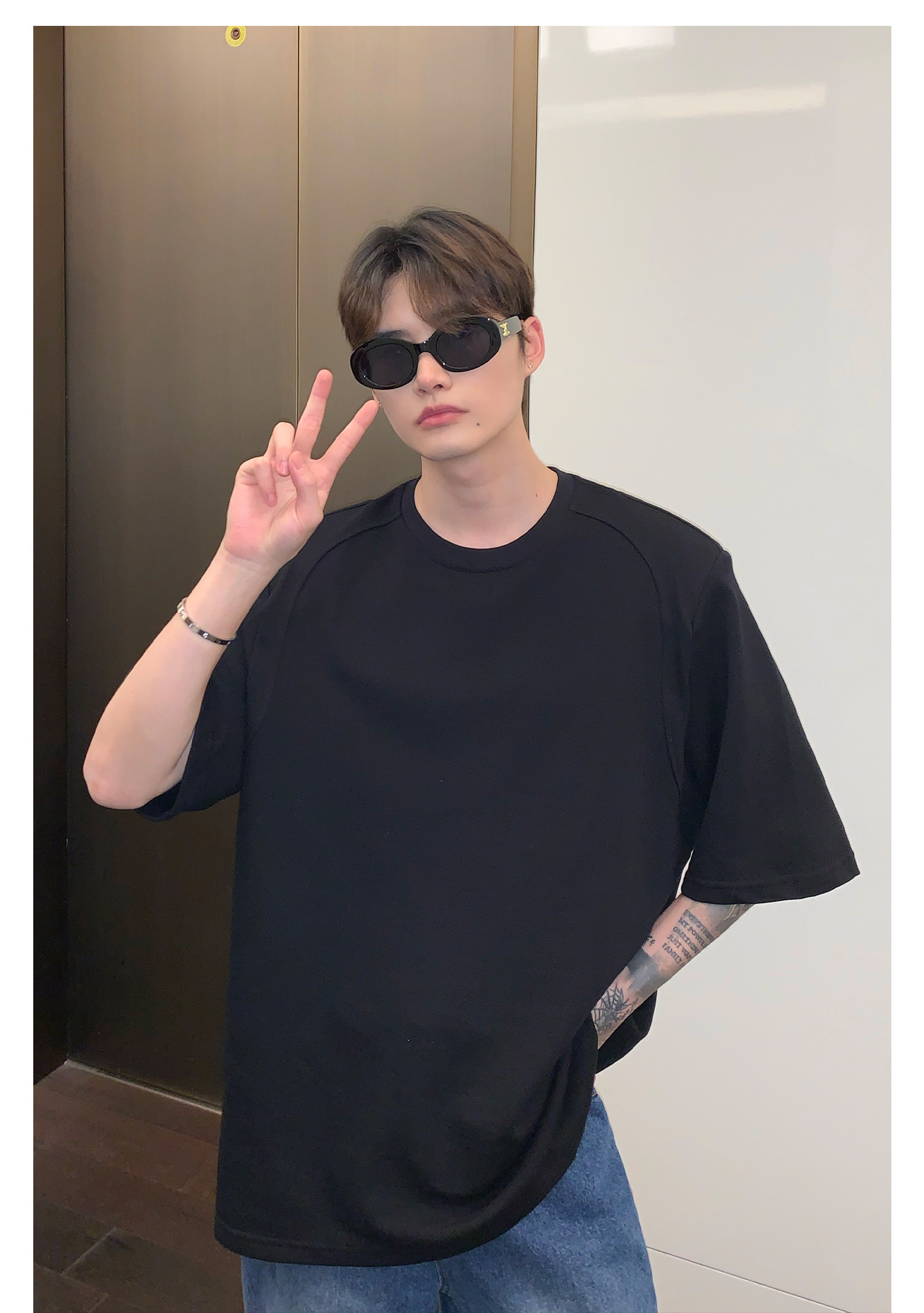 Наплечники, универсальная футболка с коротким рукавом с круглым воротником, в корейском стиле, простой и элегантный дизайн, оверсайз