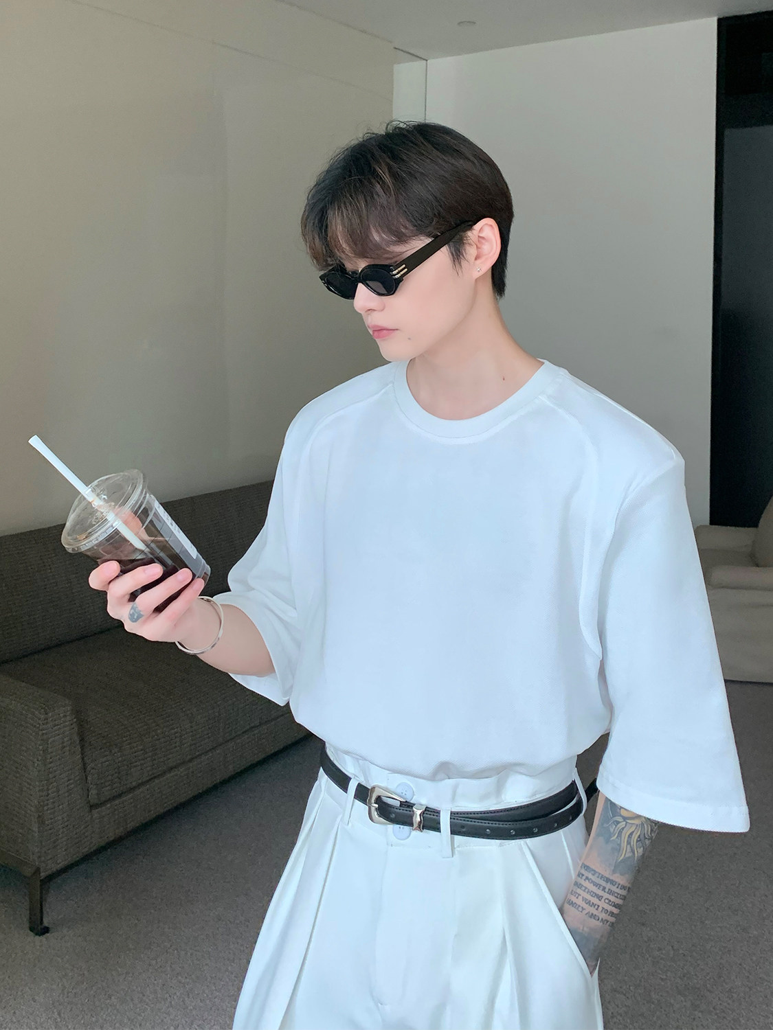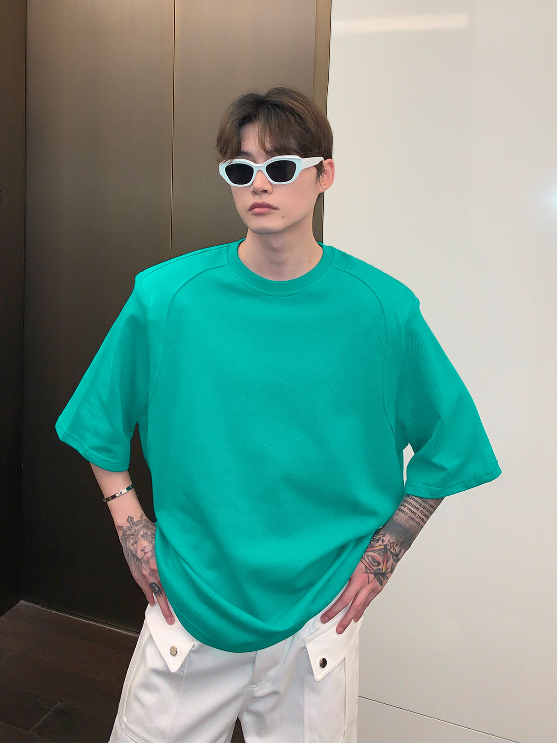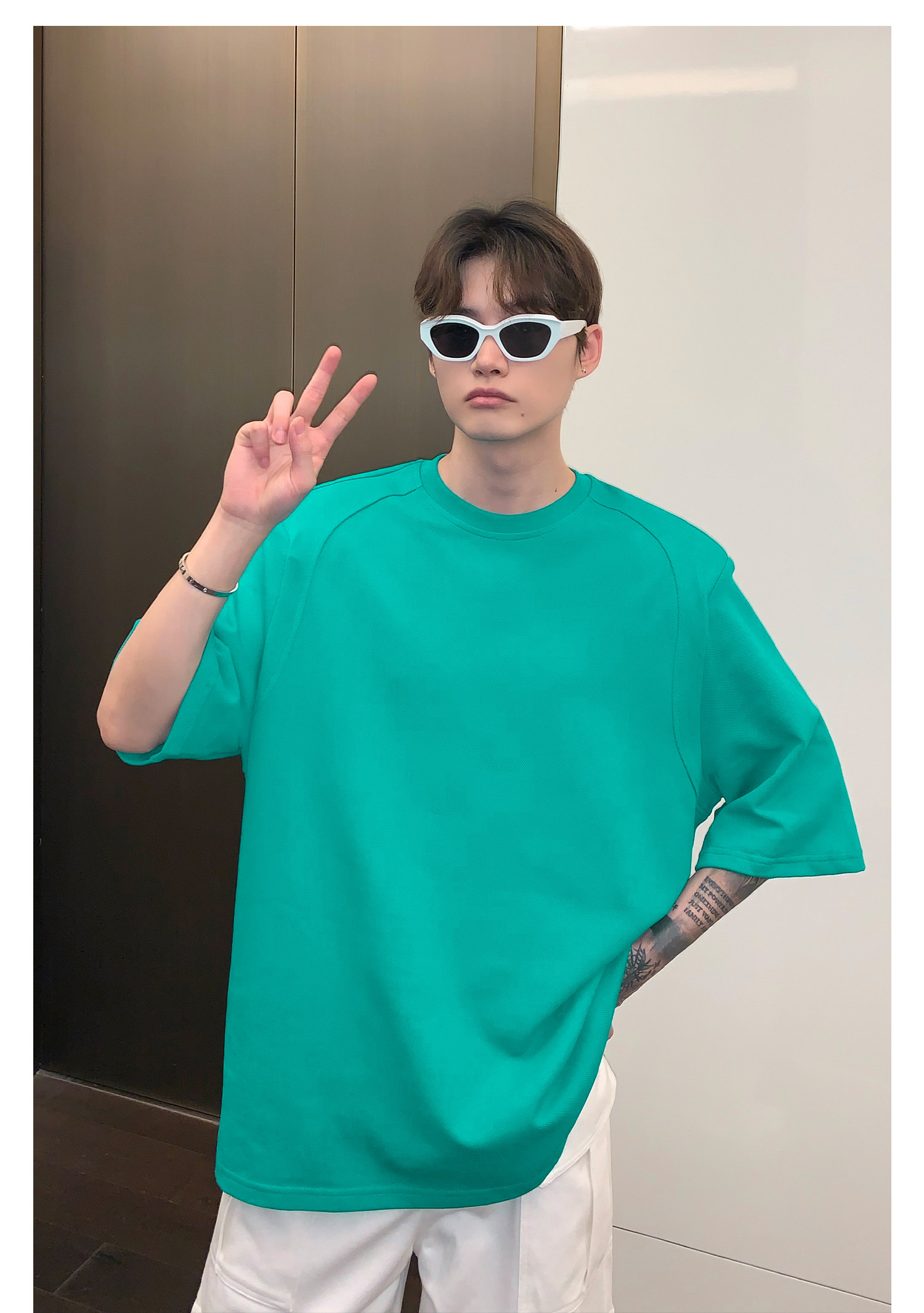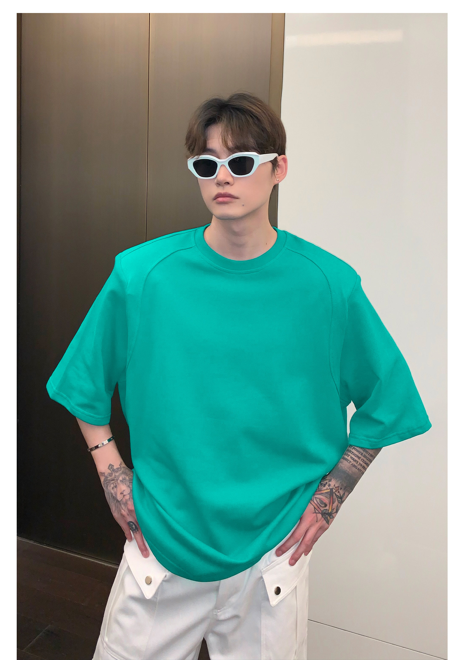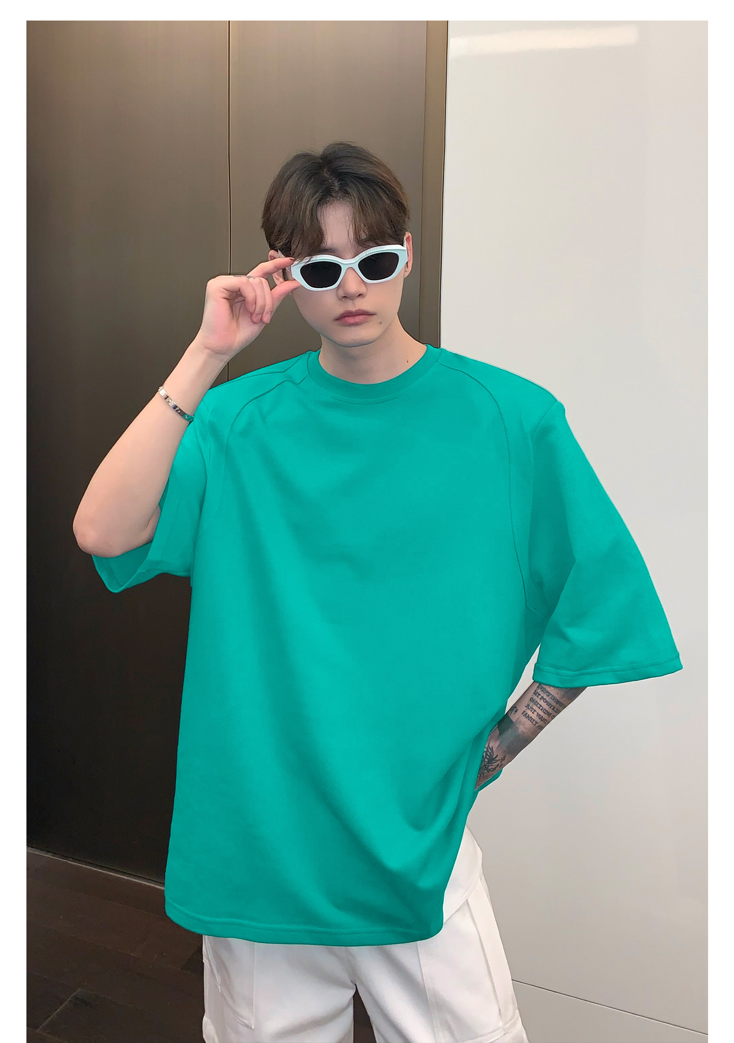 Наплечники, универсальная футболка с коротким рукавом с круглым воротником, в корейском стиле, простой и элегантный дизайн, оверсайз