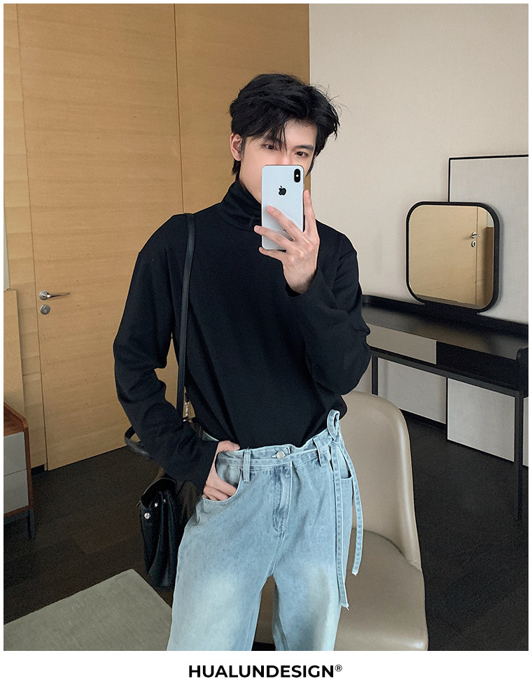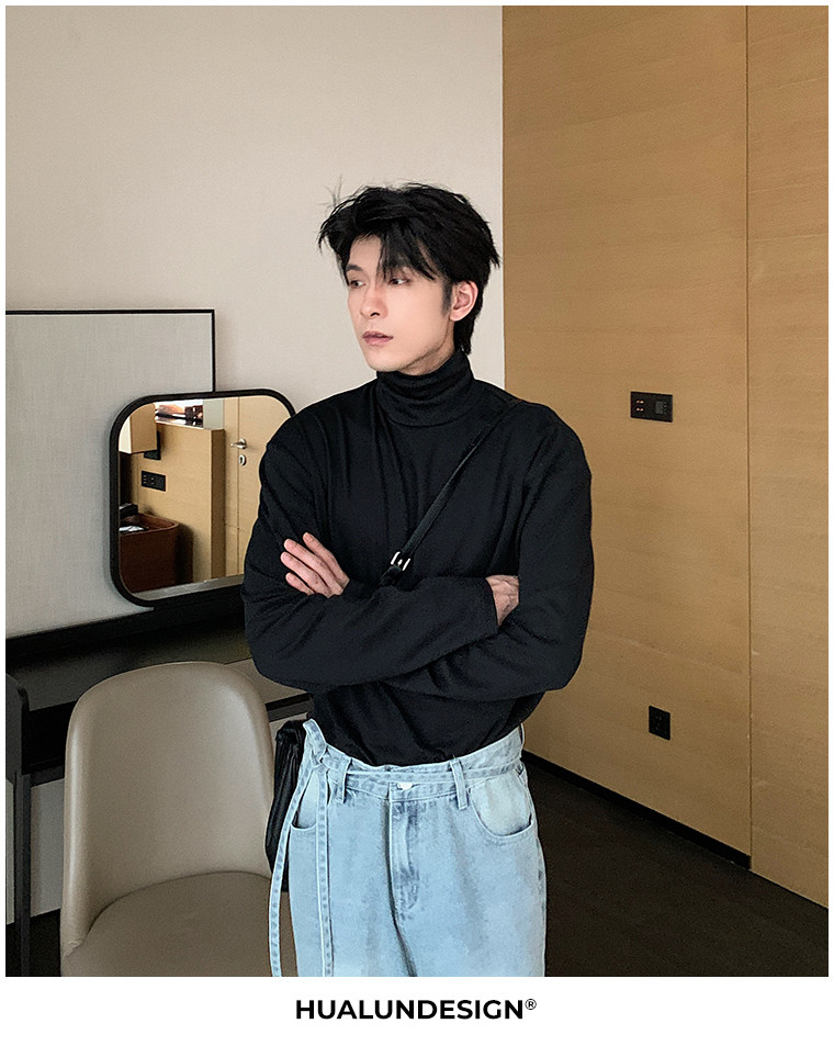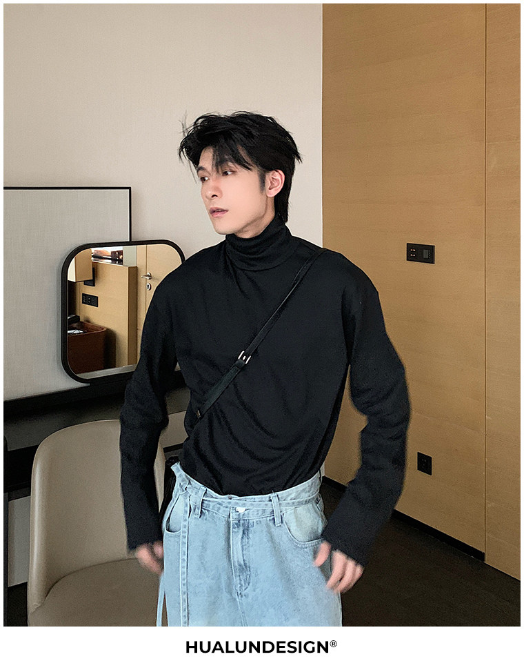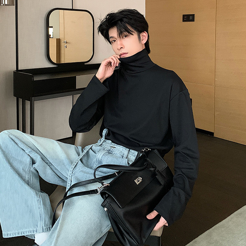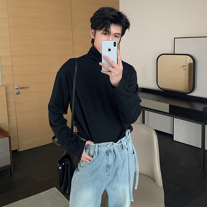 Демисезонная черная футболка, базовый приятный телу трендовый лонгслив, в корейском стиле, высокий воротник
