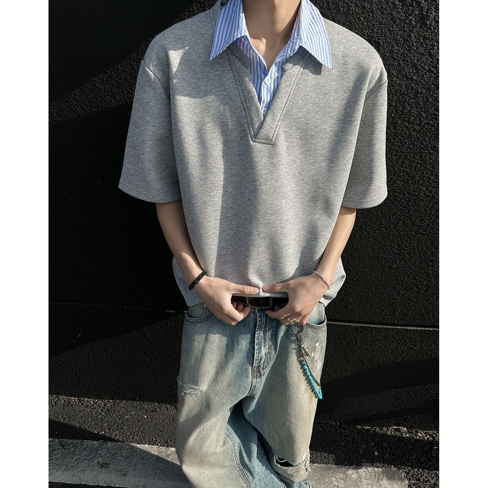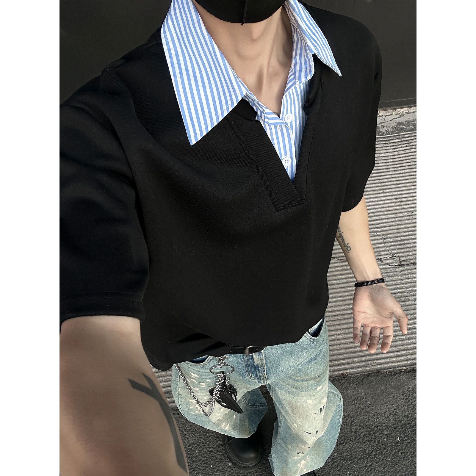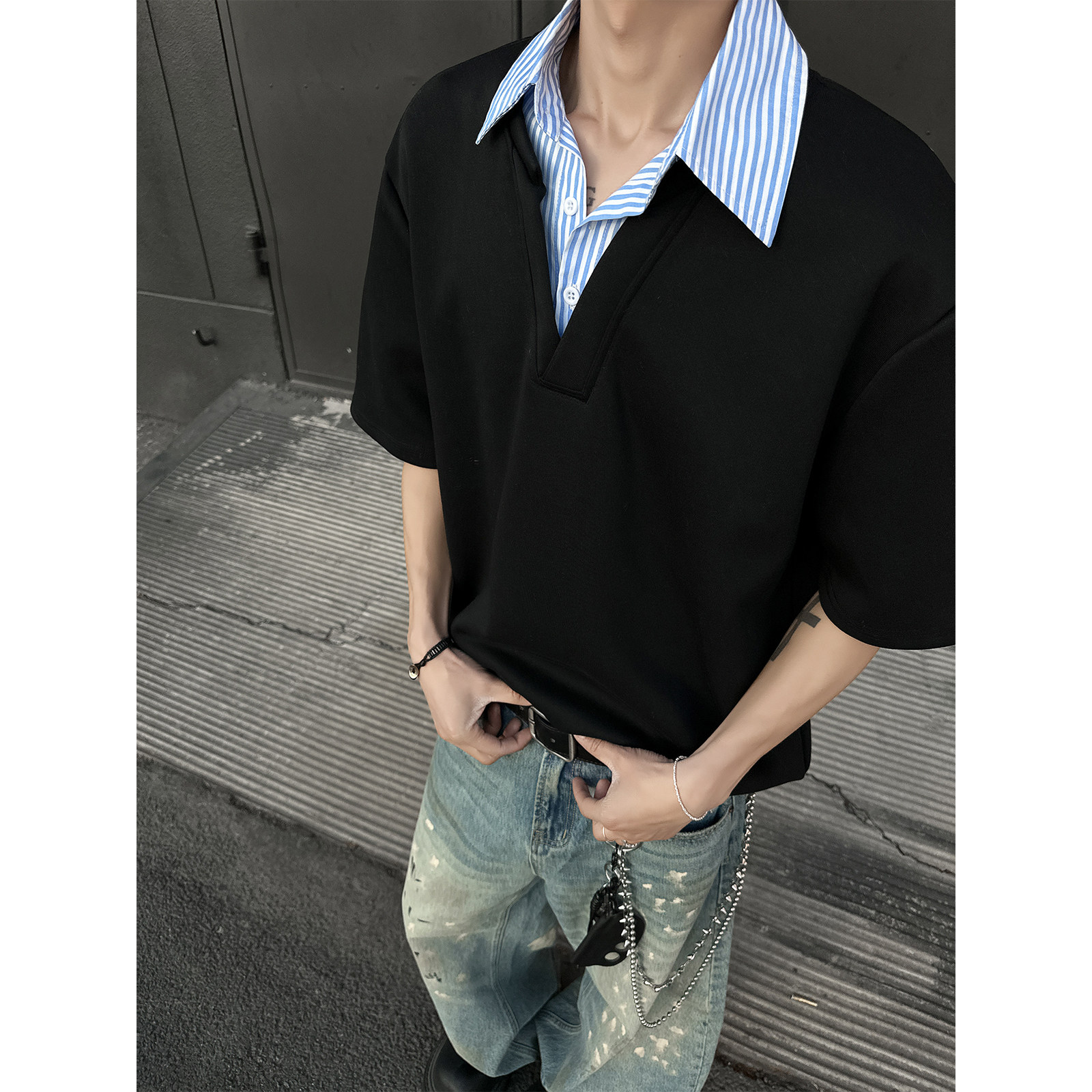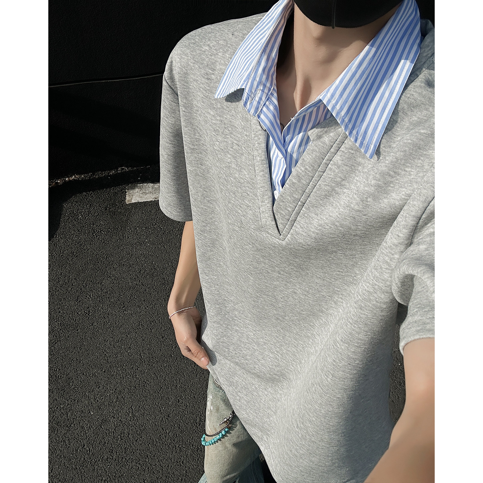Комплект, рубашка, летняя футболка с коротким рукавом, имитация рубашки, изысканный стиль, воротник поло, свободный крой