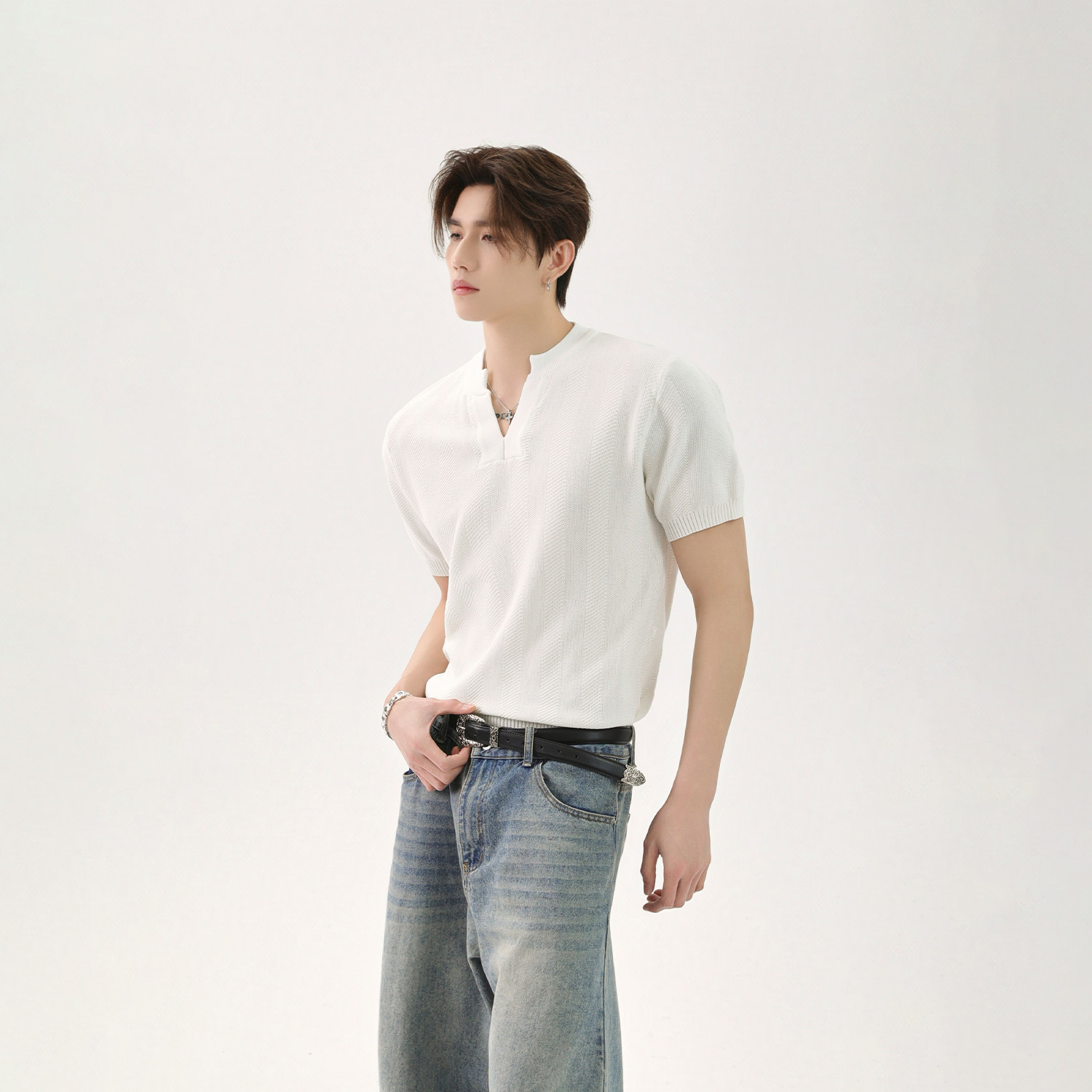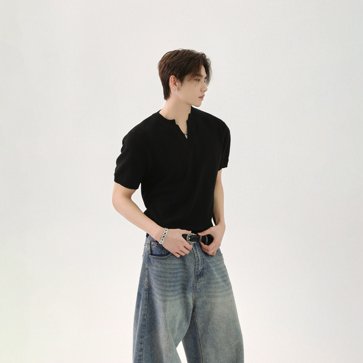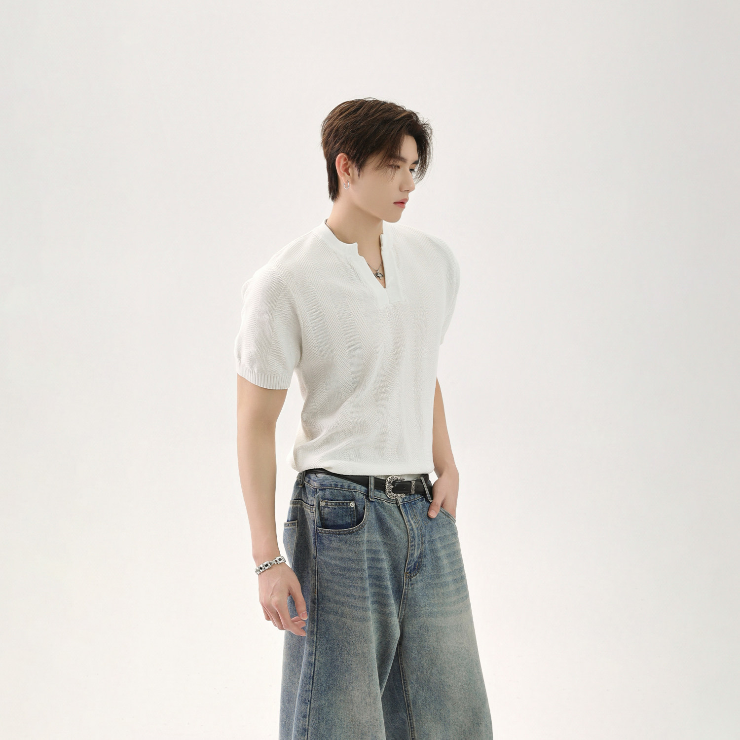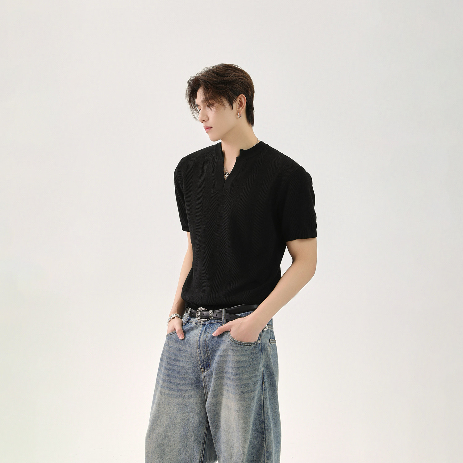 Дизайнерская трикотажная базовая футболка, V-образный вырез, тренд сезона, оверсайз, короткий рукав