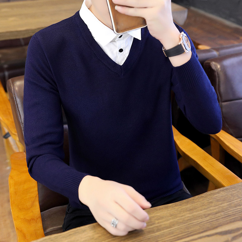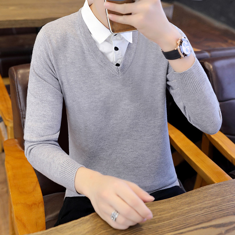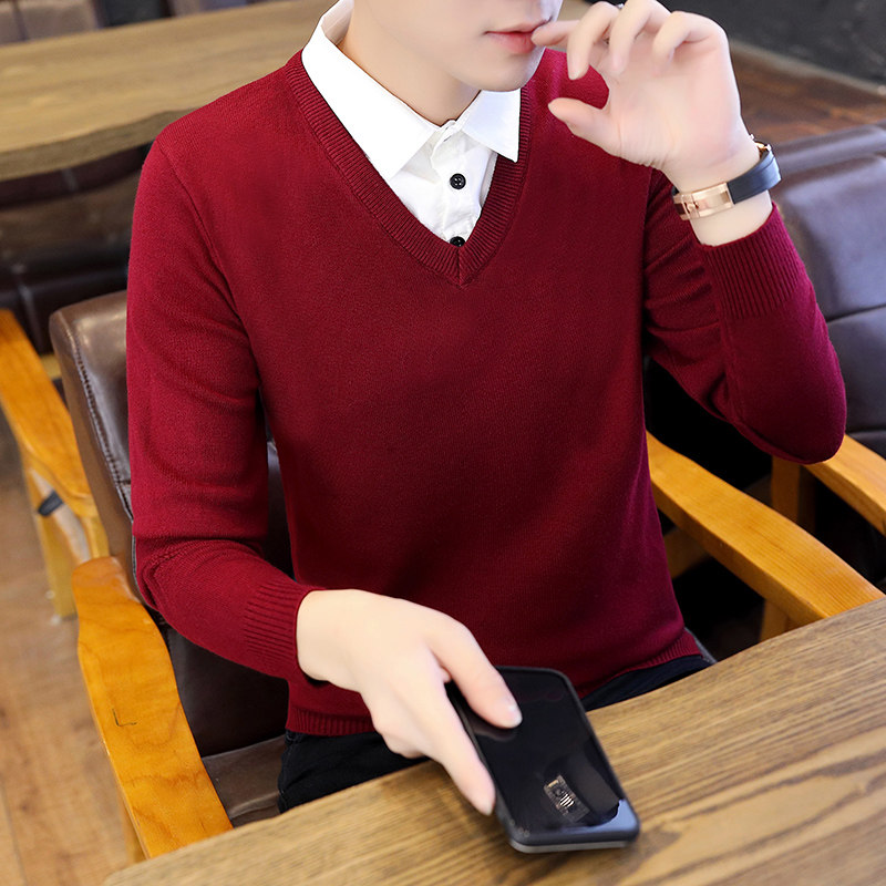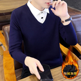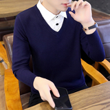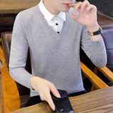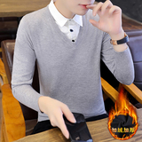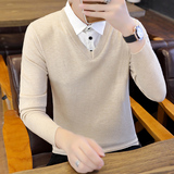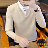 Рубашка, мужской фальшивый воротник, трендовый демисезонный свитер для отдыха, трикотажный утепленный комплект, в корейском стиле