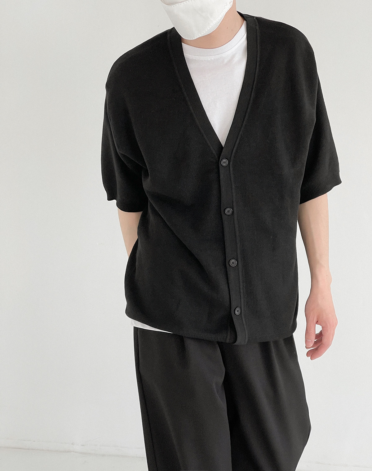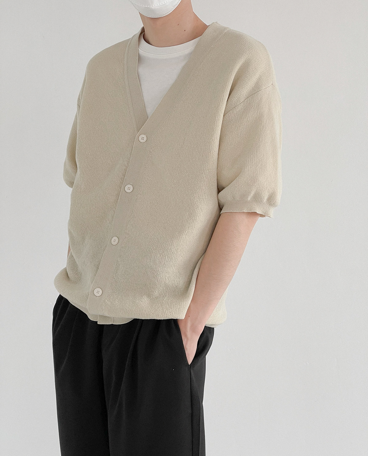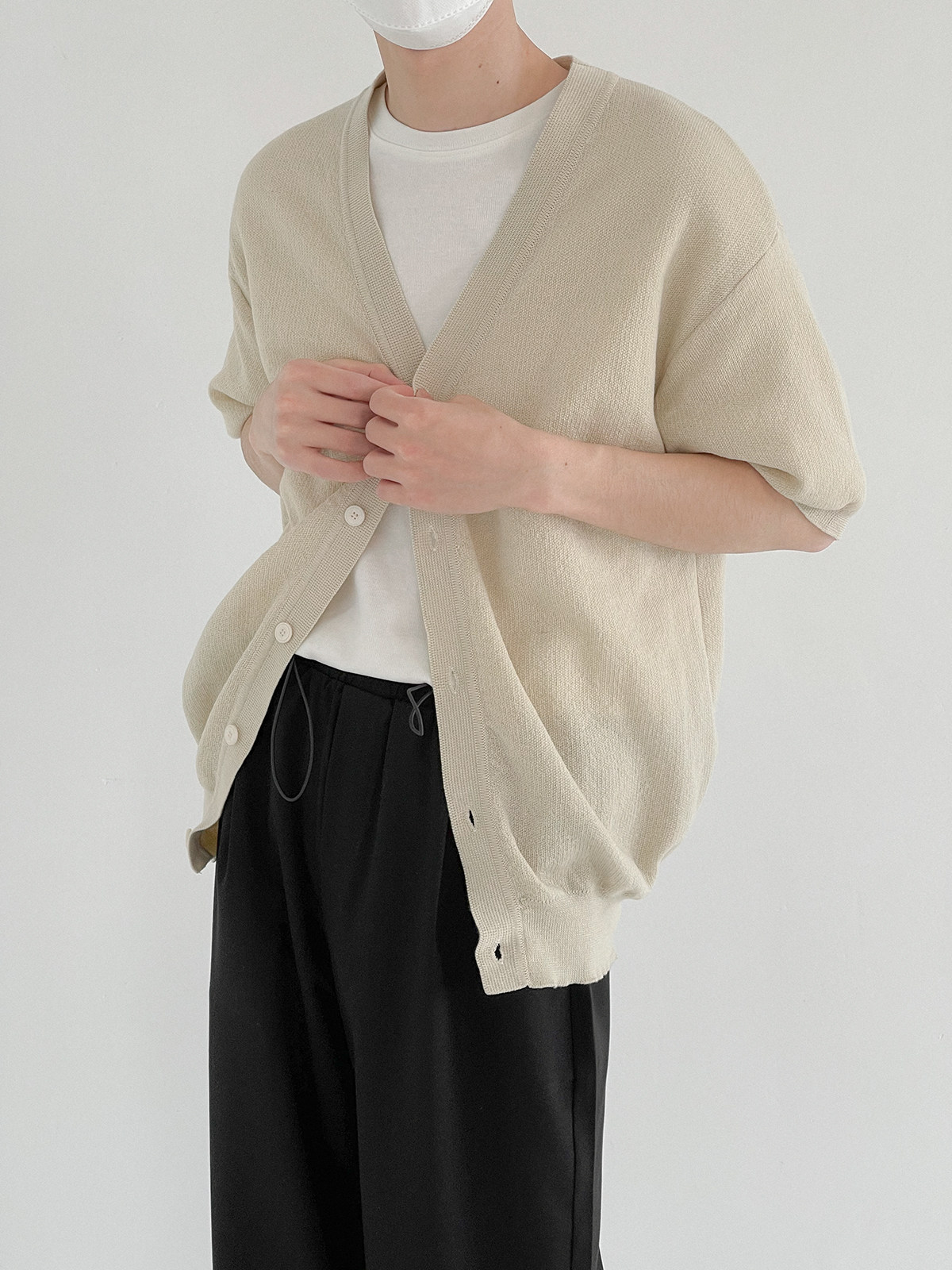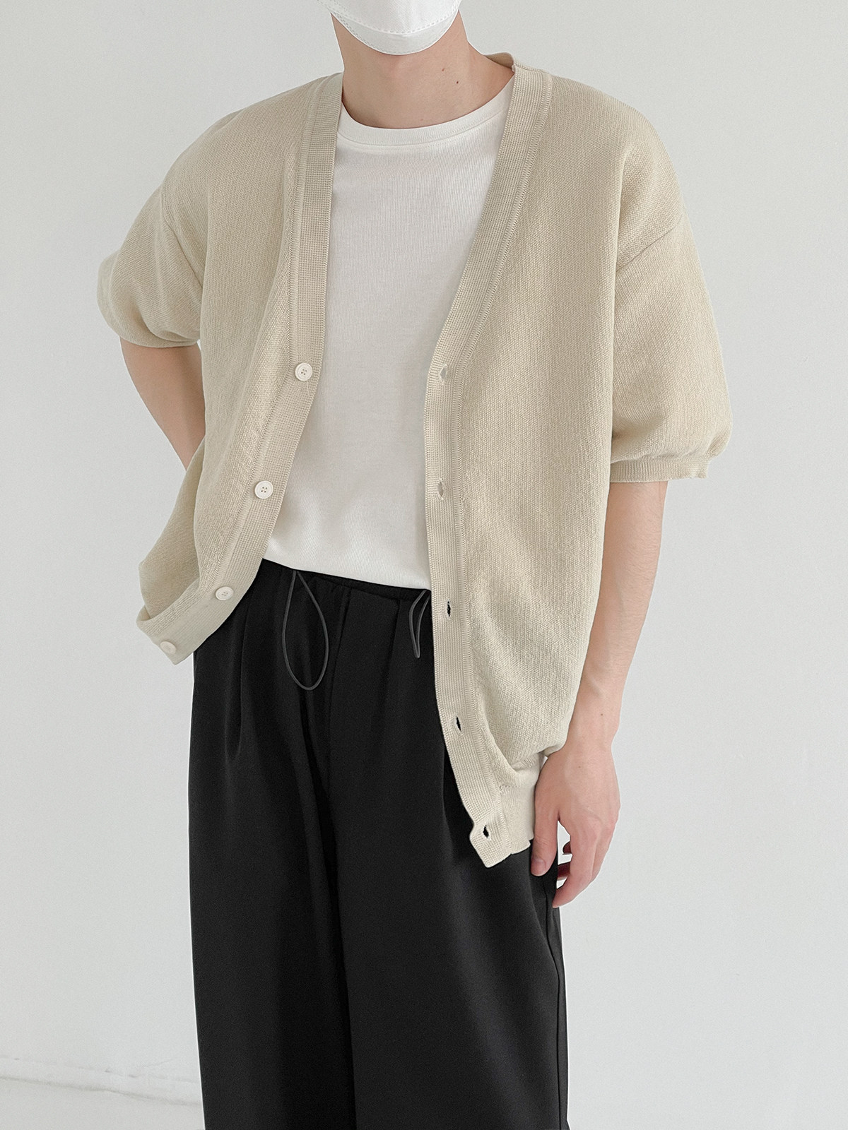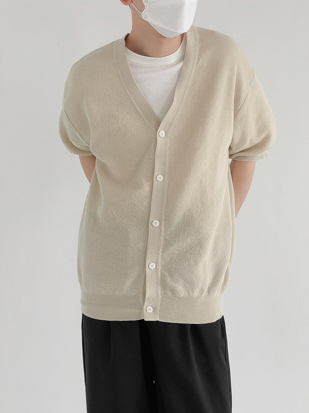 Мужской летний кардиган, тонкий трикотажный цветной трендовый свитер, короткий рукав, облегающий крой, V-образный вырез, в корейском стиле