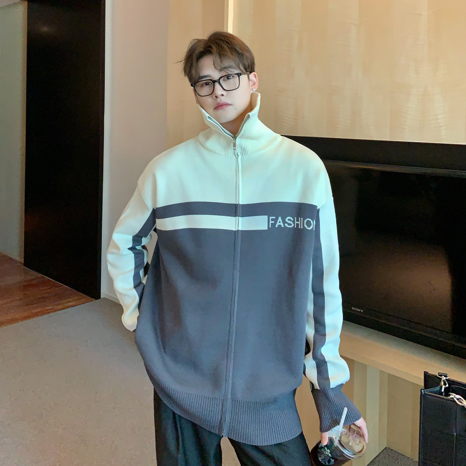 Мужской кардиган с молнией, трикотажный свитер, оверсайз