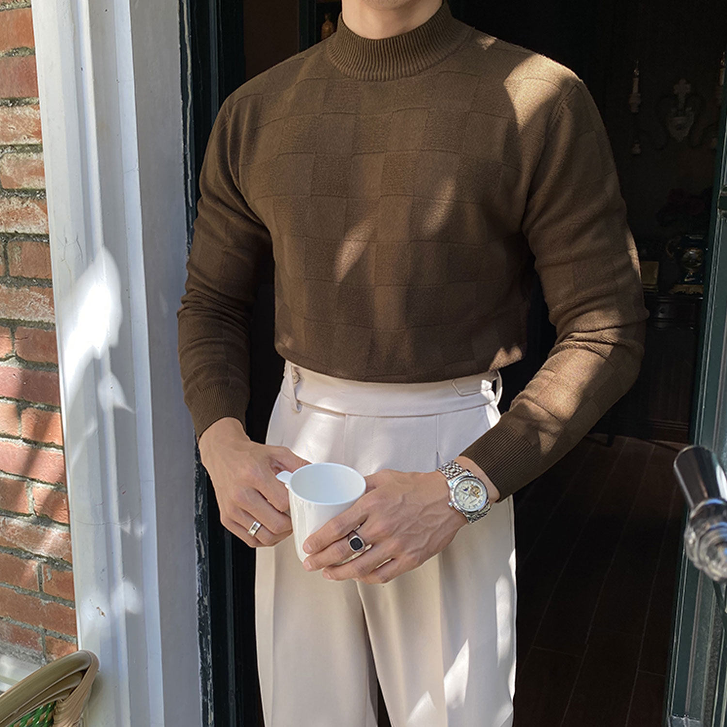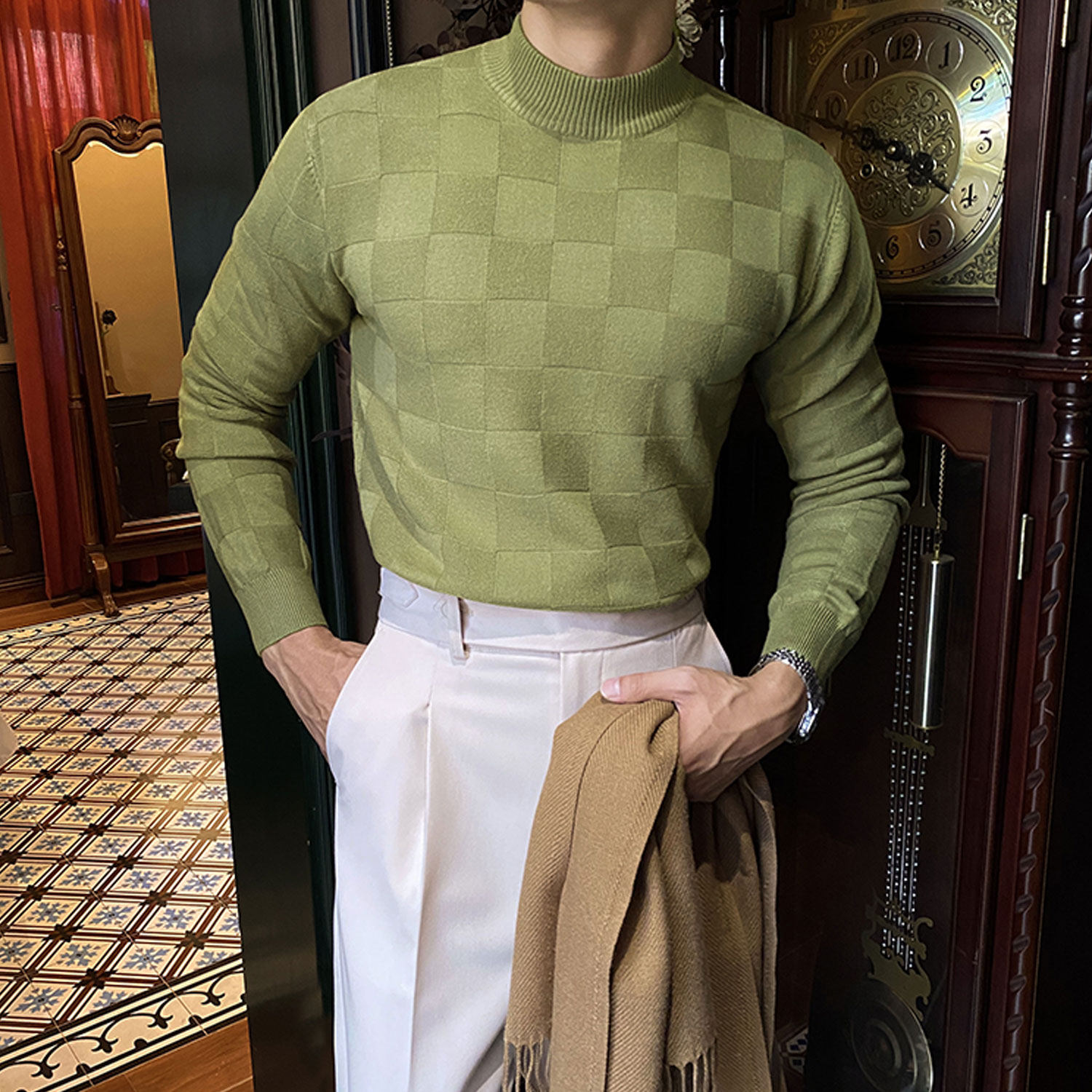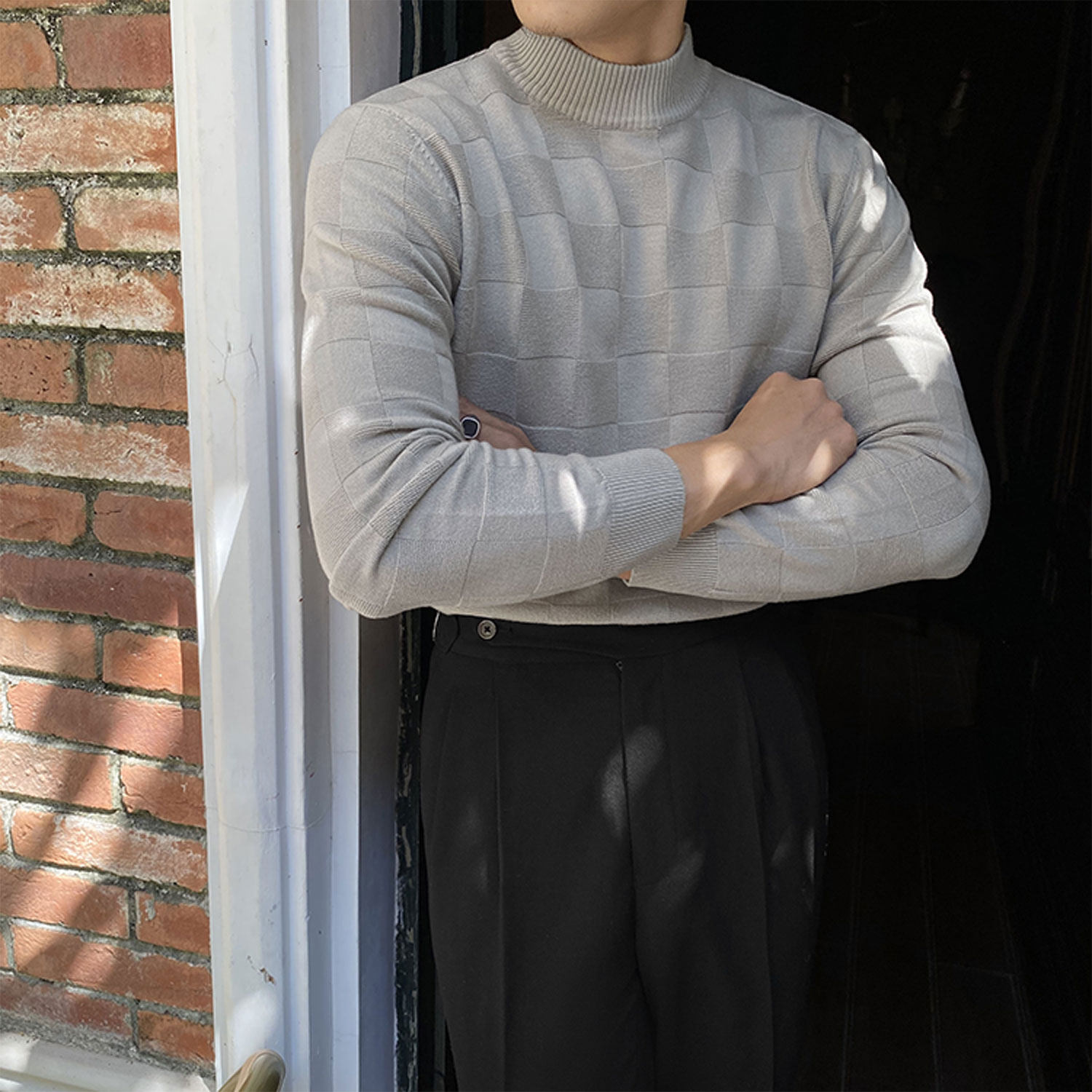 Шахматы, свитер, демисезонный трикотажный лонгслив для отдыха, высокий воротник, облегающий крой