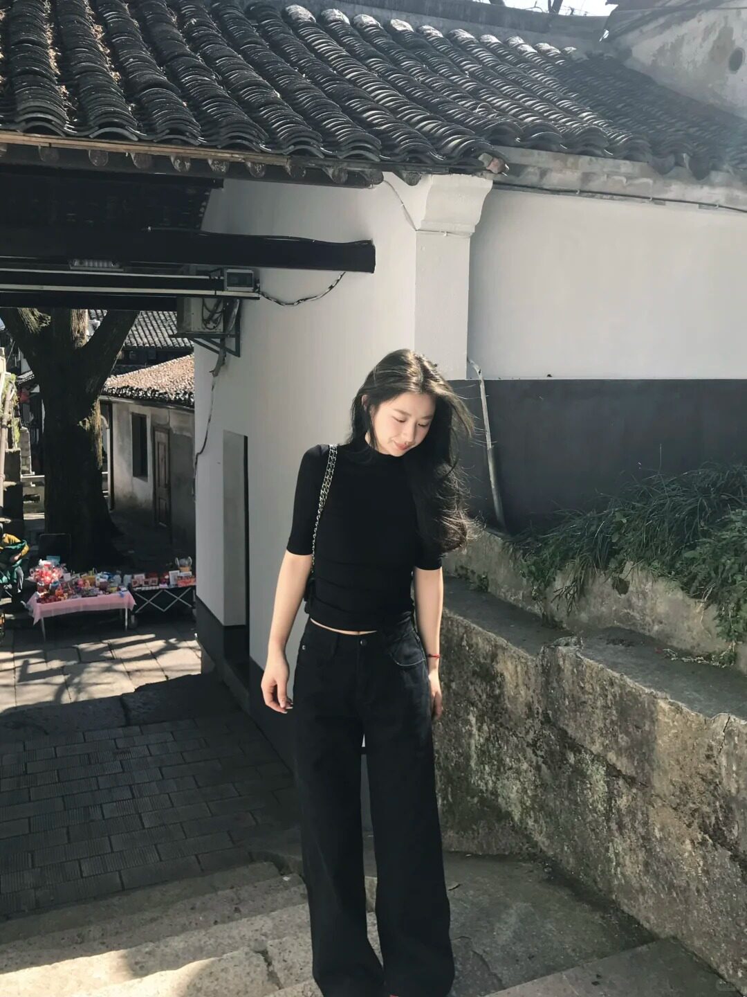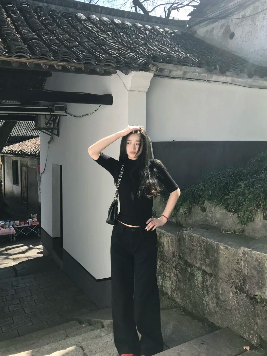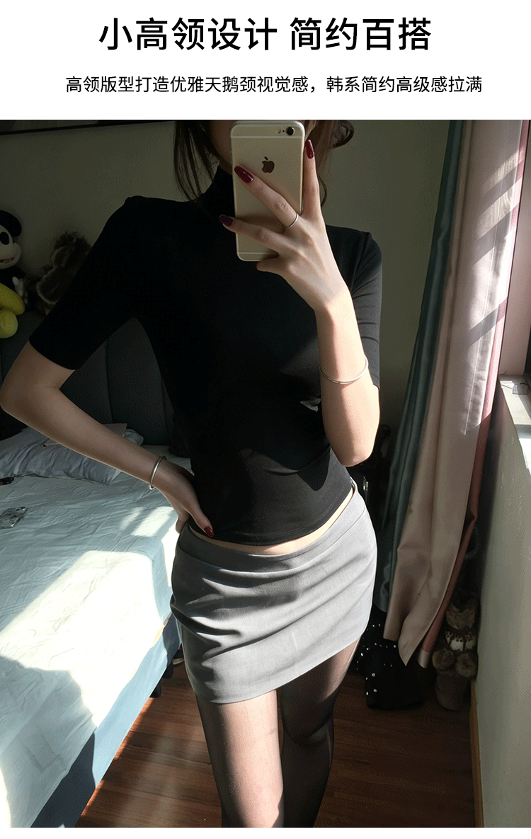 Черная цветная весенняя летняя футболка, приталенный корсет, высокий воротник, изысканный стиль, короткий рукав