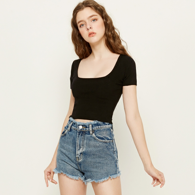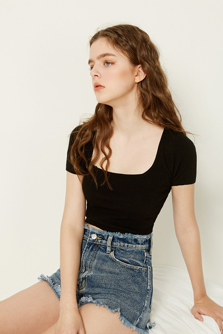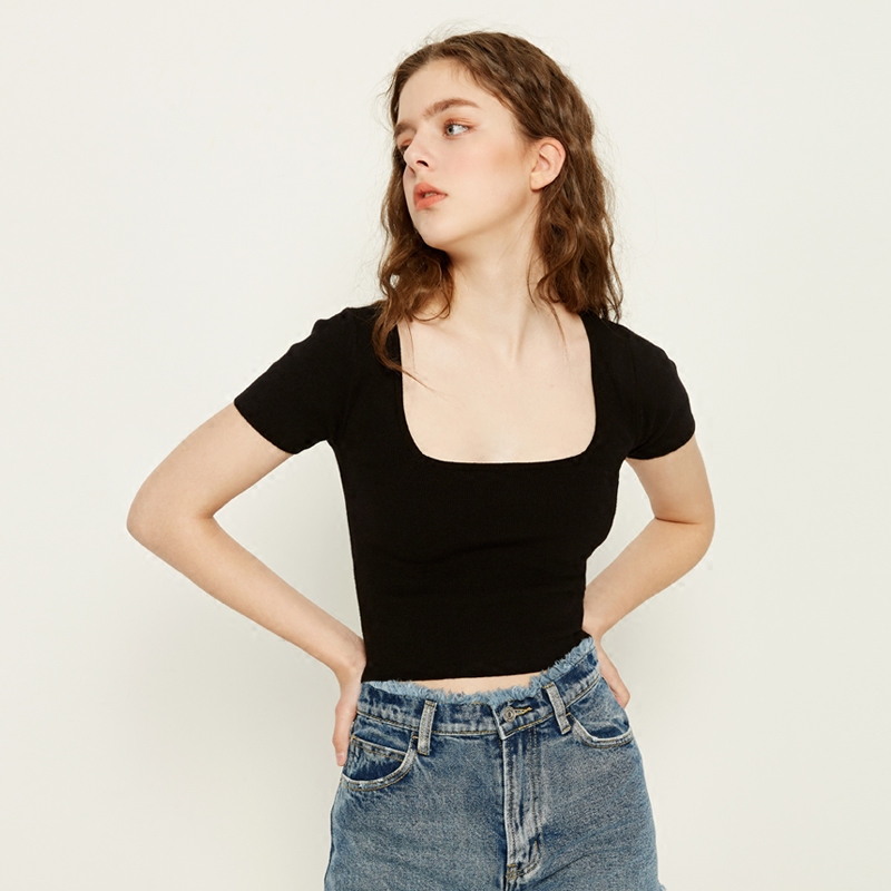 Ретро короткая хлопковая приталенная футболка, трикотажный весенний летний свитер, европейский стиль, квадратный вырез, короткий рукав