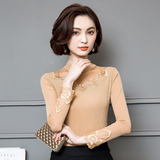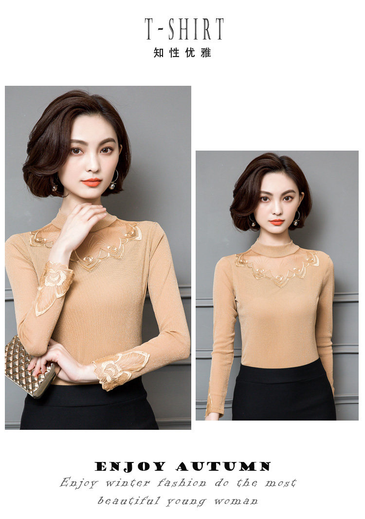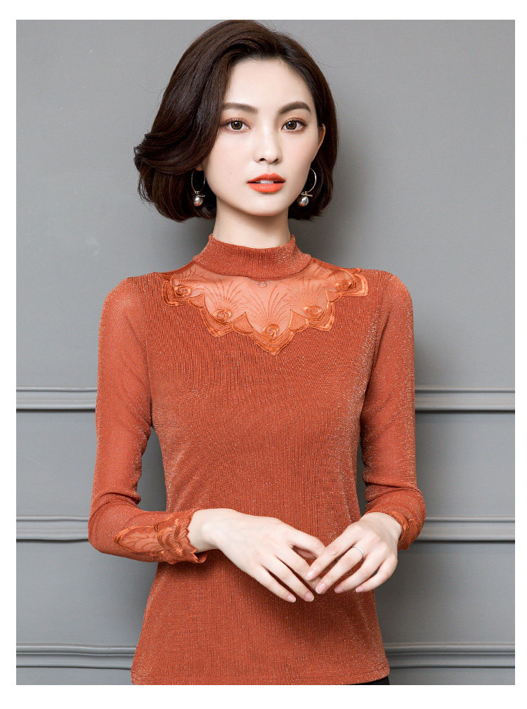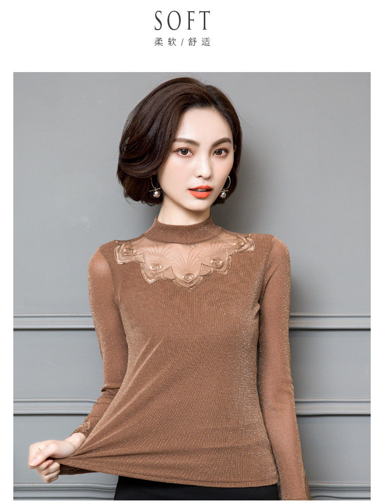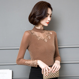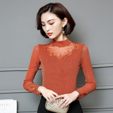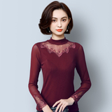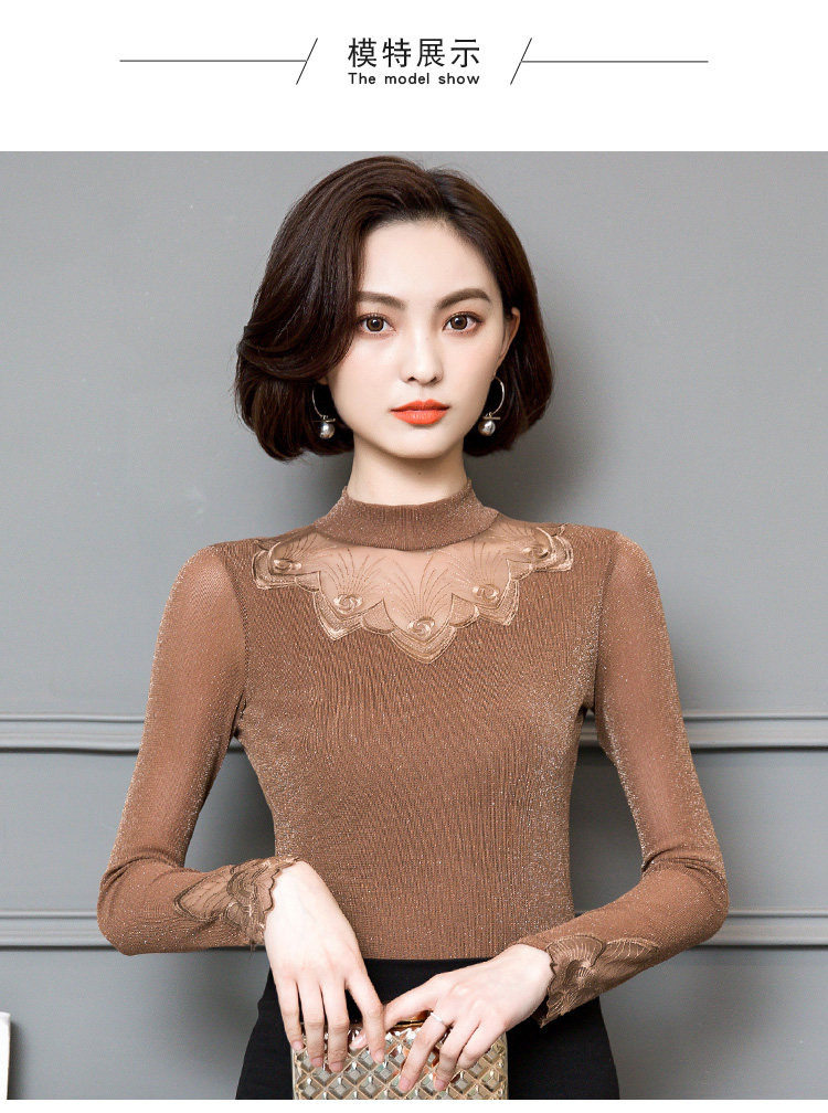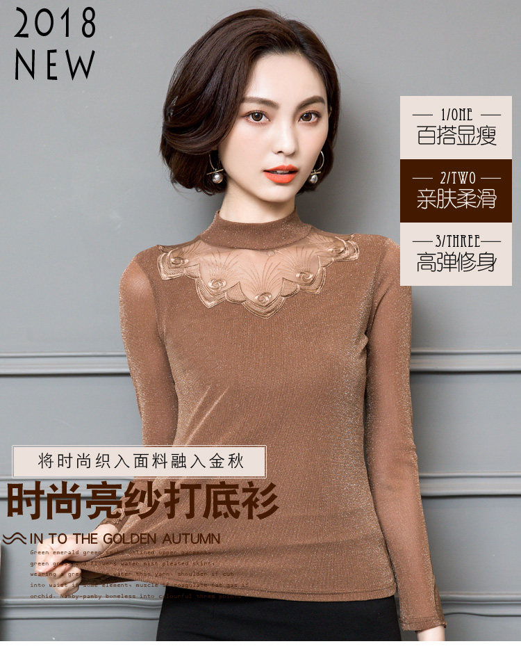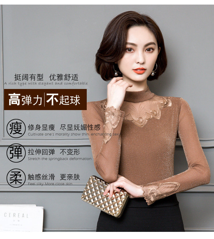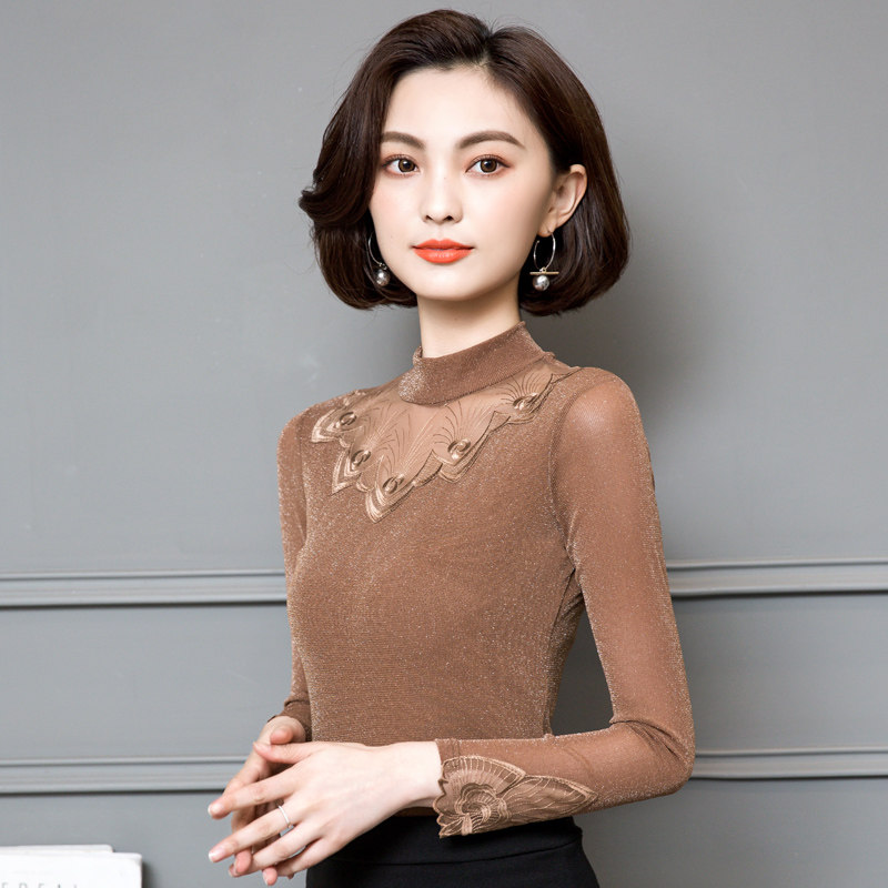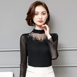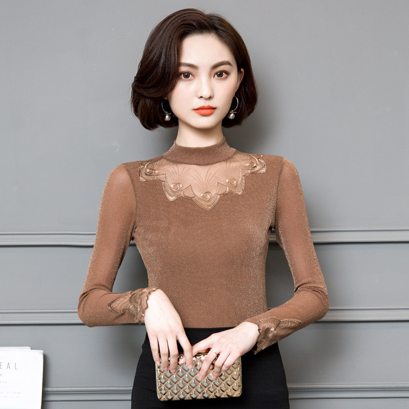 2022 Новая сетчатая базовая рубашка для женской весны и осени высокой шеи и тонкой кружевной вершины с универсальной тонкой посадкой снаружи