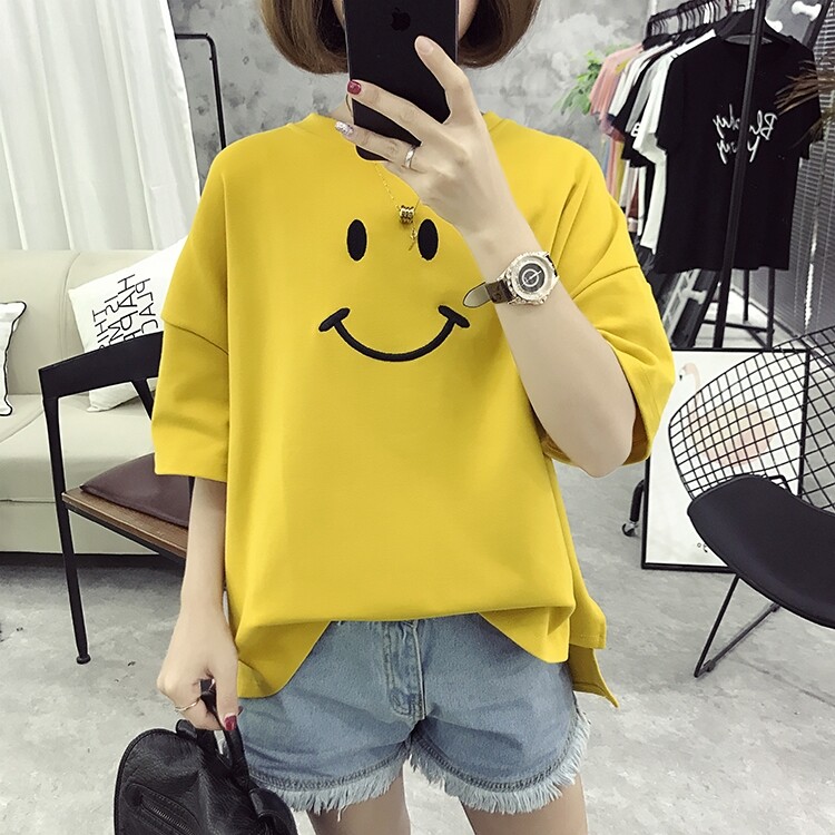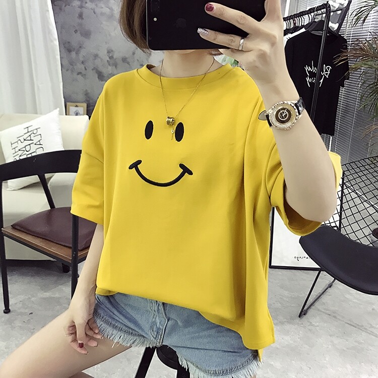 Летняя одежда, футболка с круглым воротником, сезон 2021, в корейском стиле, оверсайз, с вышивкой, короткий рукав, большой размер