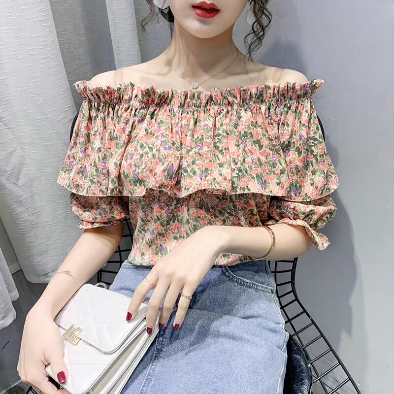 Шифоновая ретро рубашка, рукава фонарики, 2020, открытые плечи