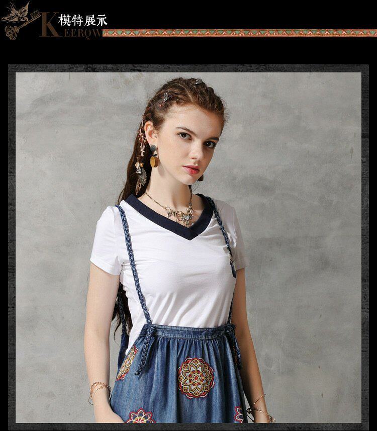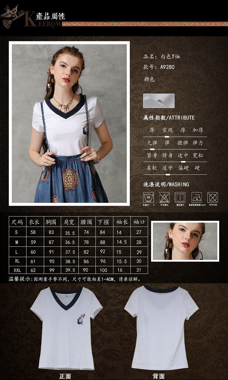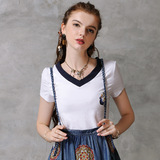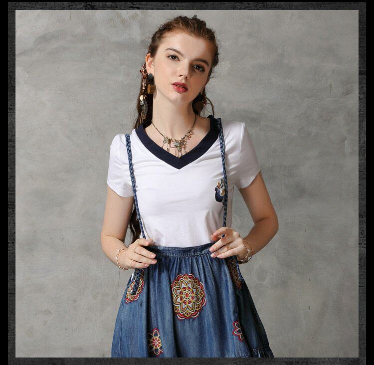 Летняя однотонная ретро летняя одежда, футболка, короткий рукав, с вышивкой, V-образный вырез
