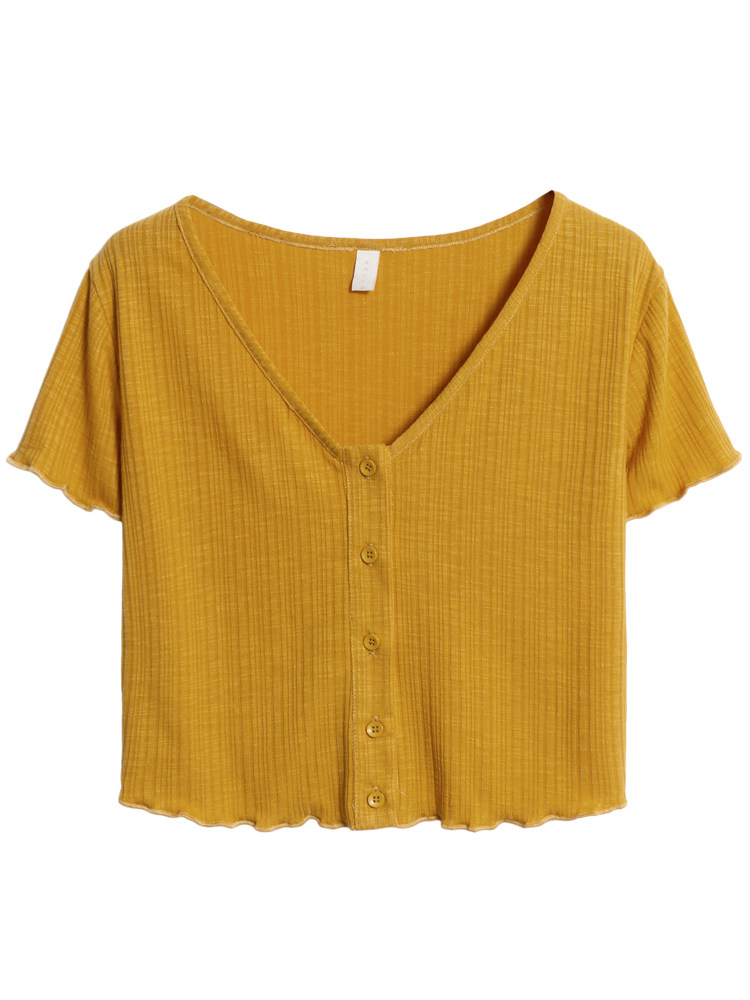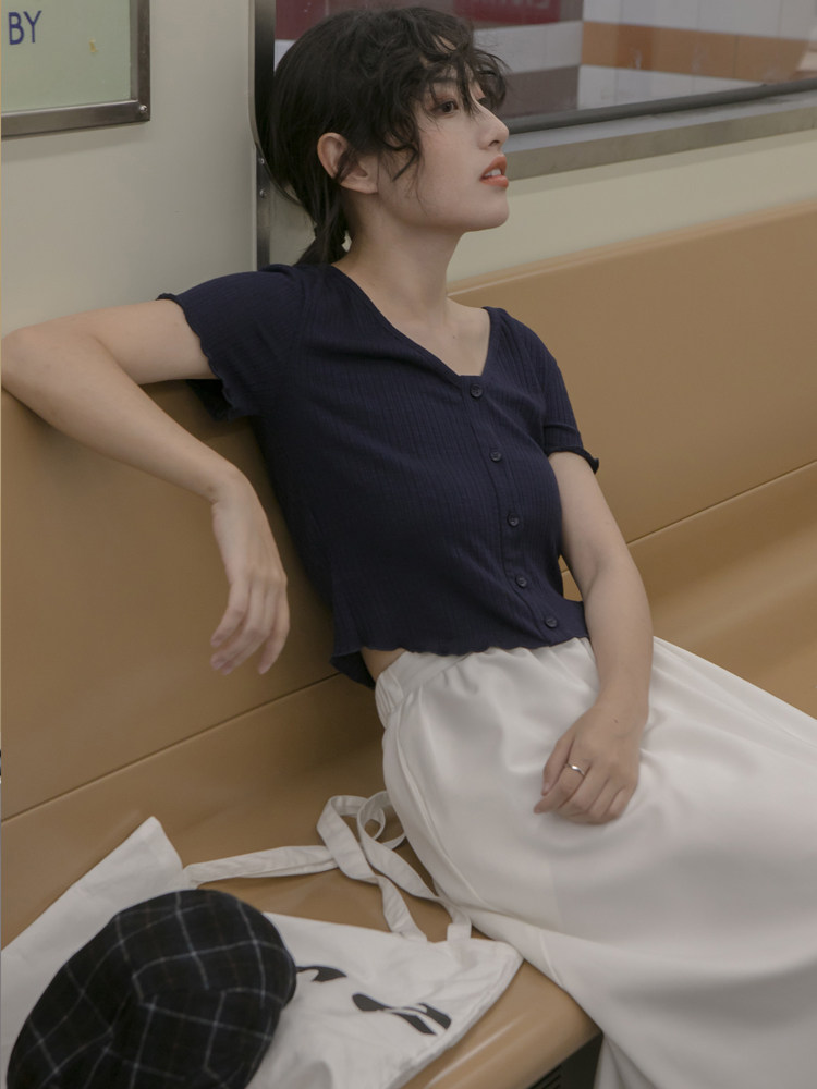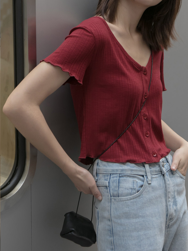 你好卡农 Трикотажная летняя ретро цветная футболка с коротким рукавом, V-образный вырез, облегающий крой
