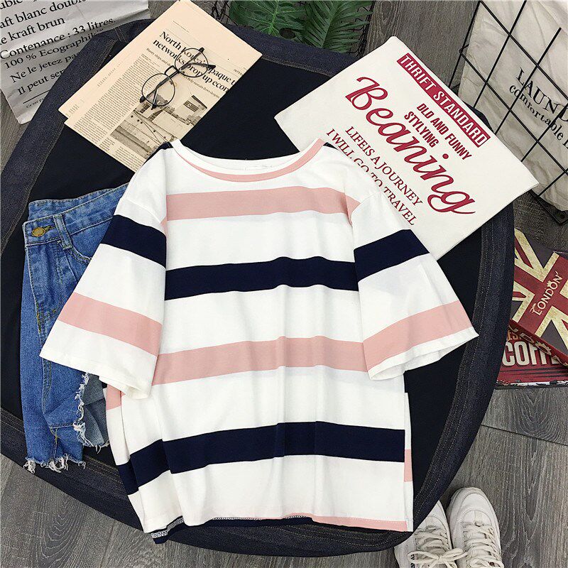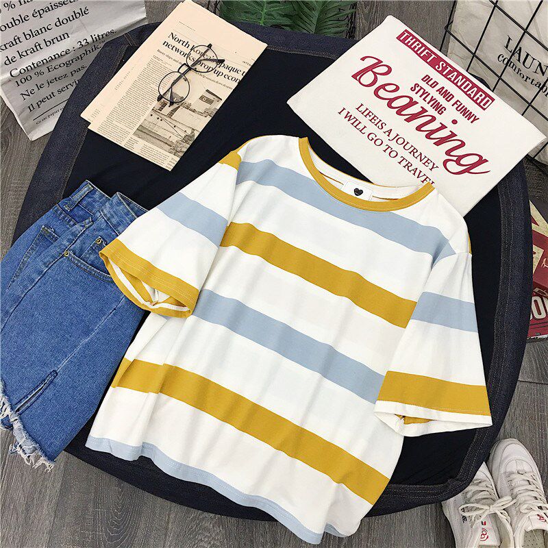 Модная корейская версия Chunyuan Neck Hot Super New Style Женская одежда 2020 полосатый короткий рукав свободный верхний накахара Suzuki