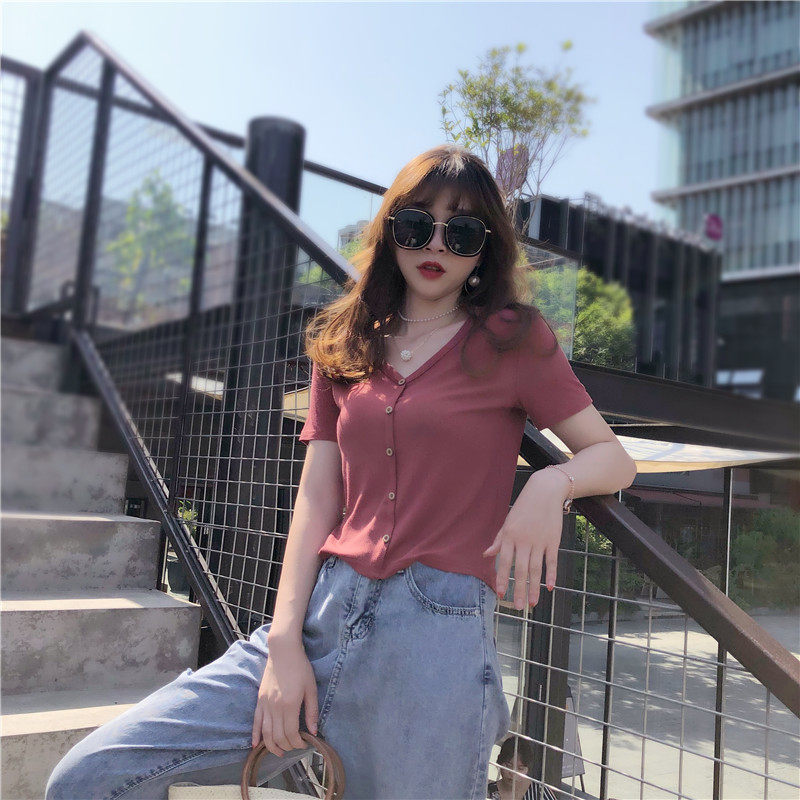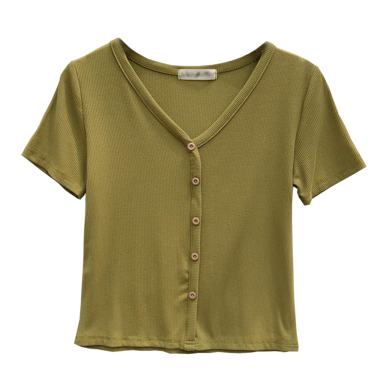 Однотонная летняя хлопковая приталенная трикотажная футболка, V-образный вырез, высокая талия