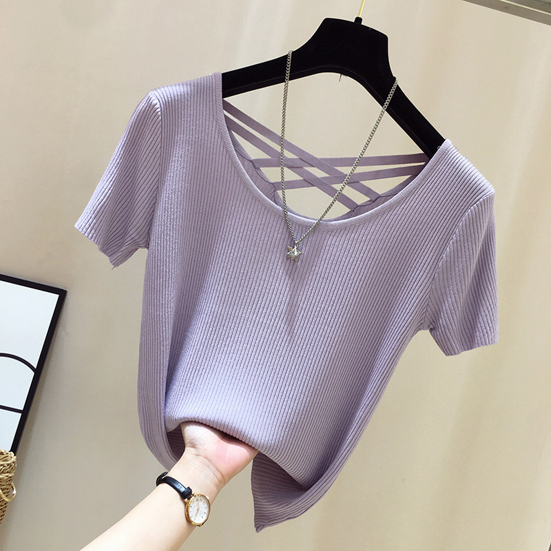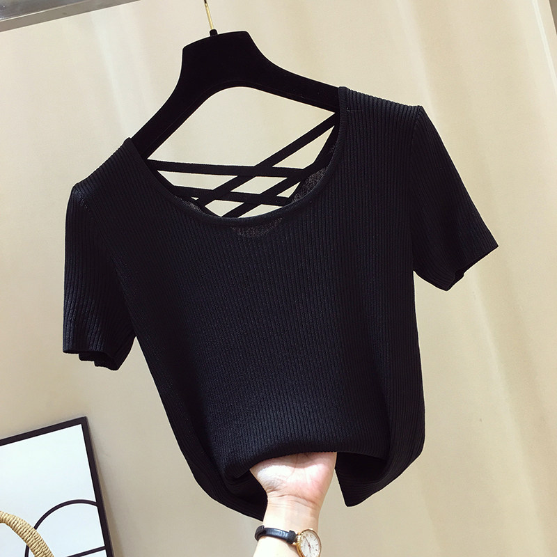 Короткая футболка с коротким рукавом, летний трикотажный тонкий базовый свитер, облегающий крой, высокий воротник, с открытой спиной