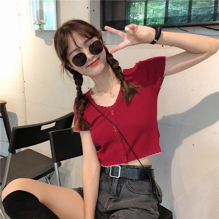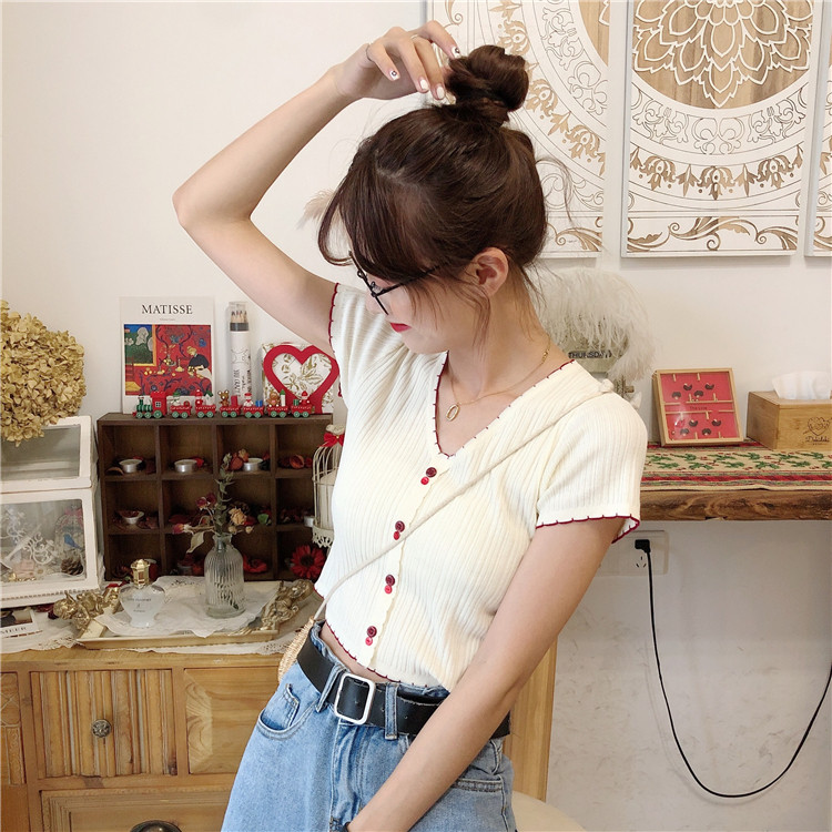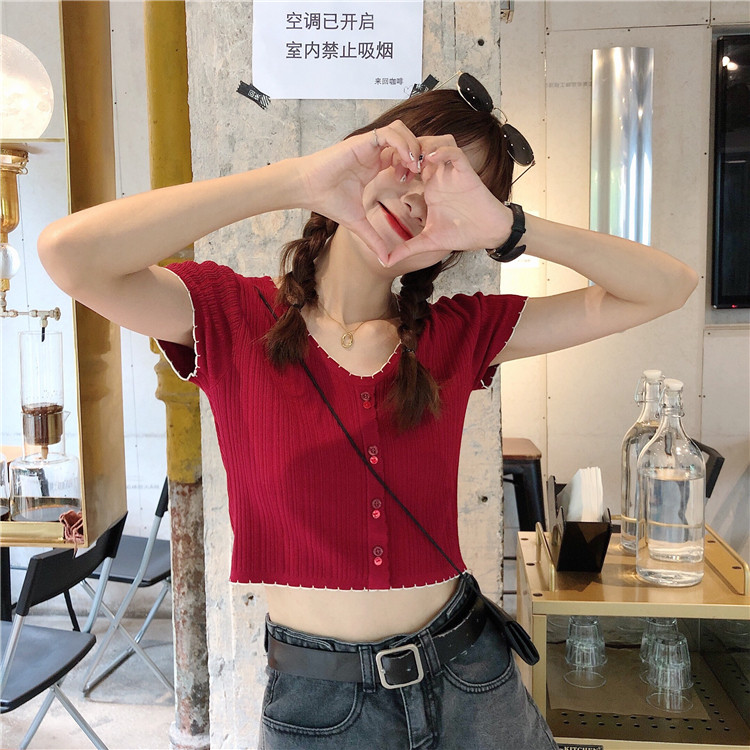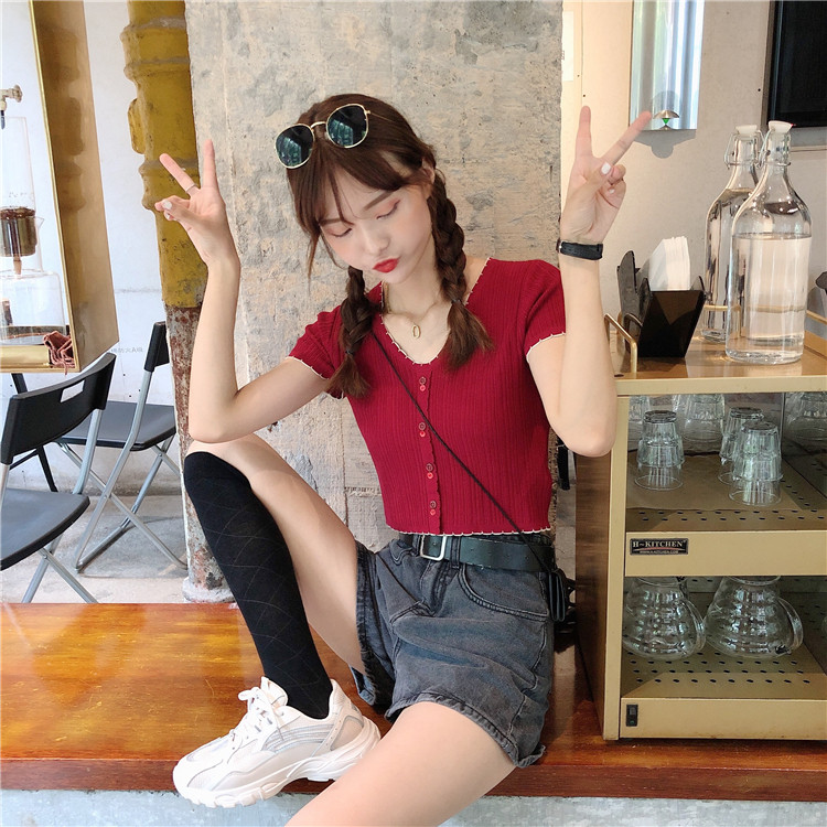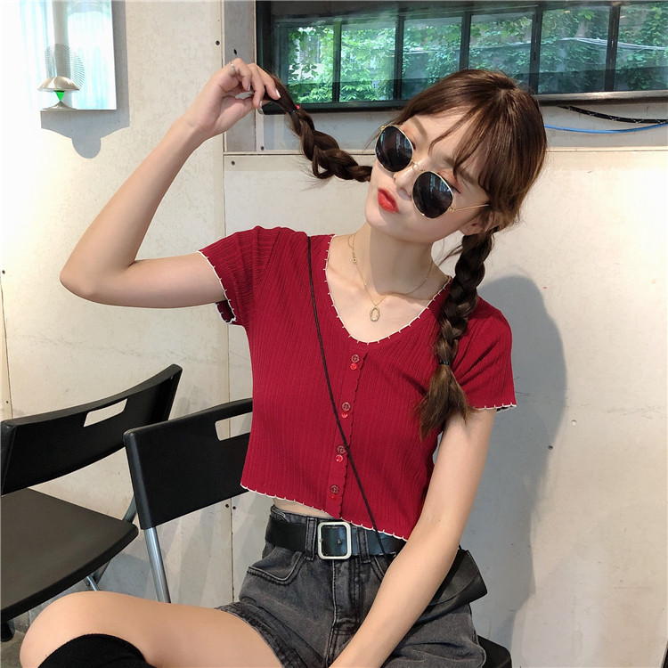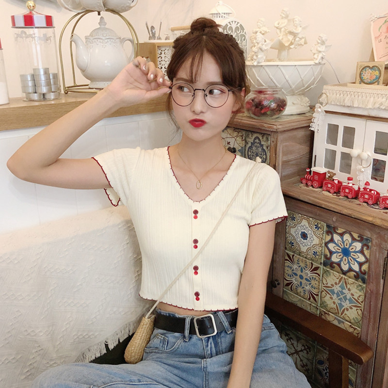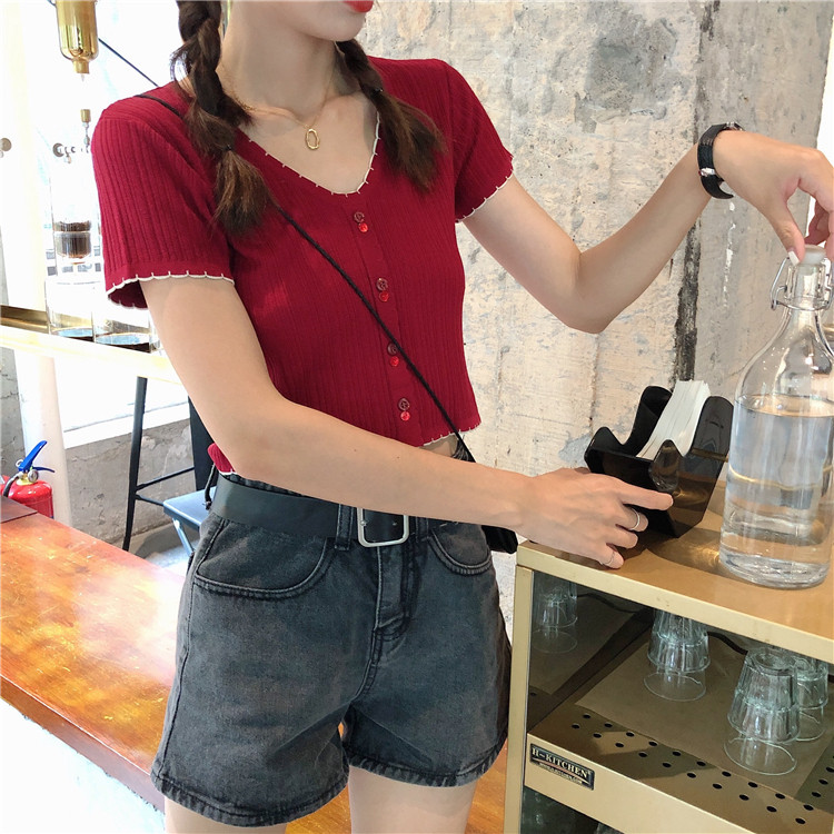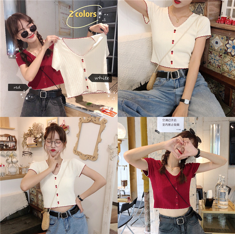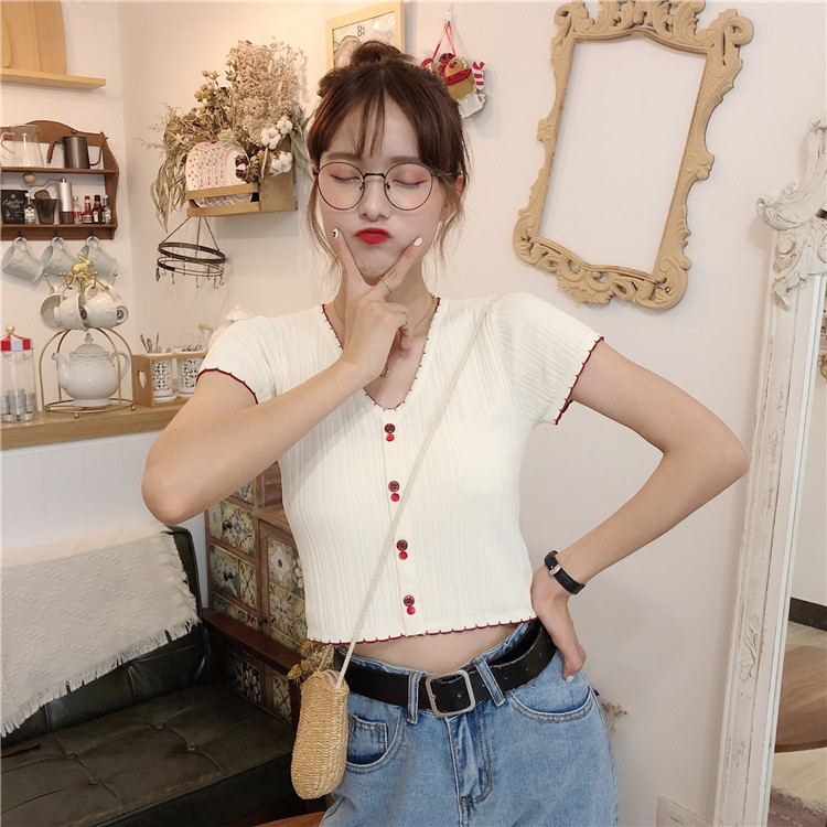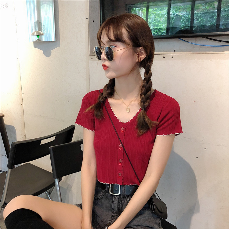 Летняя хлопковая футболка с коротким рукавом, брендовый тонкий трикотажный короткий свитер, коллекция 2021, V-образный вырез, облегающий крой