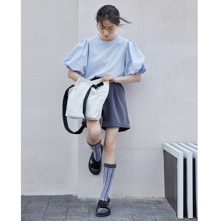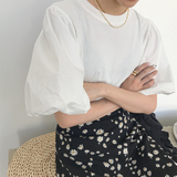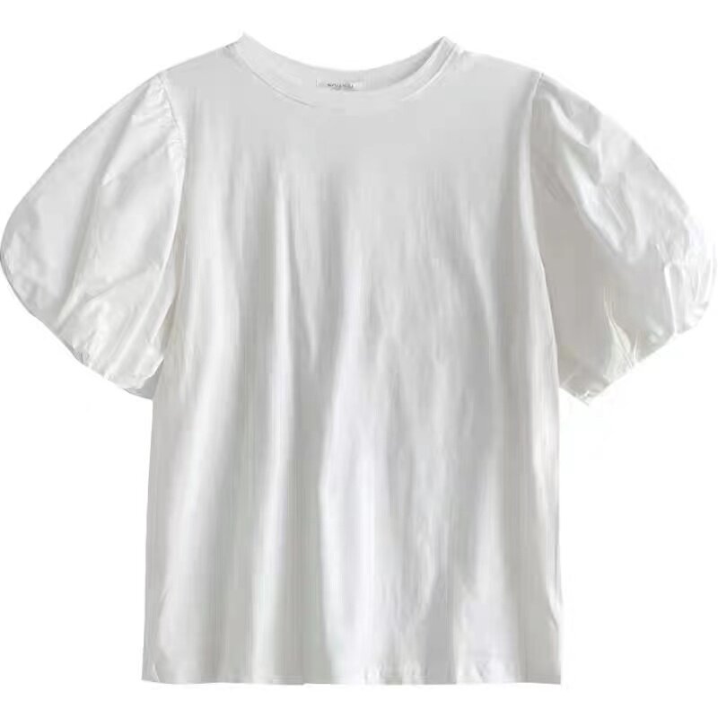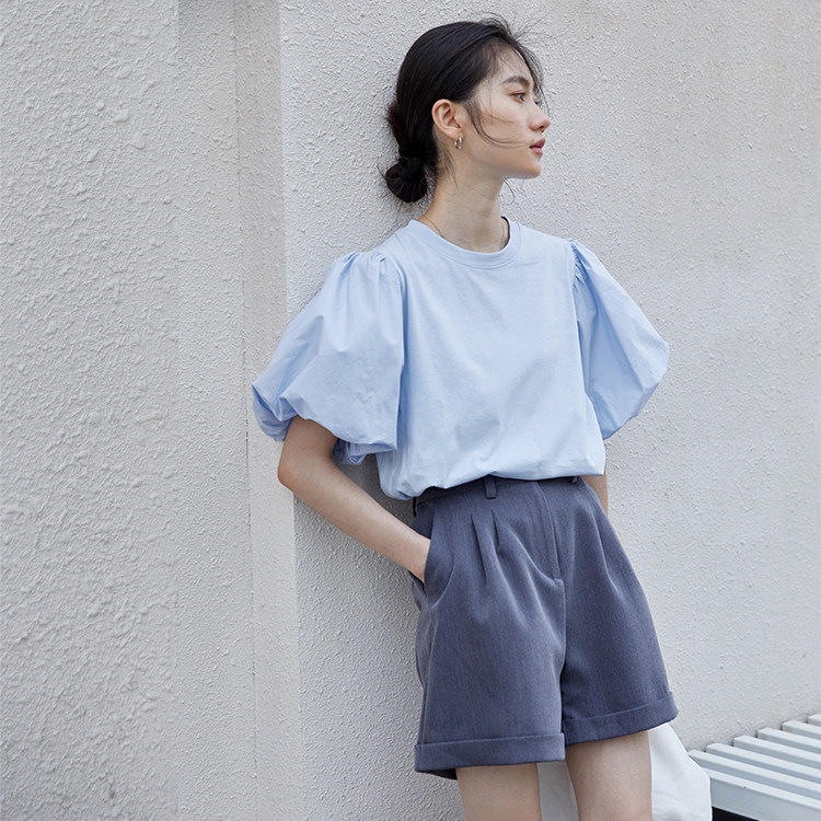 Осенняя синяя дизайнерская свежая весенняя брендовая футболка, тренд сезона, рукава фонарики, в корейском стиле
