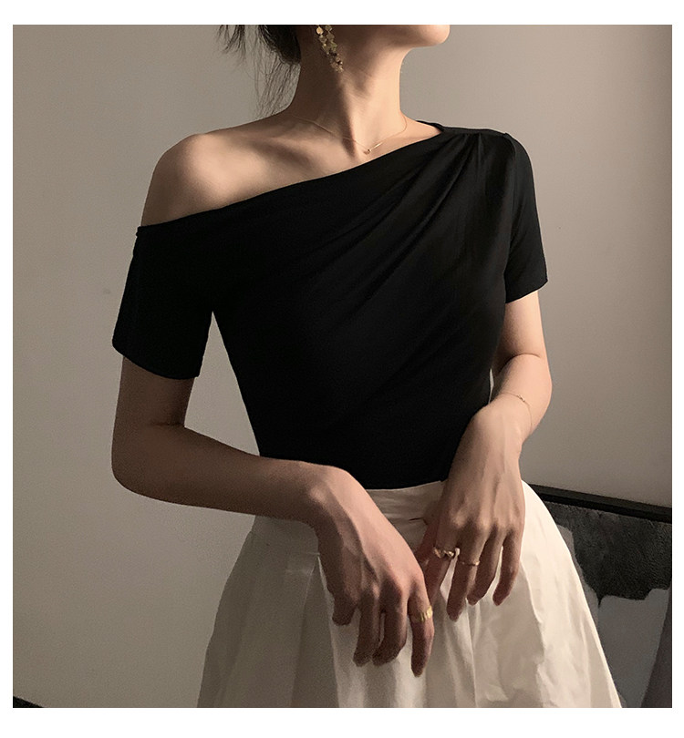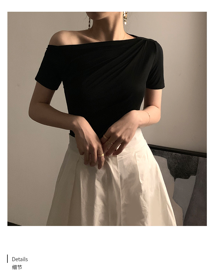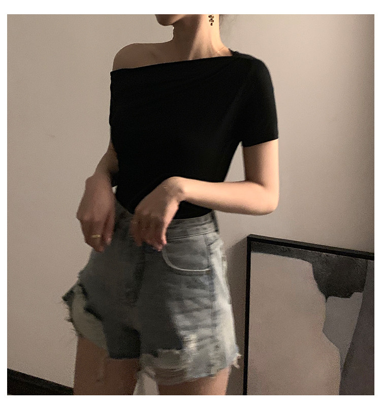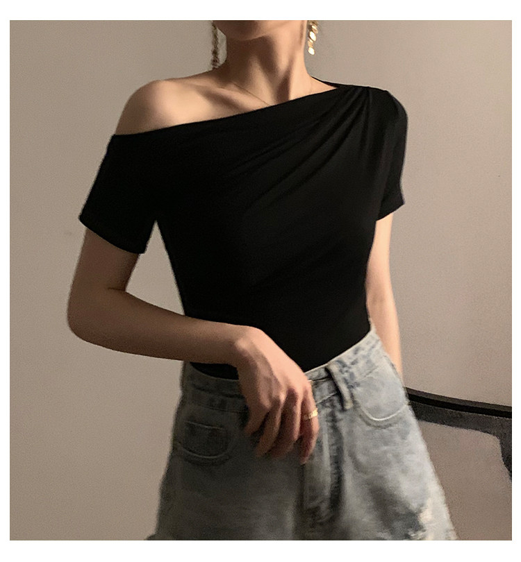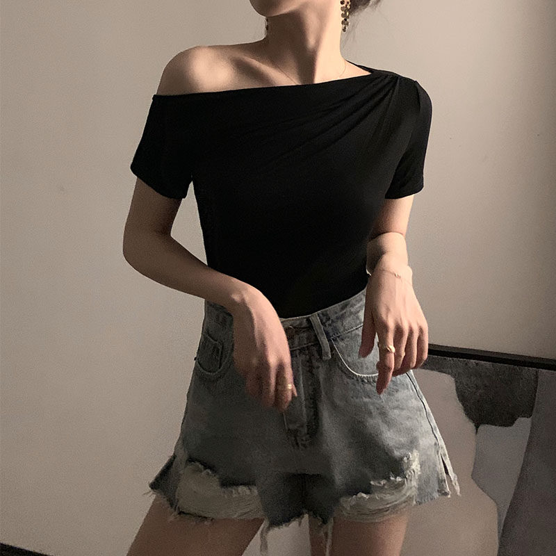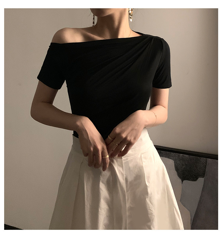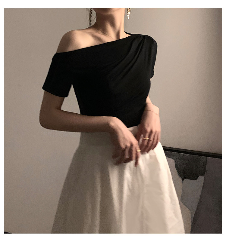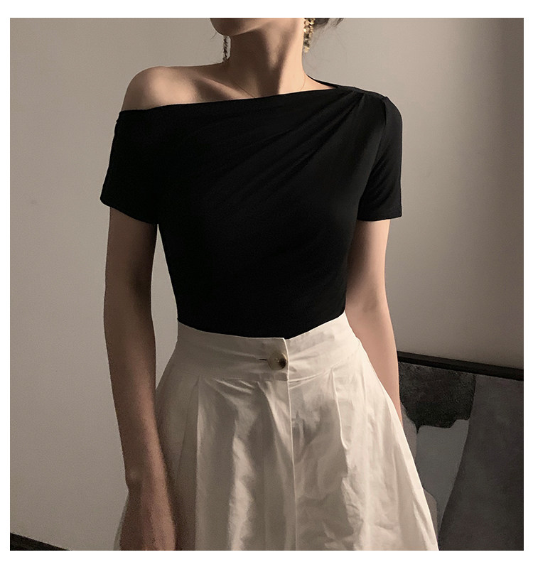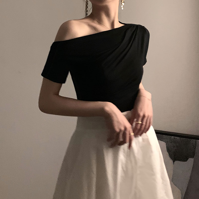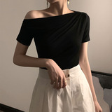 Черная брендовая базовая приятная телу футболка с коротким рукавом, открытые плечи, высокий воротник