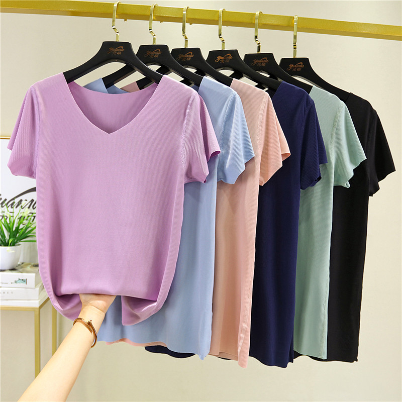 Летняя тонкая шелковая приталенная базовая приятная телу футболка, V-образный вырез