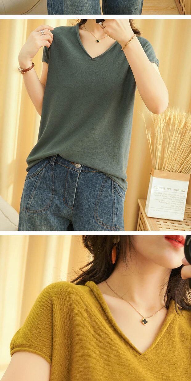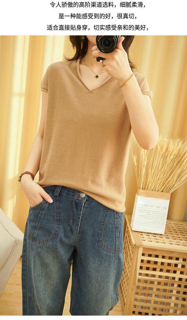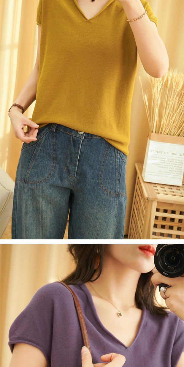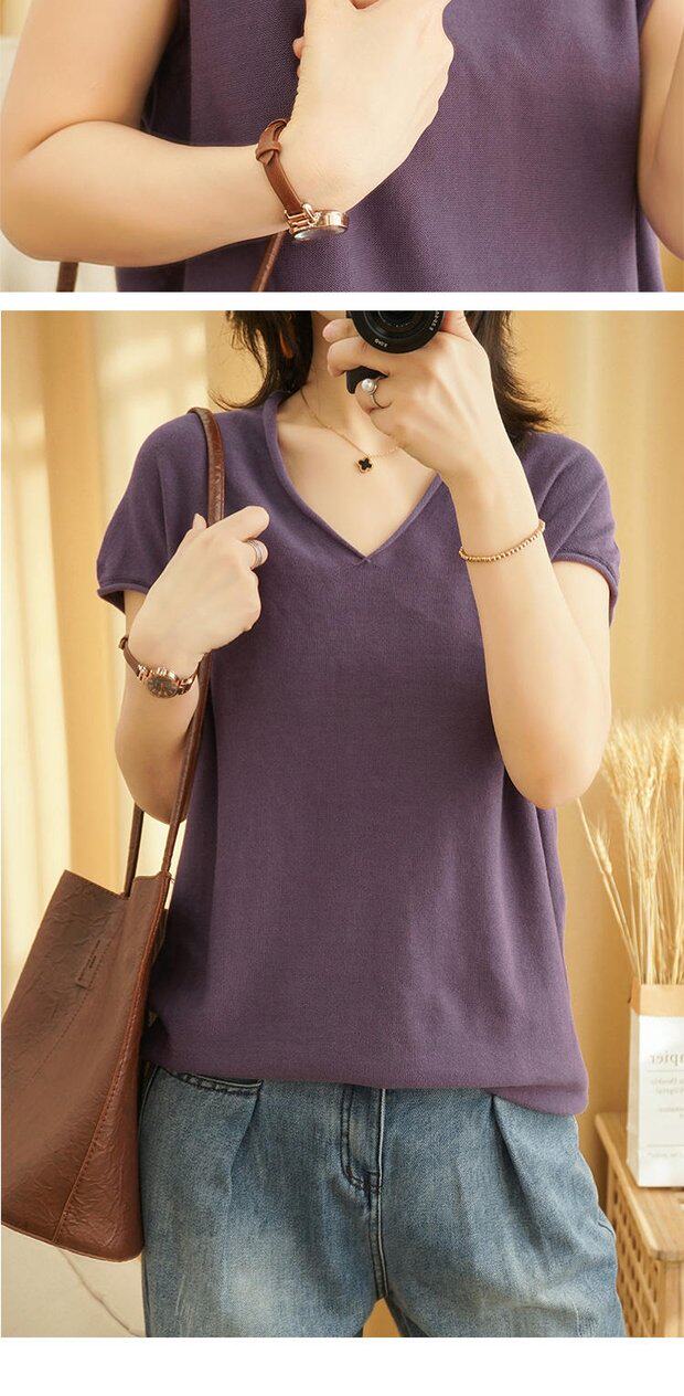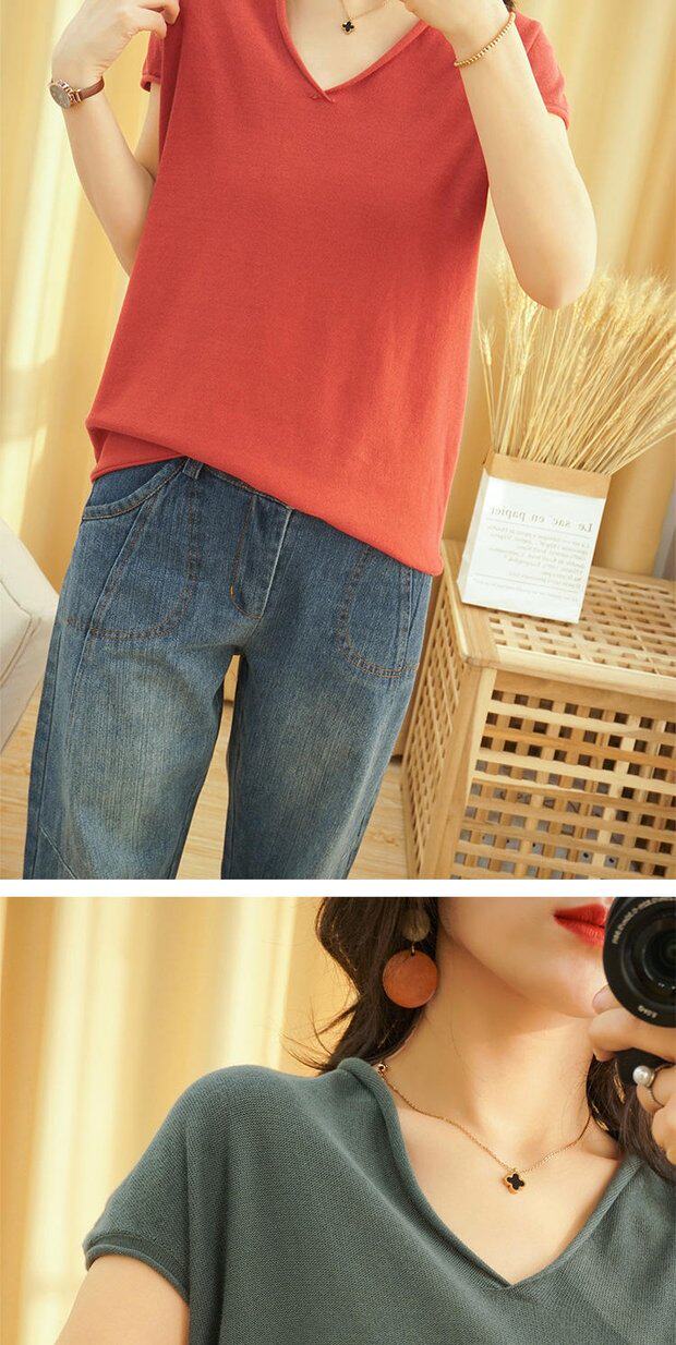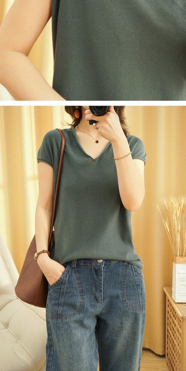 Футболка, трикотажный летний свитер для отдыха, коллекция 2022, из хлопка и льна, V-образный вырез, короткий рукав, свободный крой
