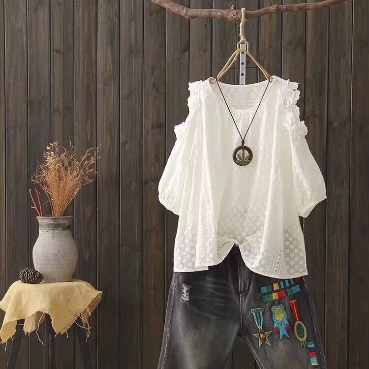 Белая летняя футболка, хлопковый фонарь, из хлопка и льна, с вышивкой, оверсайз