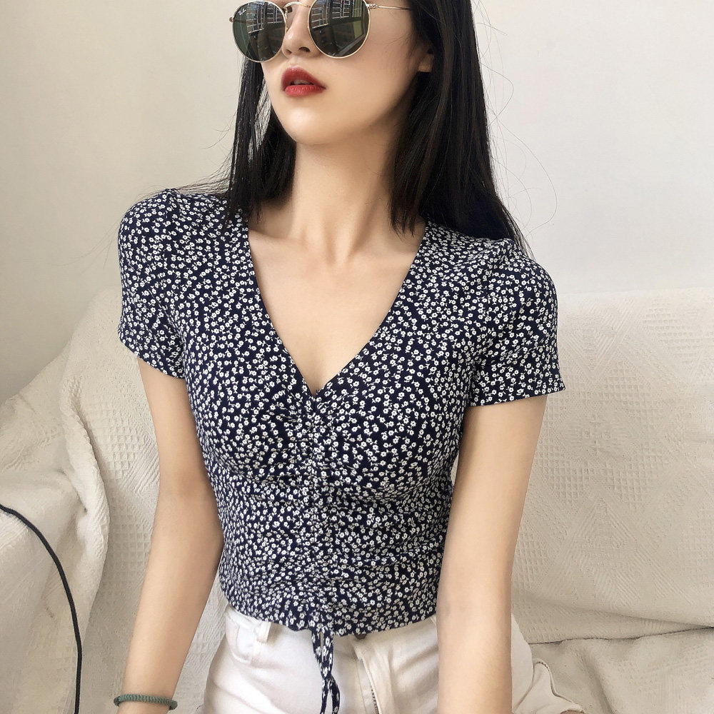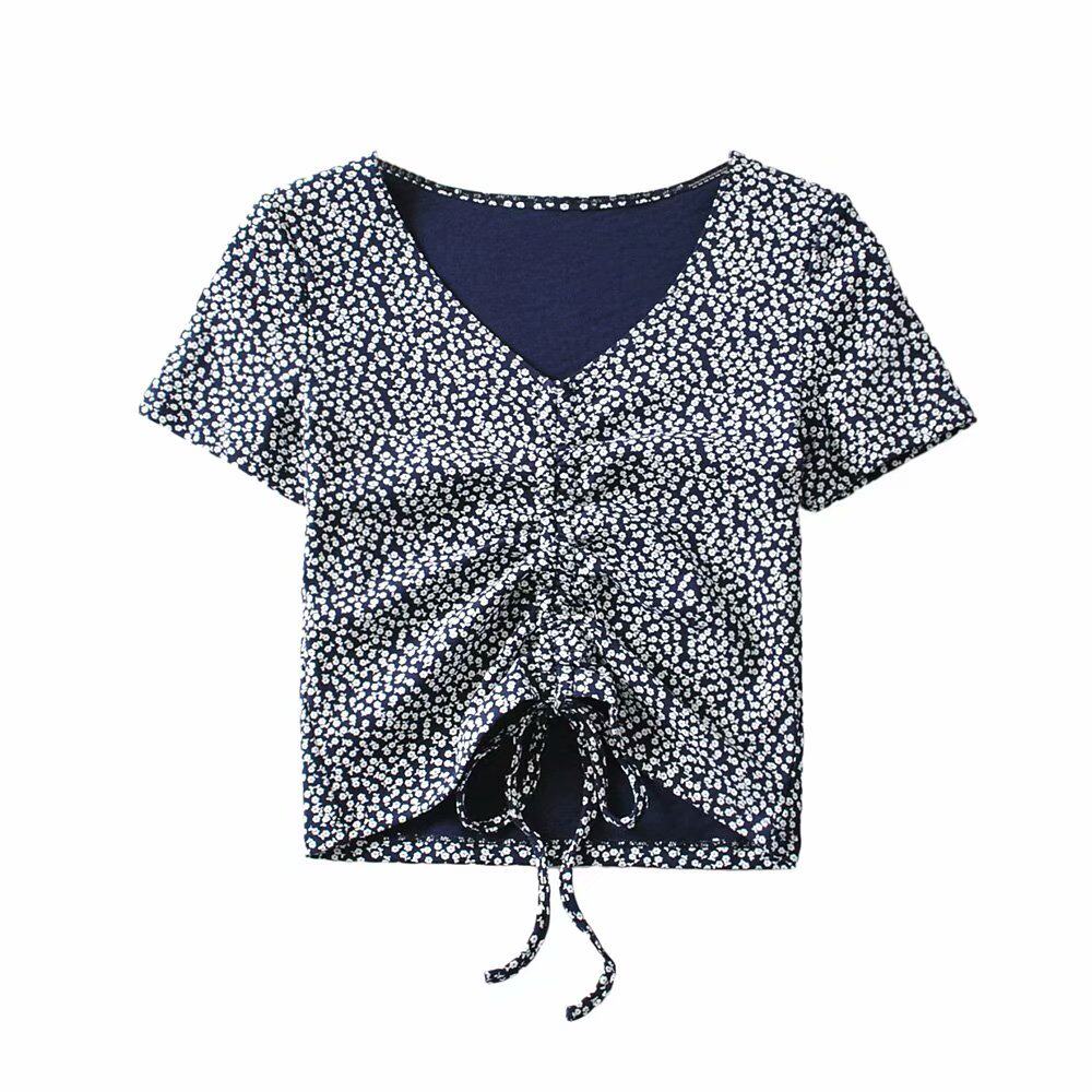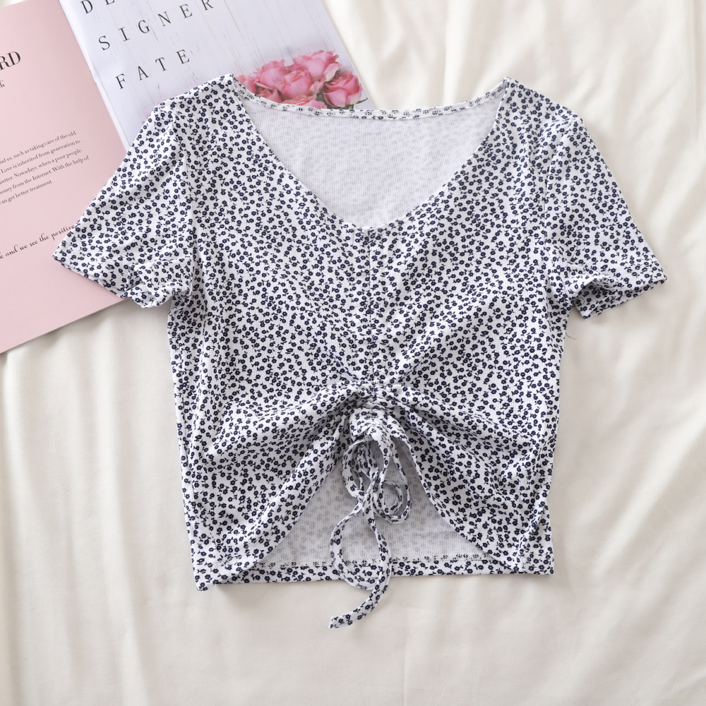 Дизайнерская короткая футболка, тренд сезона, V-образный вырез, высокая талия, на шнурках, цветочный принт