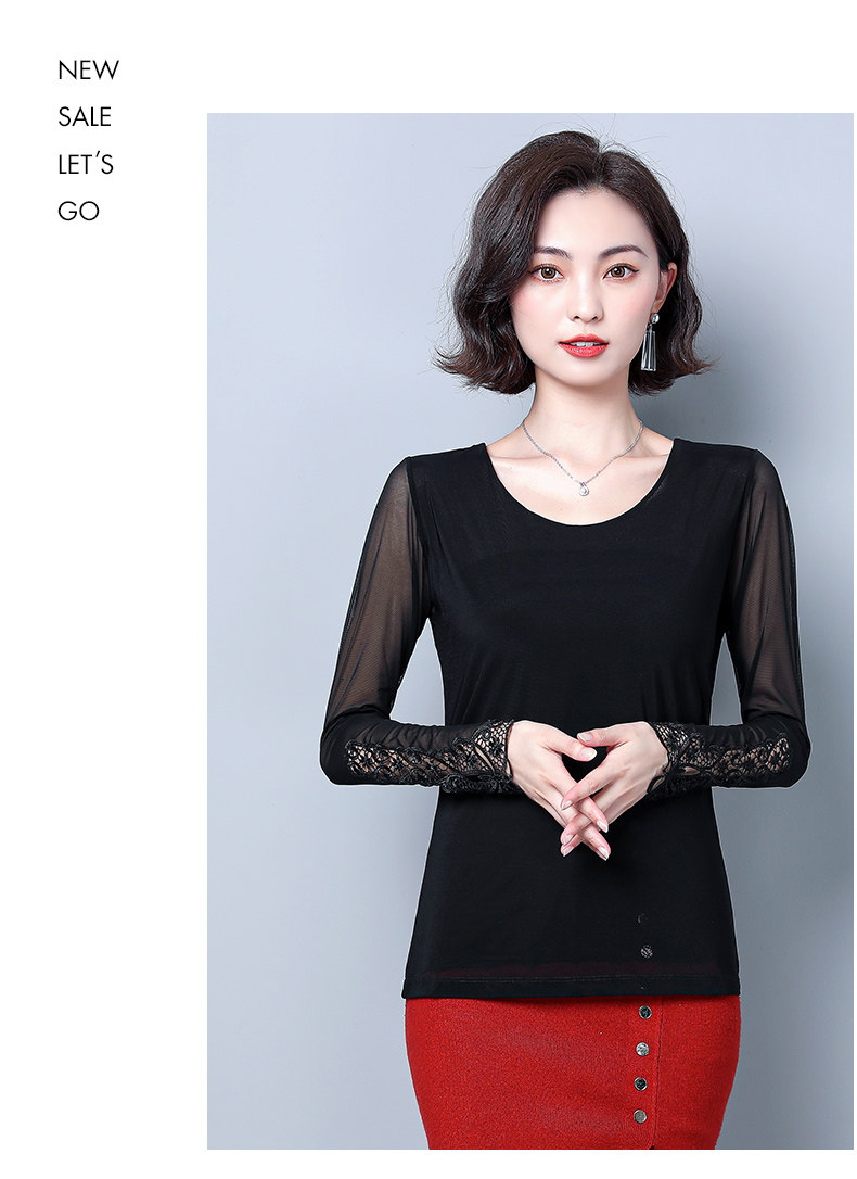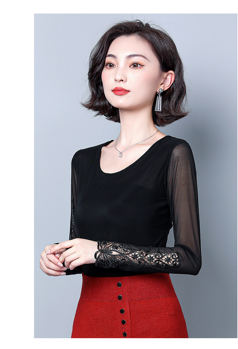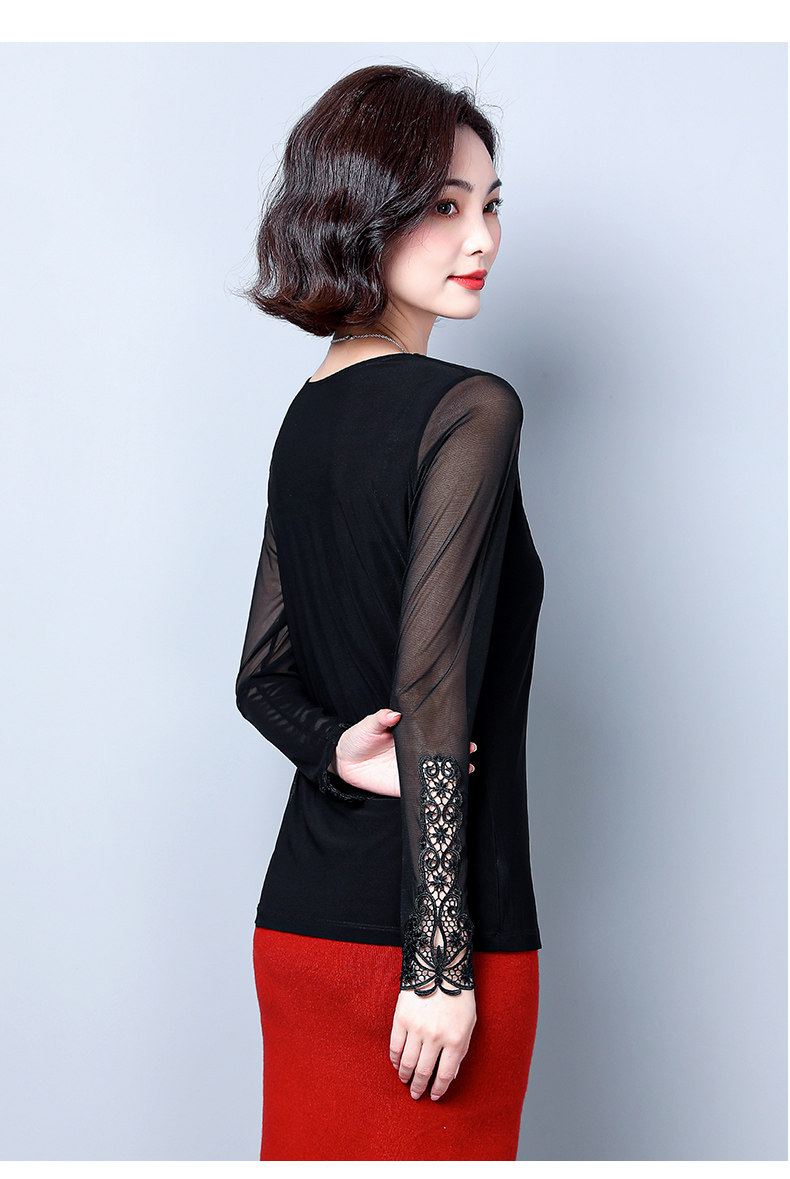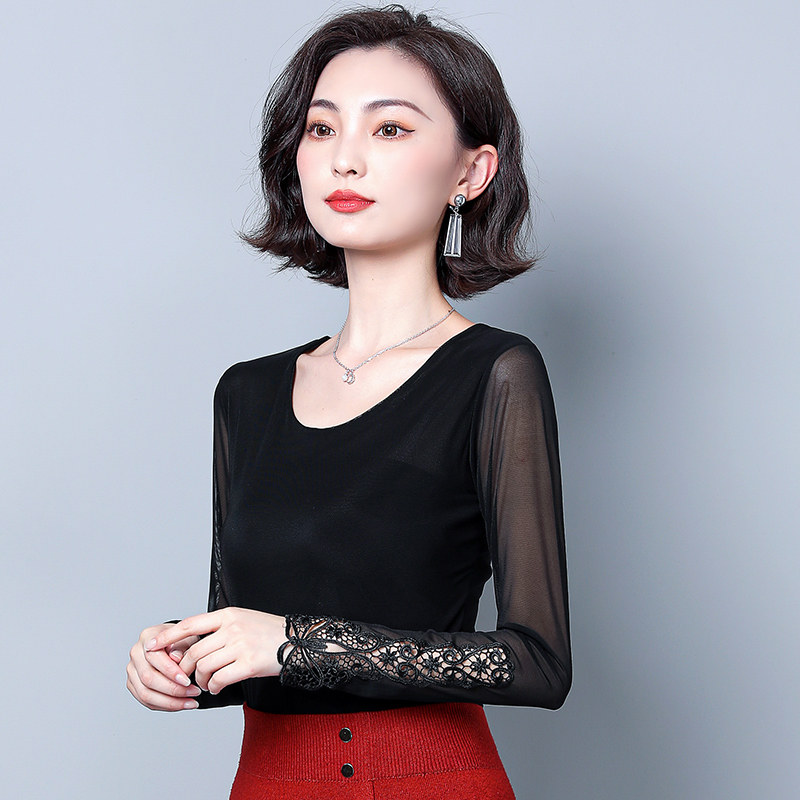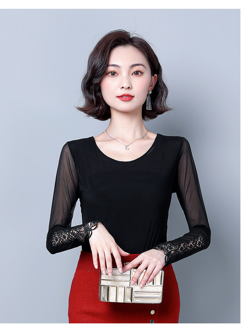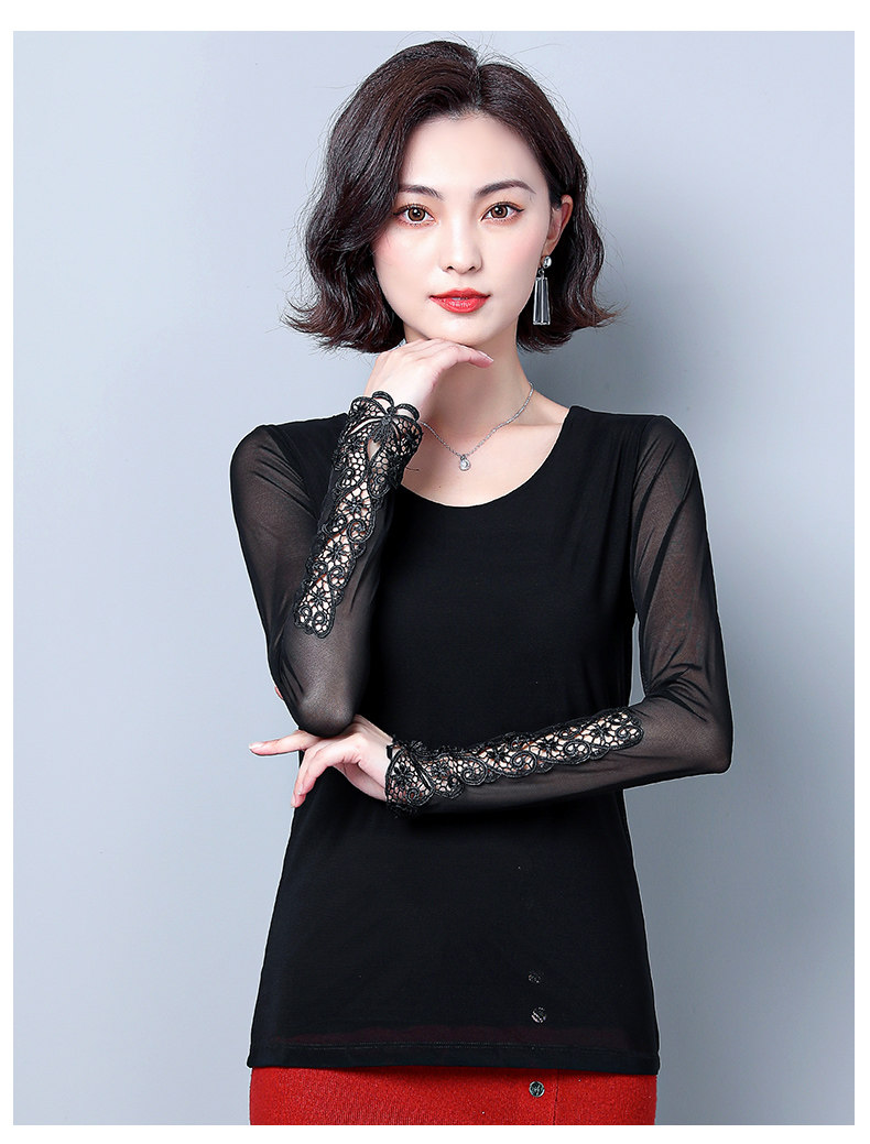 Кружевной шелковый приятный телу приталенный черный лонгслив с круглым воротником, в западном стиле