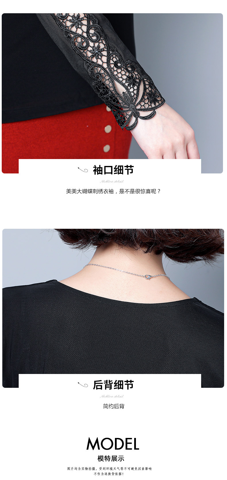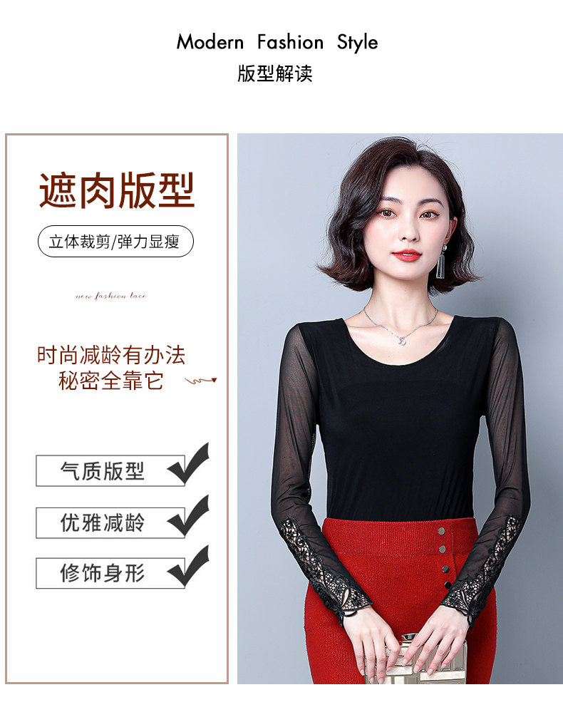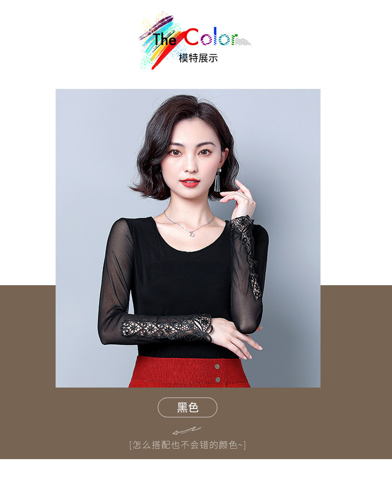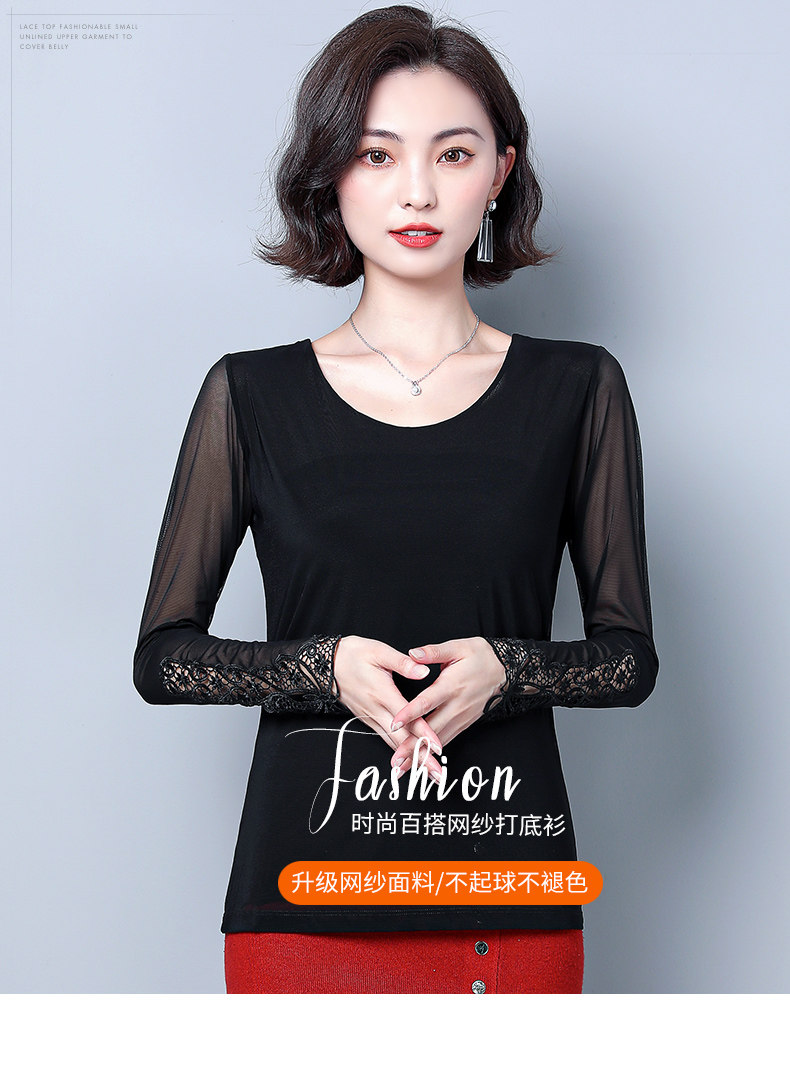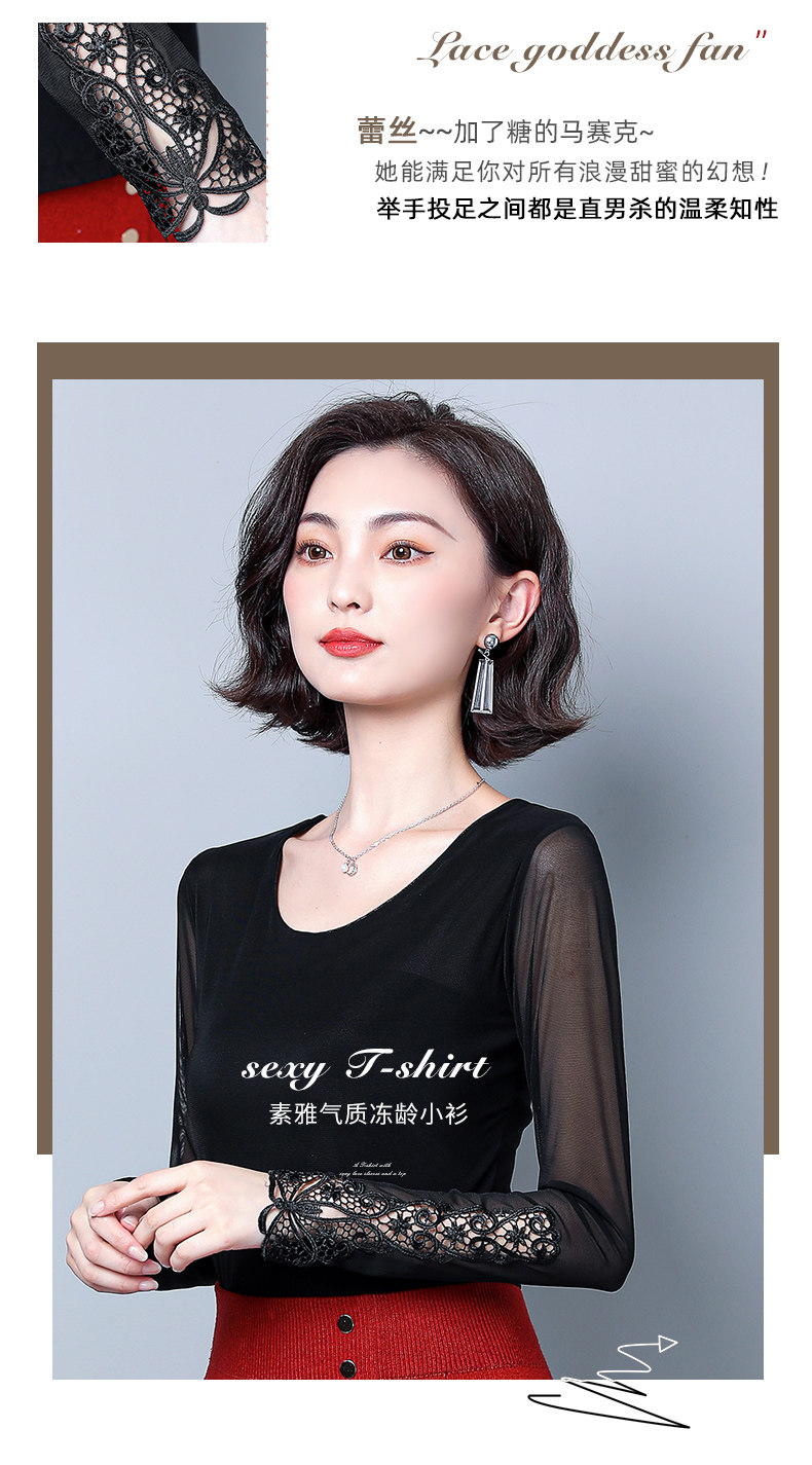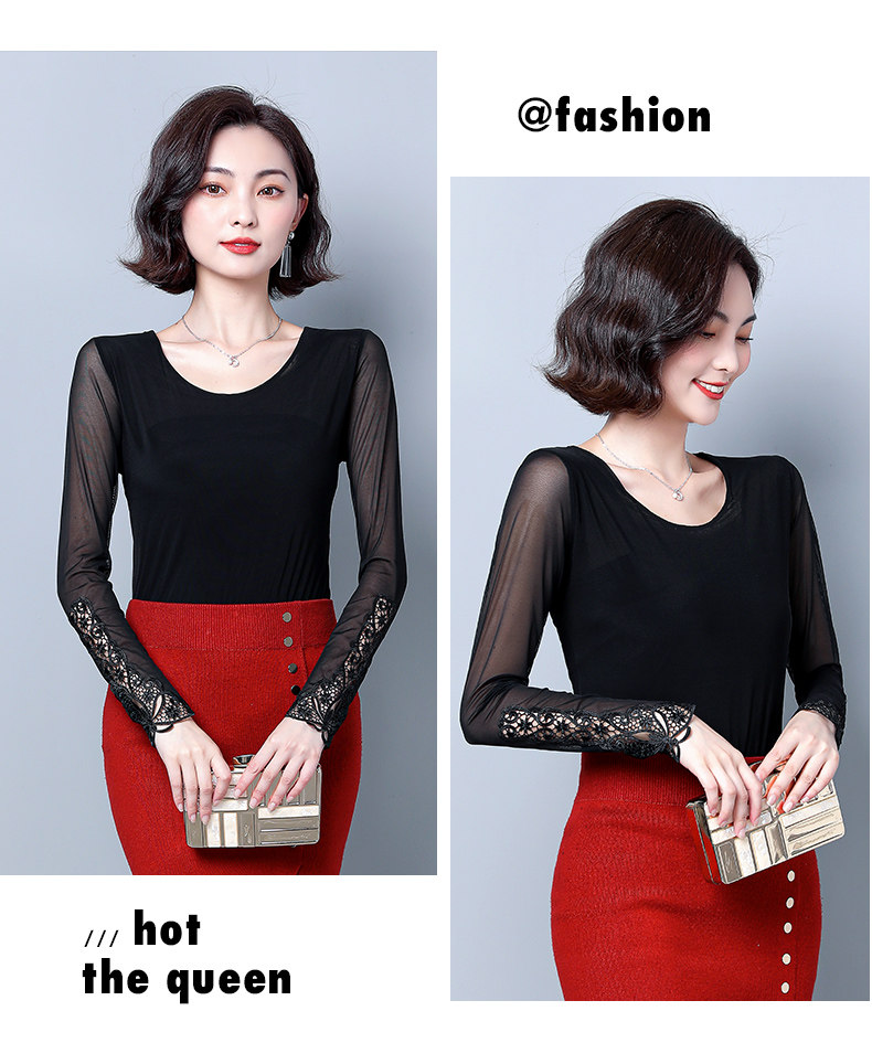 Кружевной шелковый приятный телу приталенный черный лонгслив с круглым воротником, в западном стиле