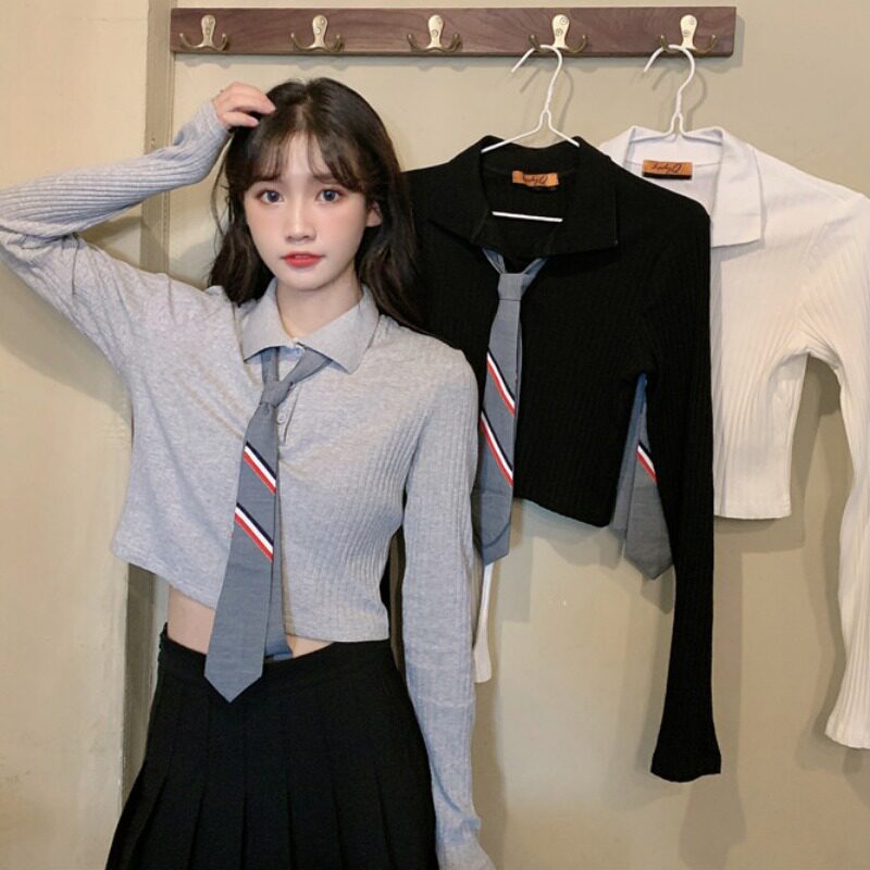 Летний милый лонгслив, галстук, универсальная футболка для школьников и студентов, коллекция 2021, воротник поло, облегающий крой