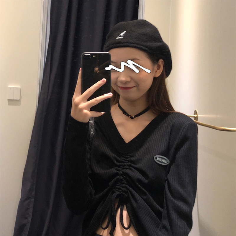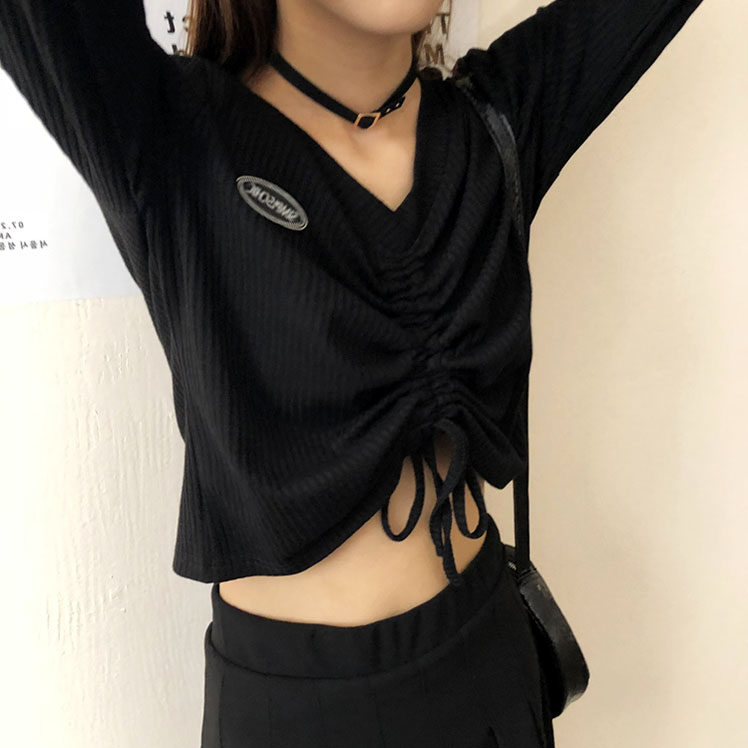 Брендовый осенний дизайнерский короткий лонгслив, высокая талия, в корейском стиле, тренд сезона, V-образный вырез, на шнурках