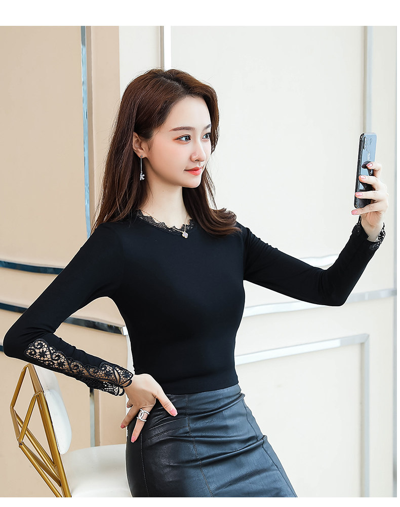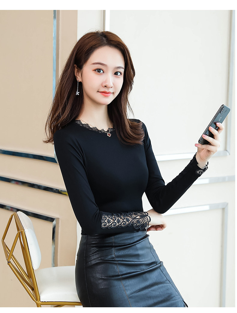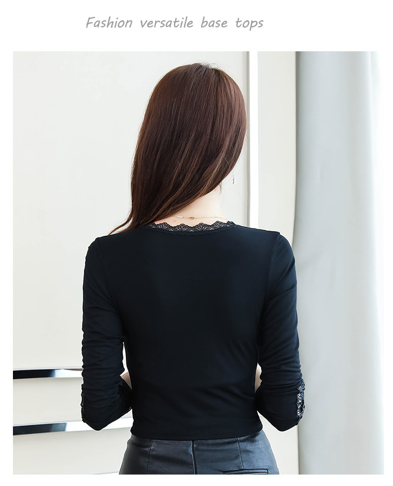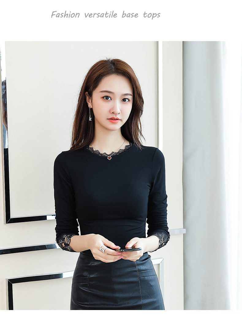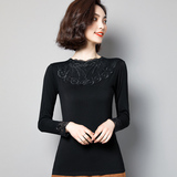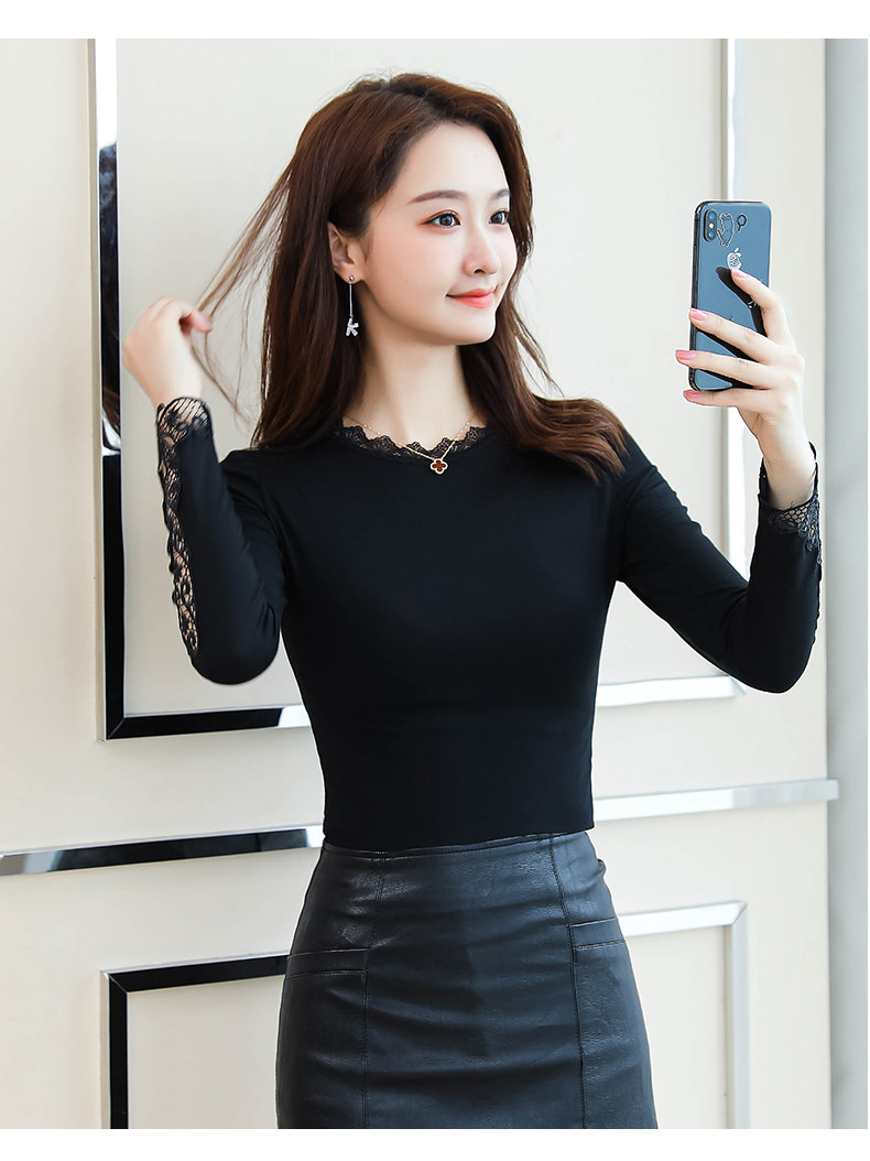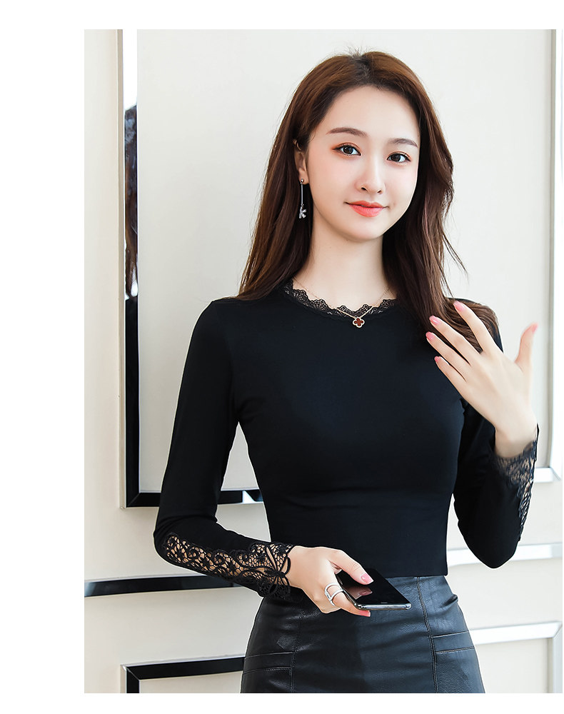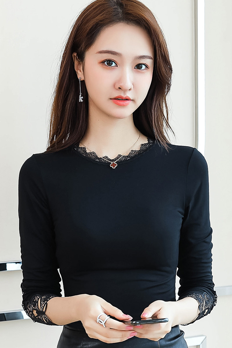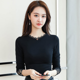 Тонкий базовый приятный телу осенний черный кружевной лонгслив, в западном стиле