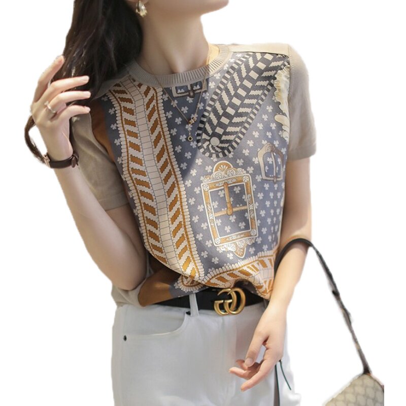 Шелковая трикотажная весенняя футболка, европейский стиль, коллекция 2021, городской стиль, короткий рукав