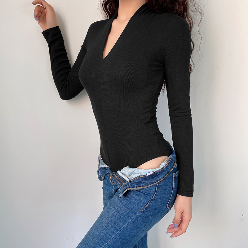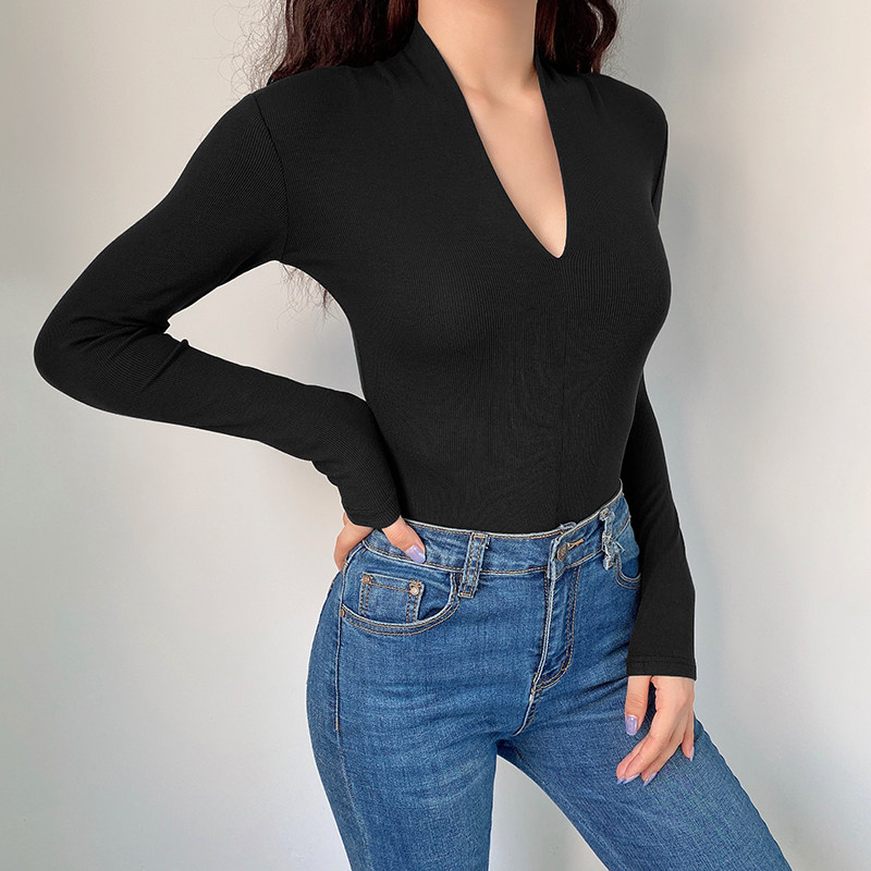 Базовое трикотажное приталенное боди, базовый приятный телу брендовый лонгслив, в обтяжку, V-образный вырез