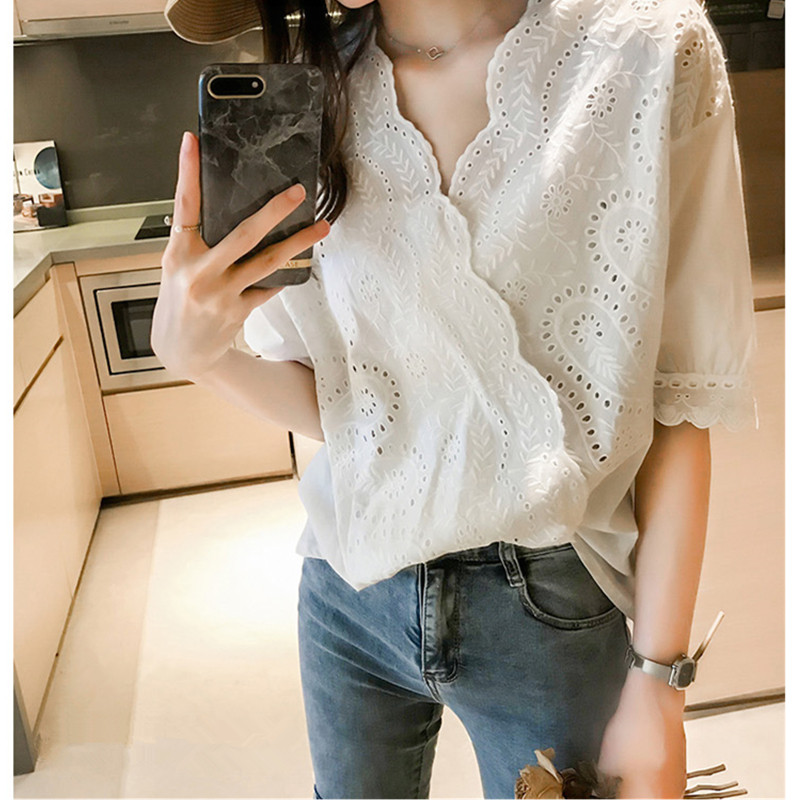 Кружевная летняя одежда, футболка, большой размер, оверсайз, подходит для полных девушек, V-образный вырез
