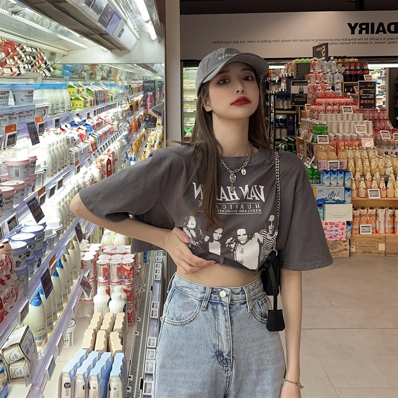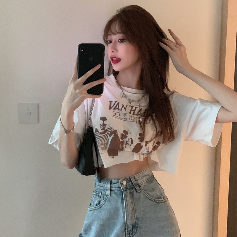Tide, сексуальная короткая футболка с коротким рукавом, свободный крой, высокая талия