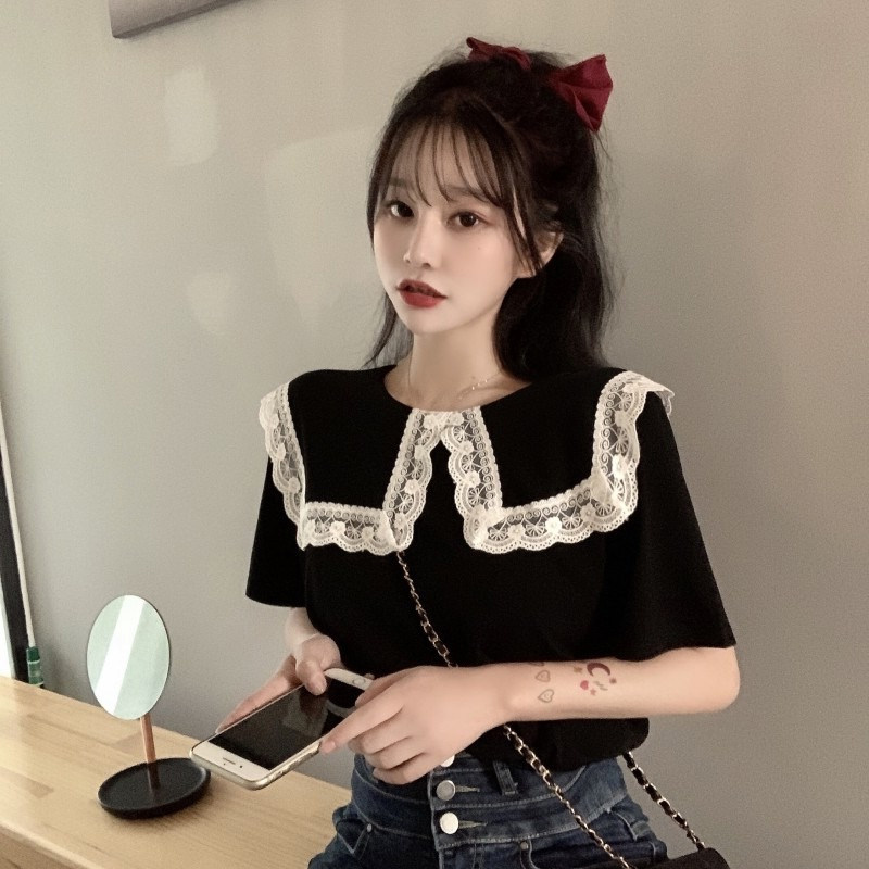 Футболка с коротким рукавом, сексуальная кружевная кукла, большой размер, французский стиль, кукольный воротник