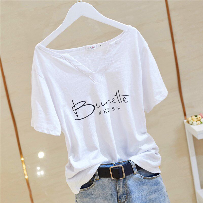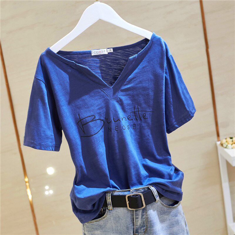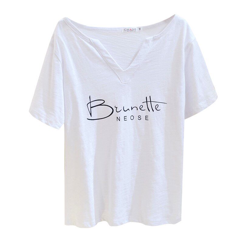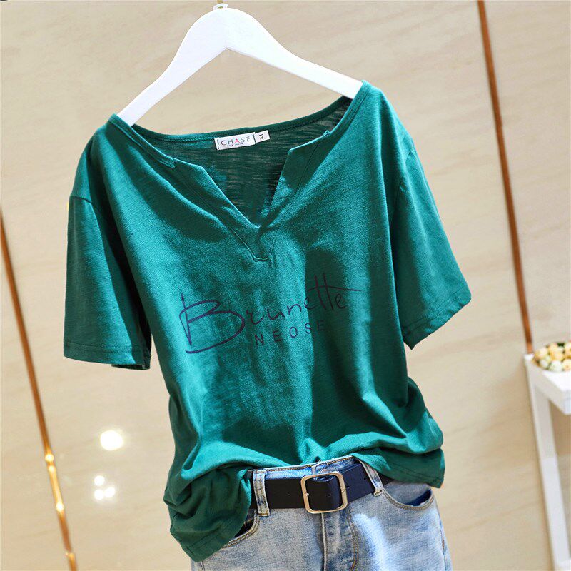Женская футболка из чистого хлопка с короткими рукавами, лето 2020, новый стиль, свободный стиль из бамбукового хлопка, большой размер, с половиной рукавов, с V-образным вырезом, однотонный модный топ