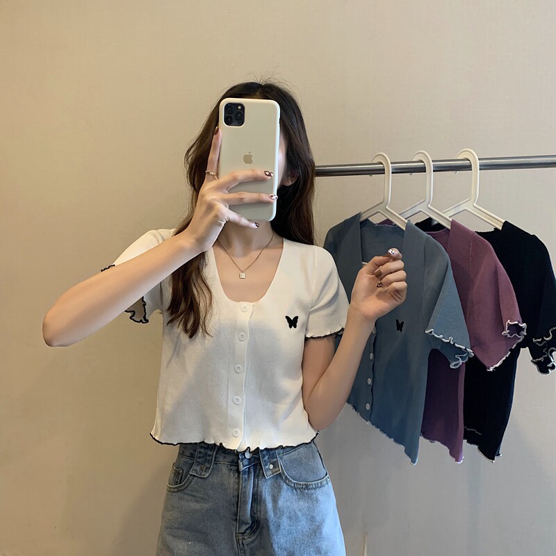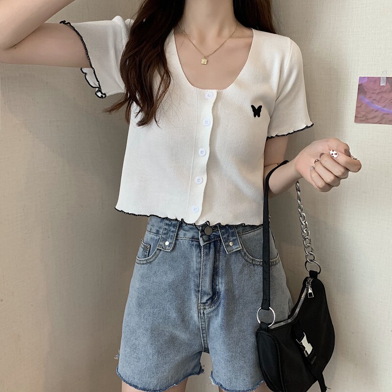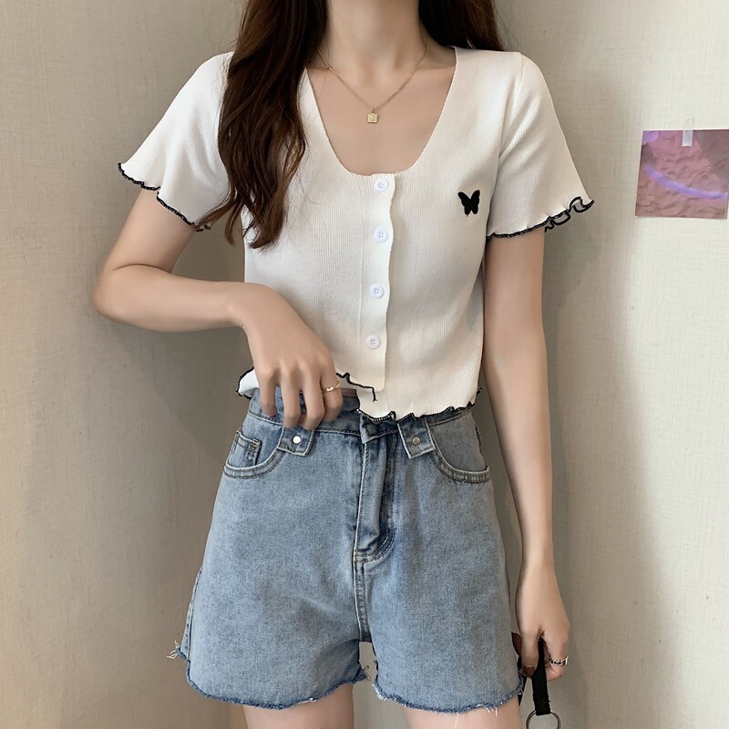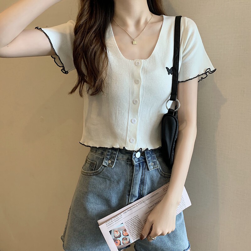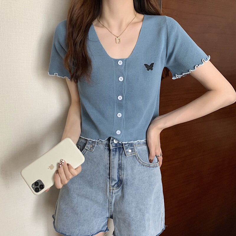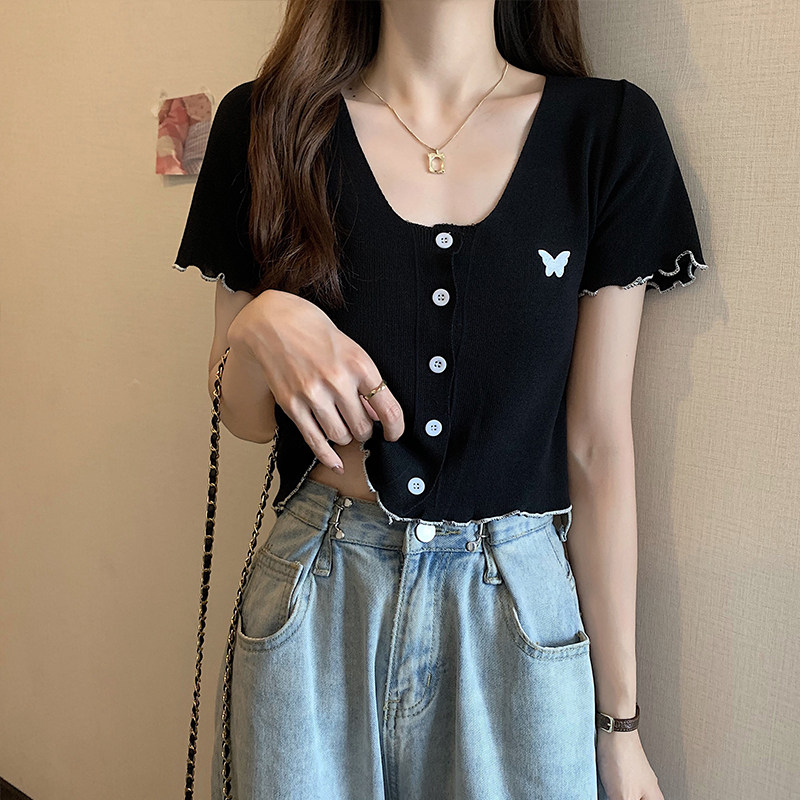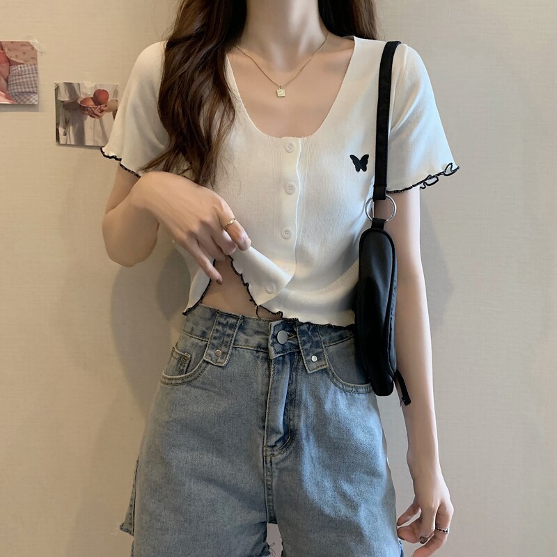 Летняя короткая летняя одежда для школьников и студентов, трикотажная футболка с коротким рукавом, 2021 года, V-образный вырез, высокая талия, в стиле Шанель
