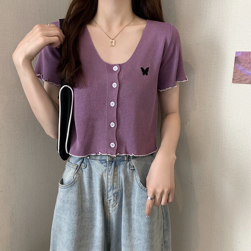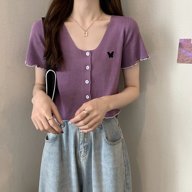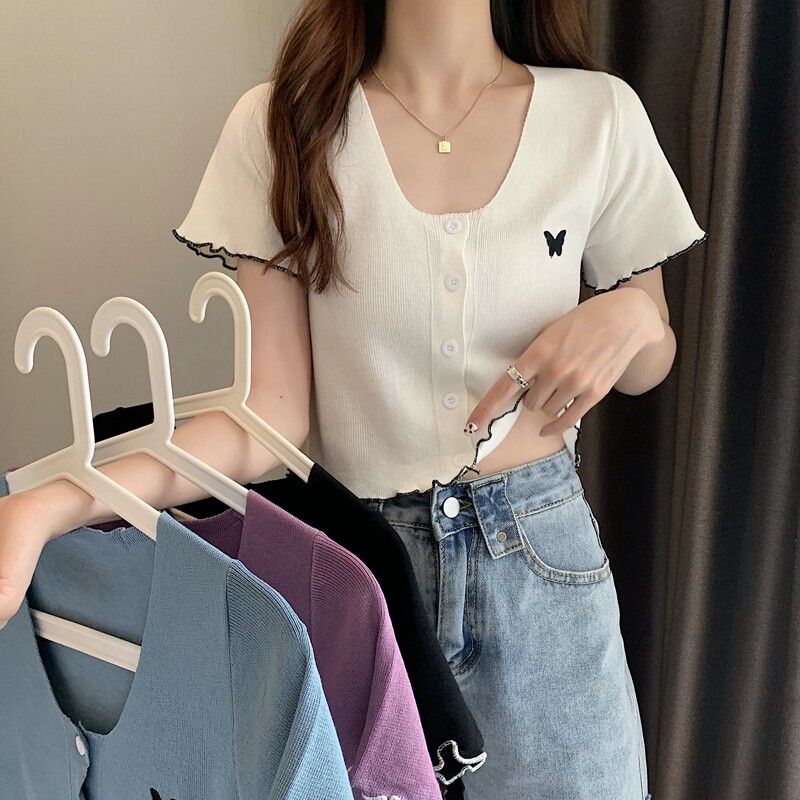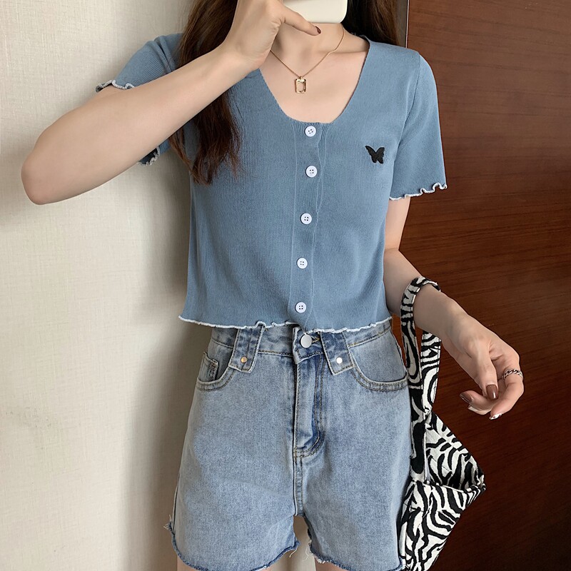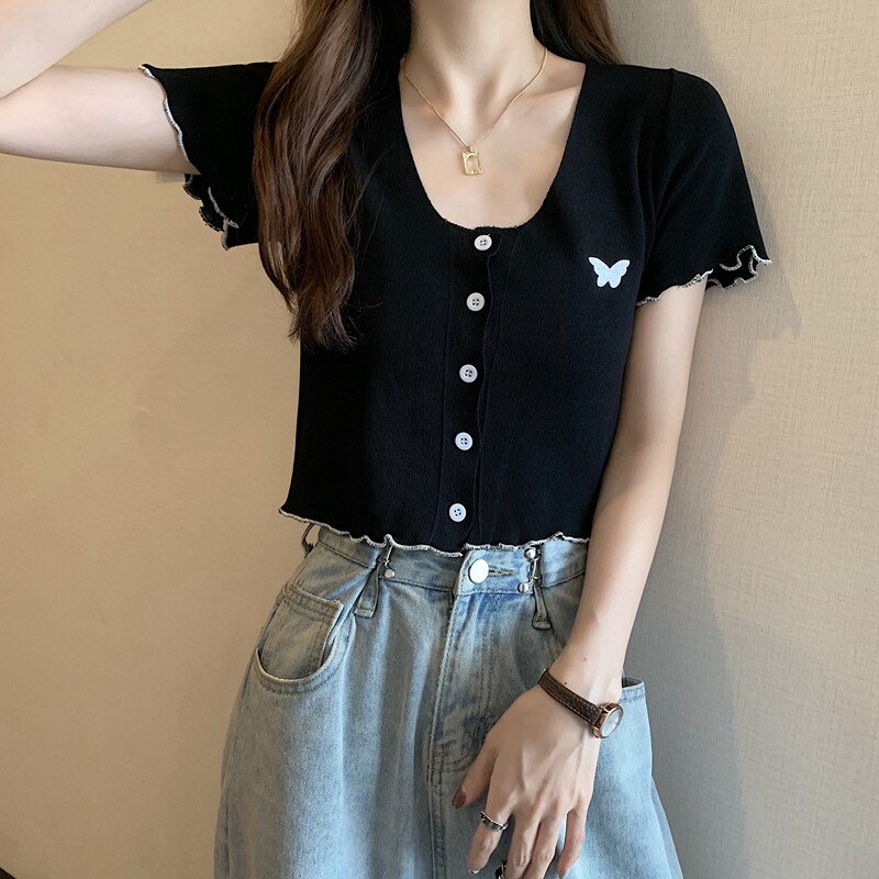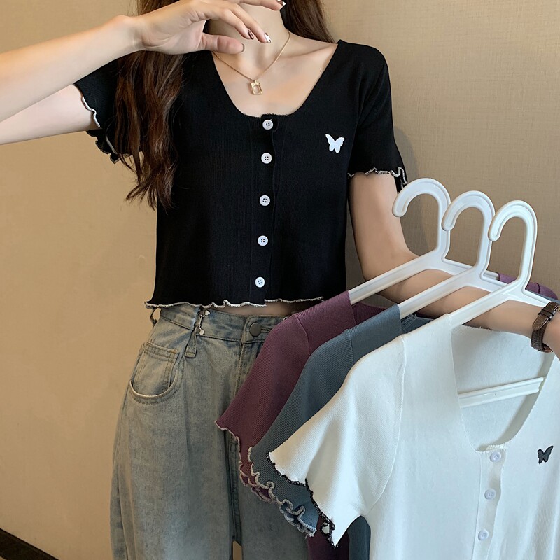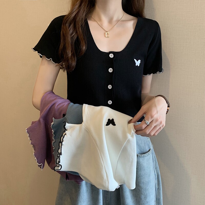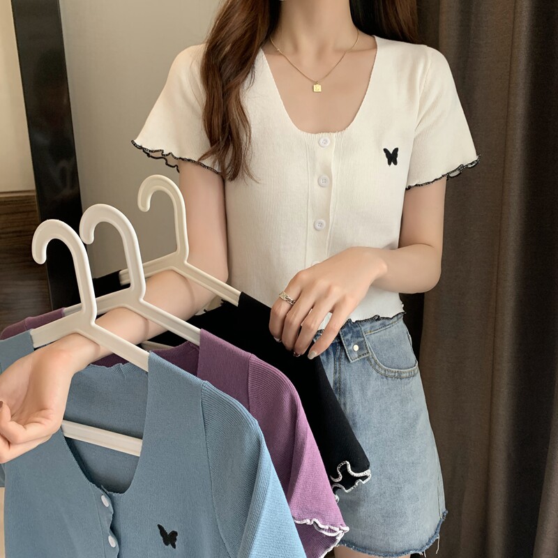 Летняя короткая летняя одежда для школьников и студентов, трикотажная футболка с коротким рукавом, 2021 года, V-образный вырез, высокая талия, в стиле Шанель